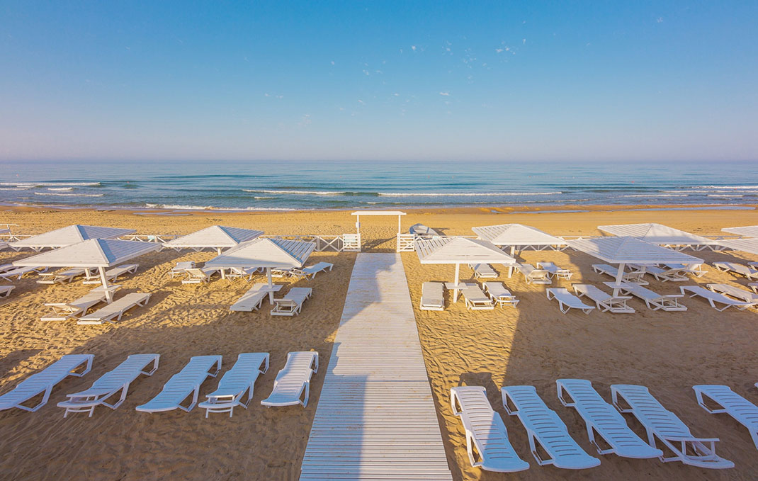 Рядом раскинулся широкий пляж. На нем есть шезлонги и зонты, а также раздевалки, что делает отдых здесь максимально комфортным. Вдобавок, пляж окружен красивыми песчаными дюнами.