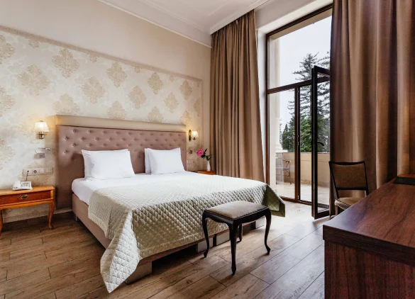 Отель расположен в отреставрированном здание Санатория 17 съезда ЦК? в стиле «сталинский ампир». Историческая архитектура гармонично сочетается с роскошным декором. К услугам гостей крытый бассейн, пляж с бесплатными шезлонгами и зонтиками. Гости могут отдохнуть в дендропарке и на просторной террасе с панорамным видом на Черное море.