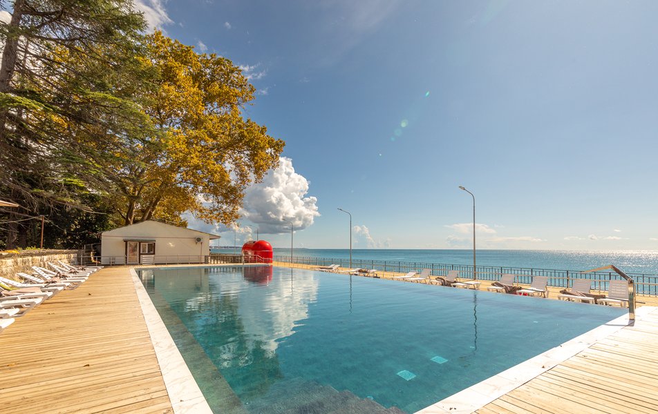 Отель находится на берегу Черного моря в городе Гагра в историческом сердце курорта. Его прекрасно оборудованный галечный пляж, рассчитан на одновременное присутствие 300 человек. Территория пляжа оснащена душевыми кабинами, лежаками, шезлонгами и зонтами, туалетами и кабинами для переодевания.