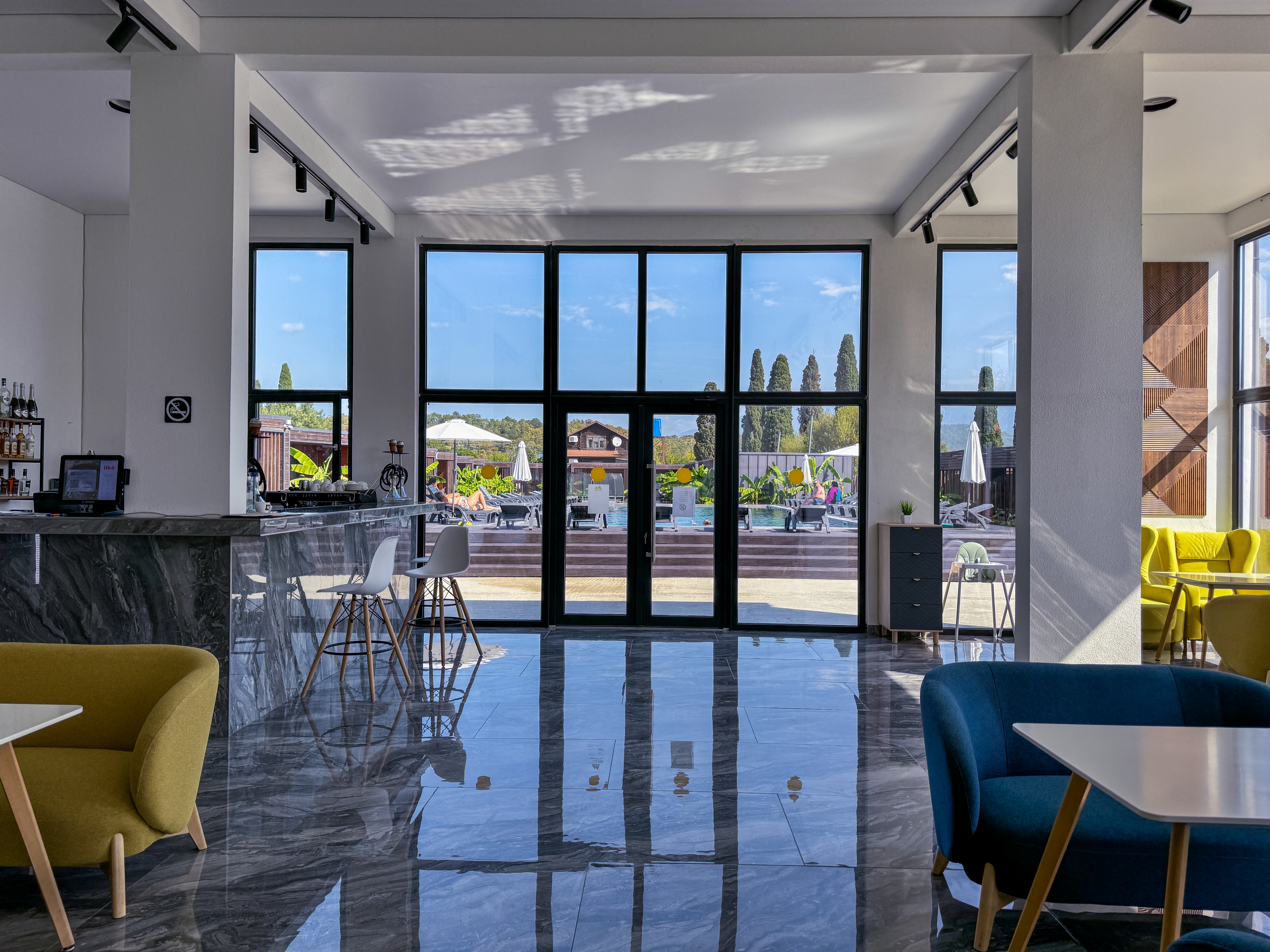 Отель “Viva Glamp” построен в 2023 году. Это гарантирует для отдыхающих свежий ремонт и безопасные условия для проживания. Гостиничный комплекс находится в 400 м от Черноморского побережья в поселке Цандрипш. Это всего 10 минут езды до Российской границы. Туристы могут рассчитывать на комфортабельные условия размещения. Для них 30 номеров разной вместительности. Жилье представлено не в корпусах, а в экодомах в стиле контемпорари. Это уютные одно- и двухкомнатные домики, предназначенные для семейного отдыха.