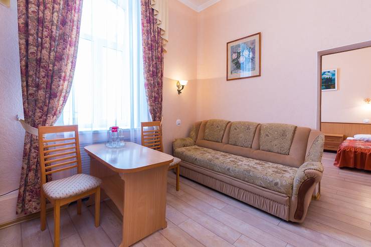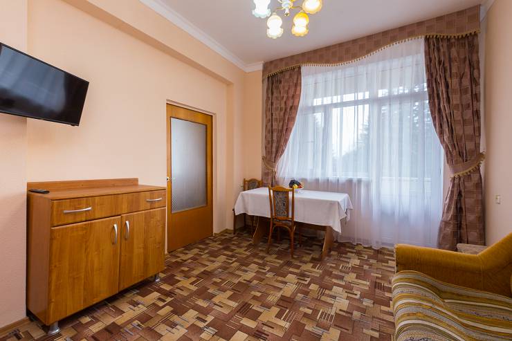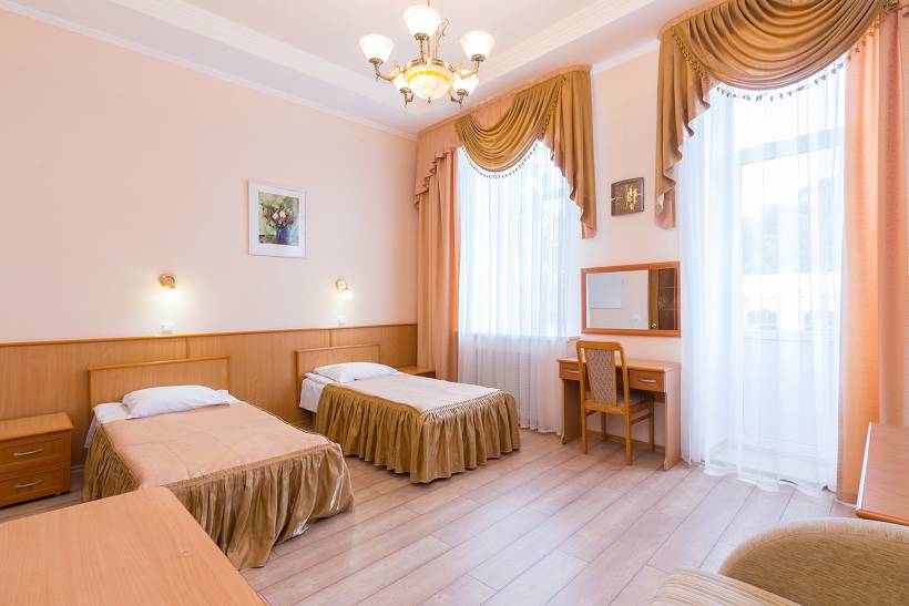 В номере: ванна, туалет, холодильник, фен, электрочайник, двуспальная или две раздельные кровати, диван