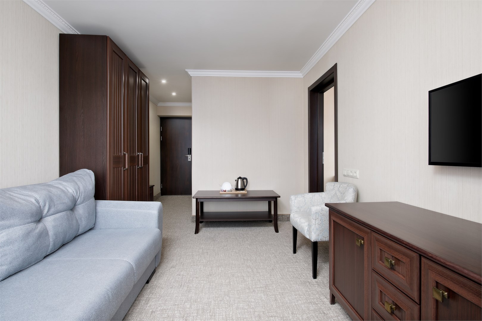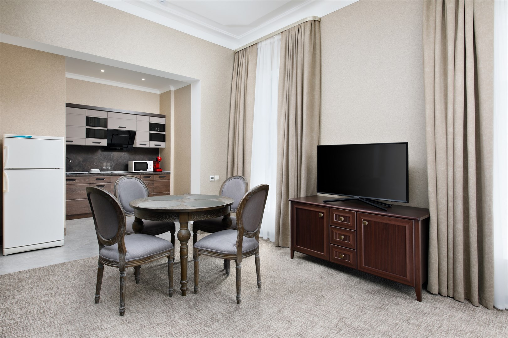 В номере: душ, туалет, ТВ, холодильник, кондиционер, сейф, фен, телефон, мини-кухня, чайная станция, электрочайник, СВЧ-печь, двуспальная кровать, диван, кресло, балкон