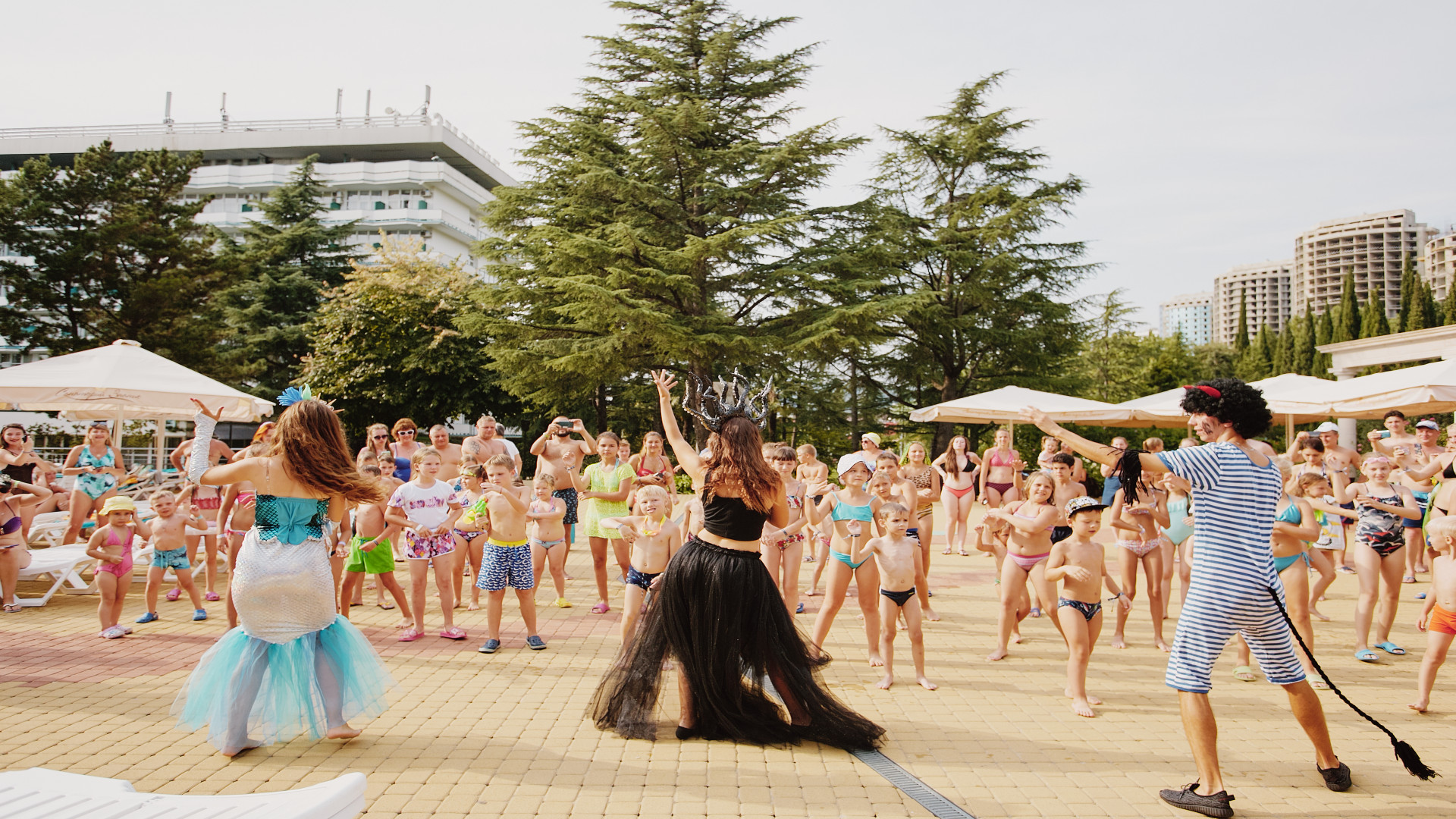 Детям: детская анимация, детский бассейн (детская зона с глубиной 50 см), детская комната (игровая комната «Знаюшка» с множеством игрушек), детская площадка, детские кроватки