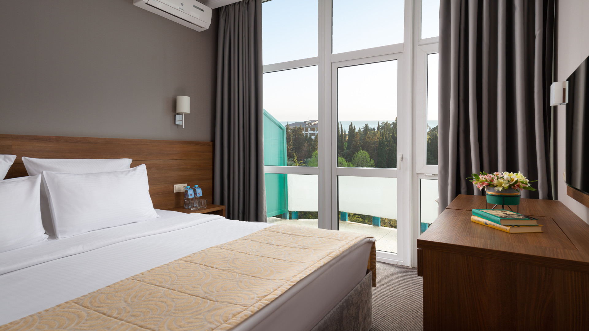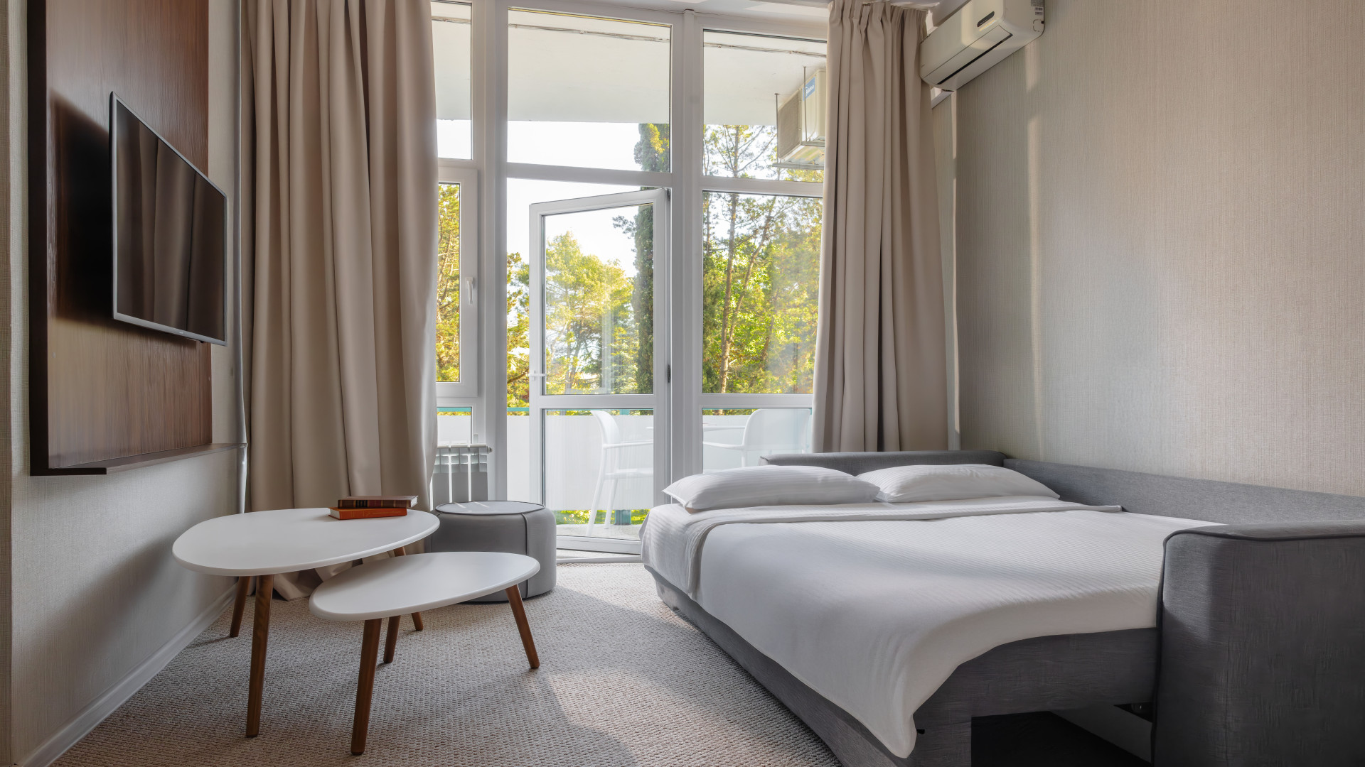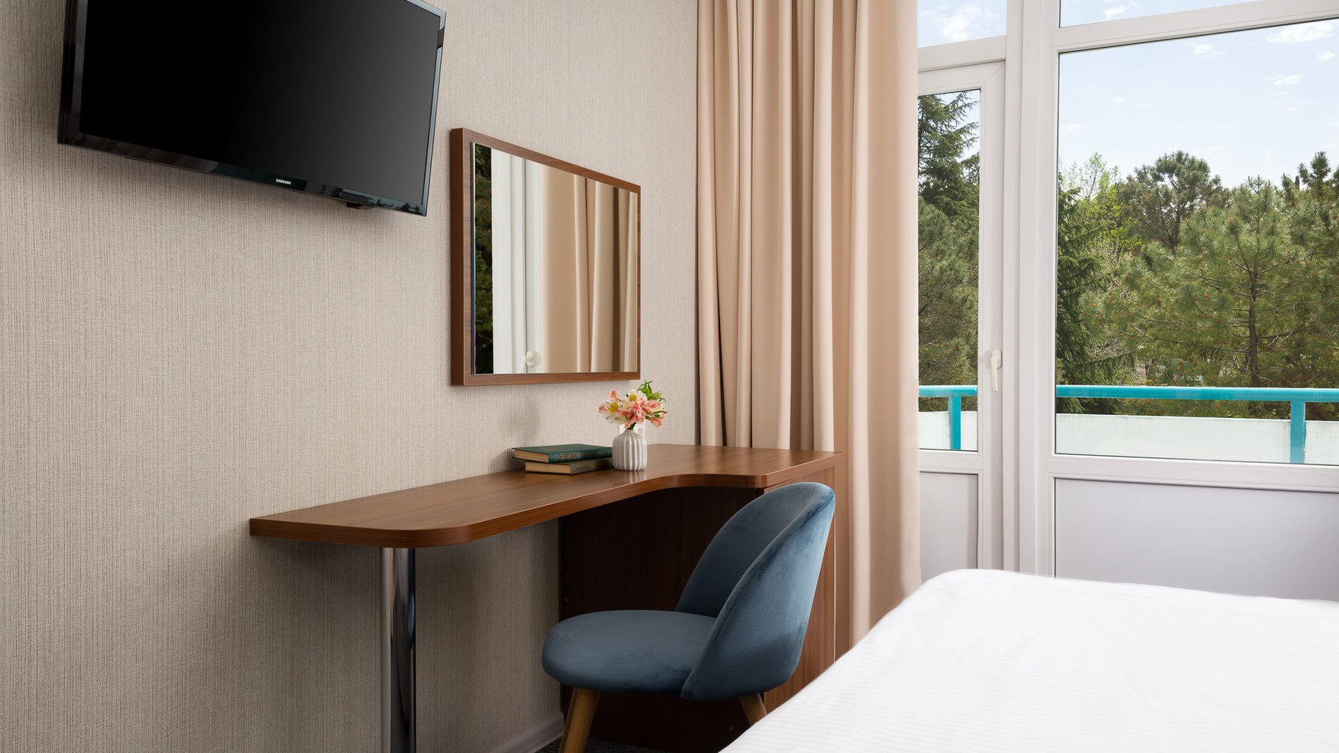 Каждый номер санатория оснащен современной мебелью и необходимой техникой, обеспечивая комфортное проживание на протяжении всего отдыха.