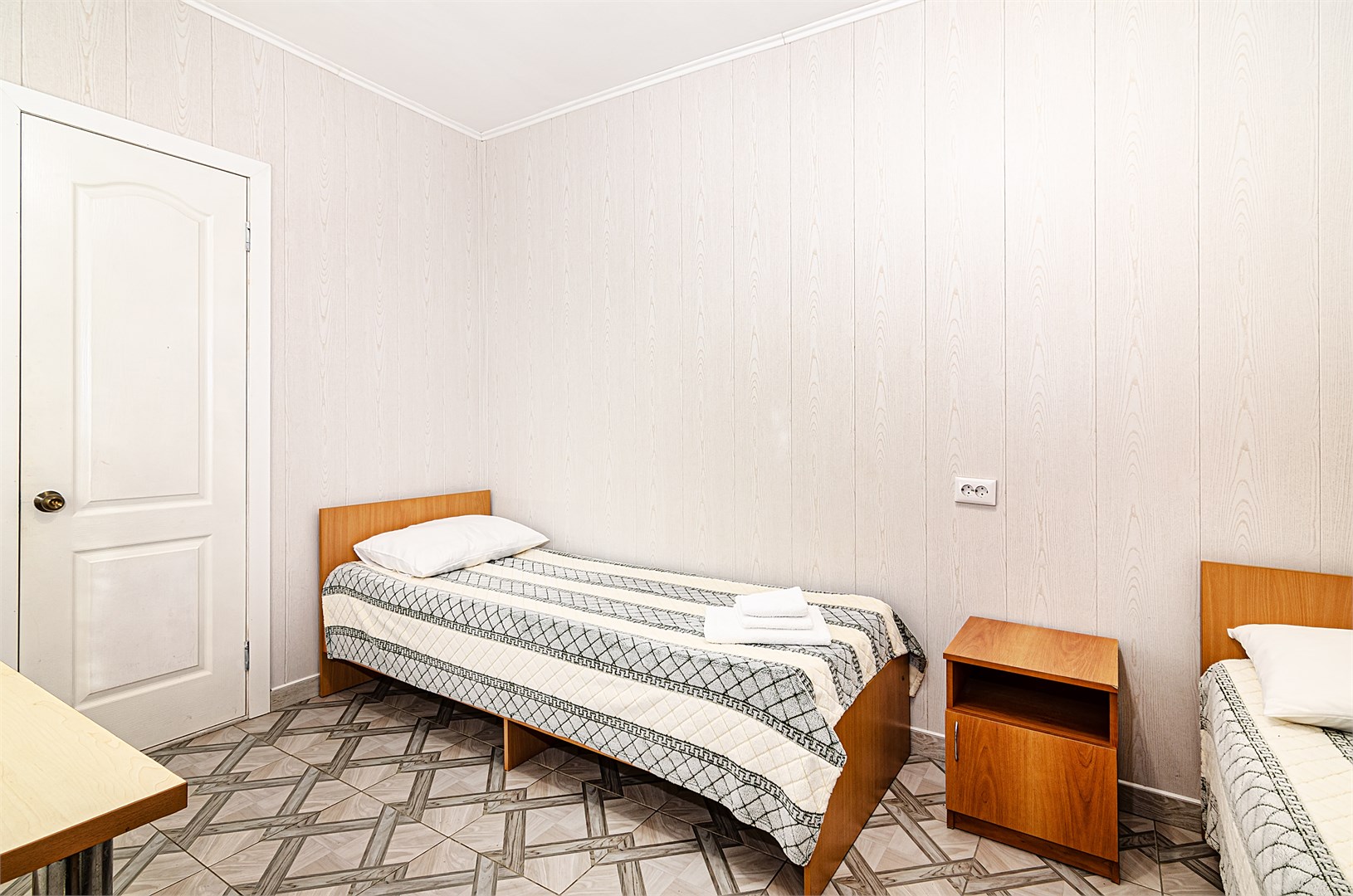 В номере: душ, туалет, ТВ, холодильник, кондиционер, односпальная кровать, две раздельные кровати. Трехместный номер категории "Эконом" в спокойных тонах.