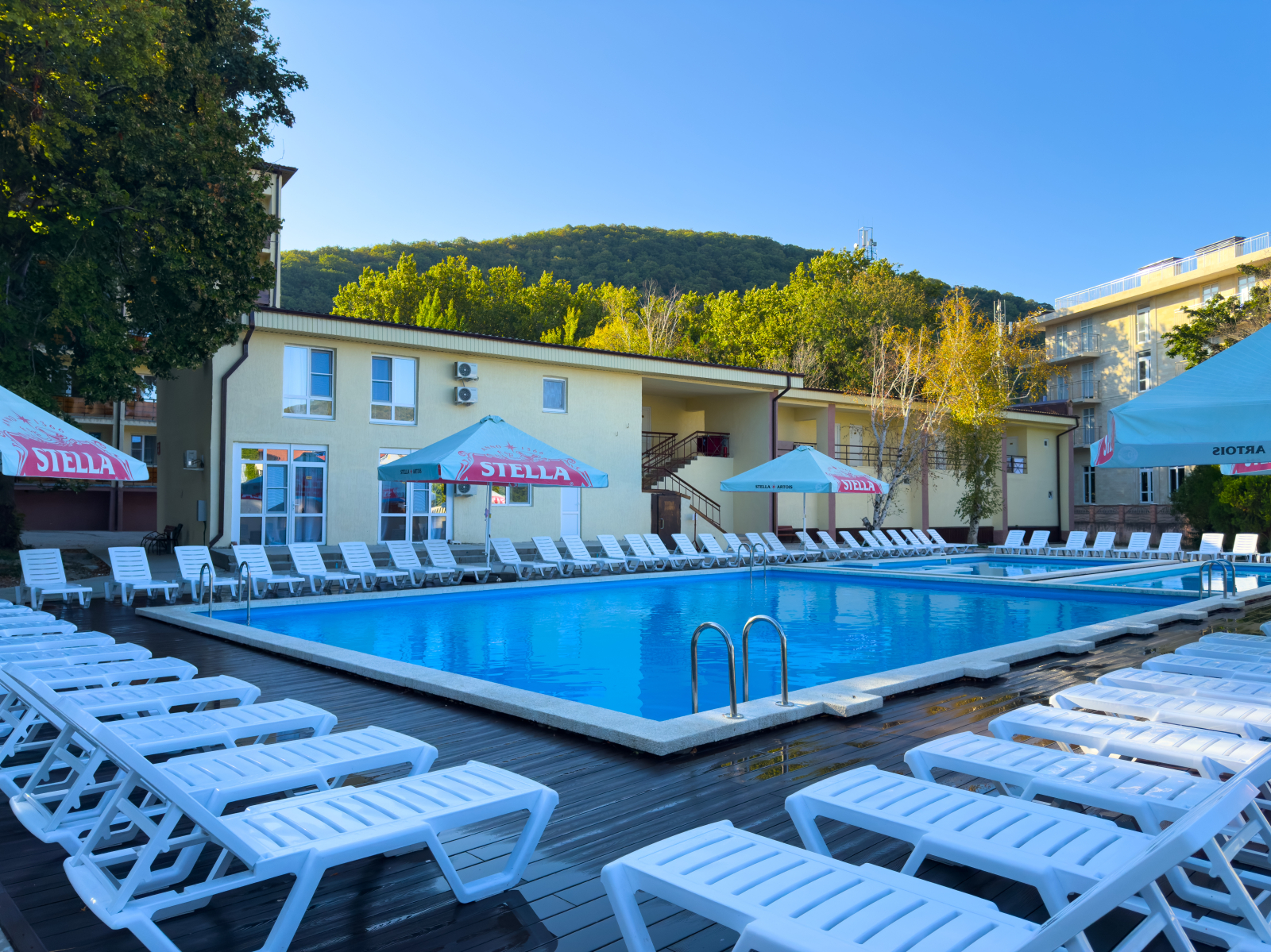 Бесплатные услуги: открытый бассейн без подогрева (бассейн общей площадью 250 кв.м., глубина взрослой зоны -1,5м., детской зоны – 0,8м, c шезлонгами и зонтиками), анимация, Wi-Fi, песчано-галечный (центральный, общекурортный, в 800 м. от отеля)
