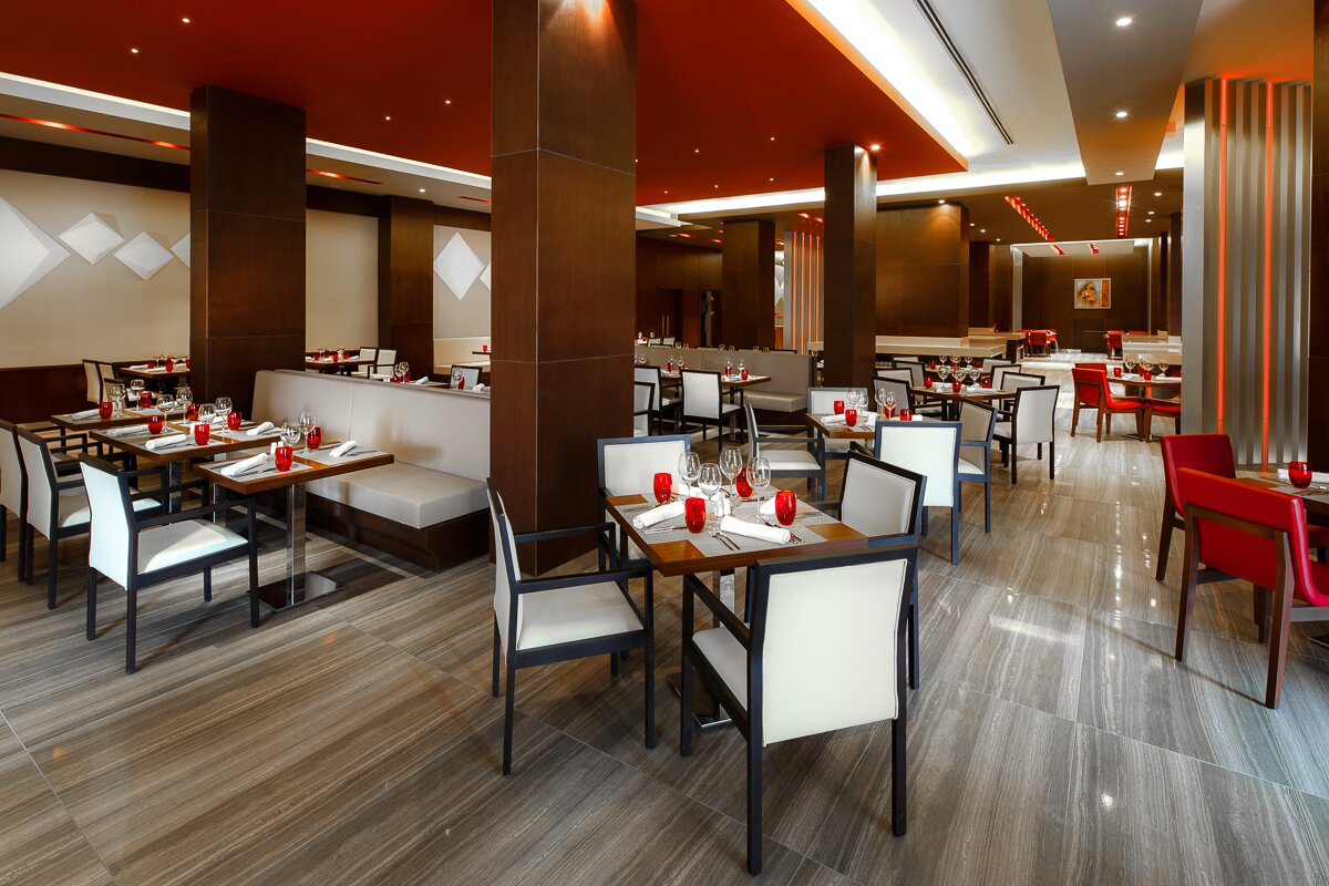 В ресторане итальянской кухни «Roma» подаются завтраки по системе «шведский стол», обеды и ужины обслуживаются по меню, в том числе детскому. Ч. В лобби-баре проходят трансляции спортивных событий и музыкальные мероприятия. Подаются европейские блюда, легкие закуски, богатая чайная карта и меню напитков. Режим работы службы доставки еды и напитков в номер Room Service – круглосуточно.
