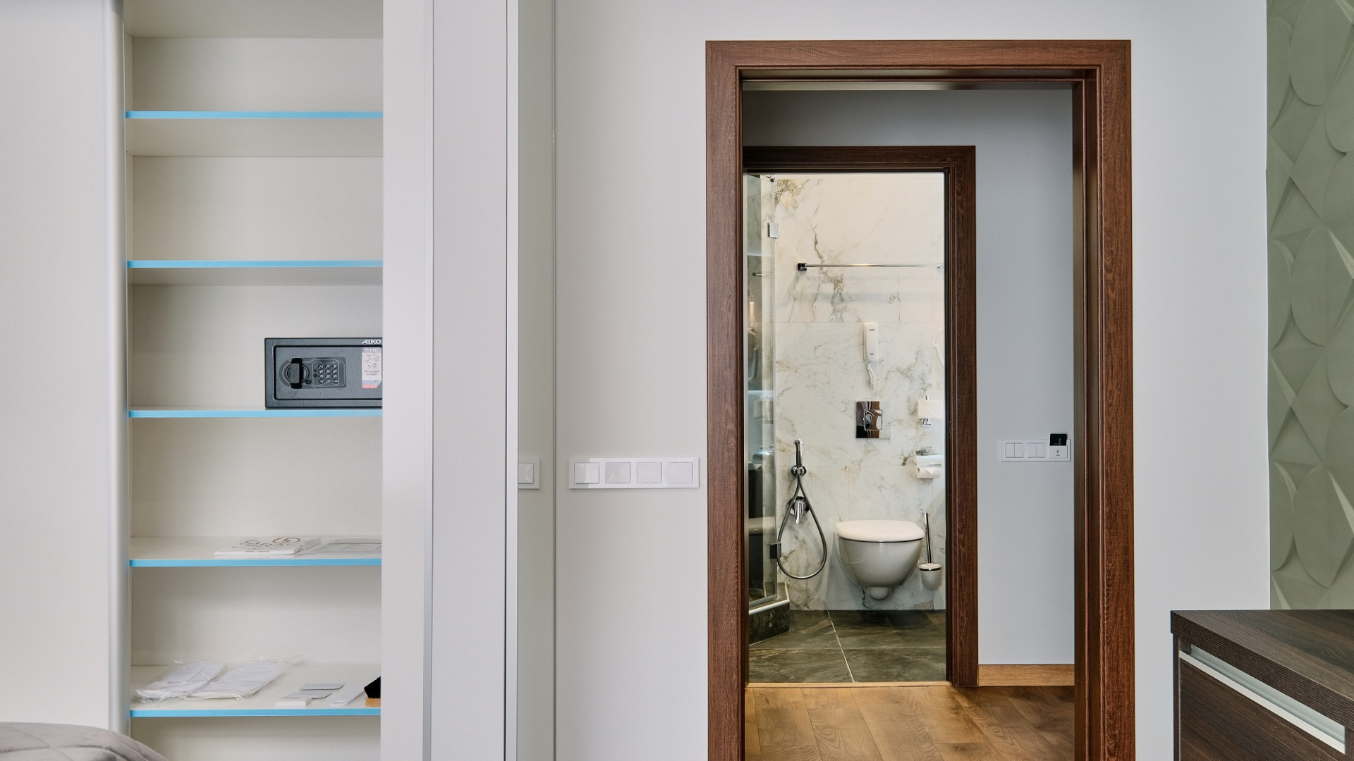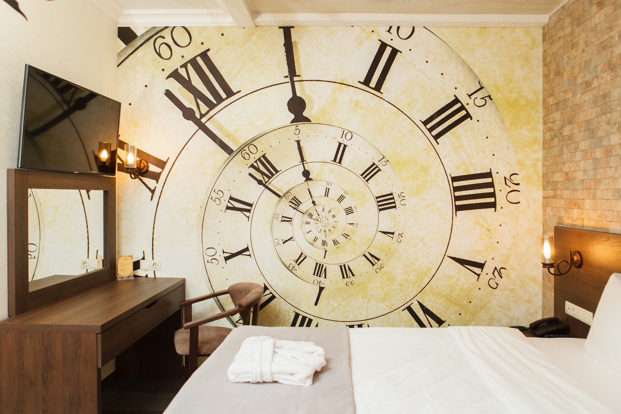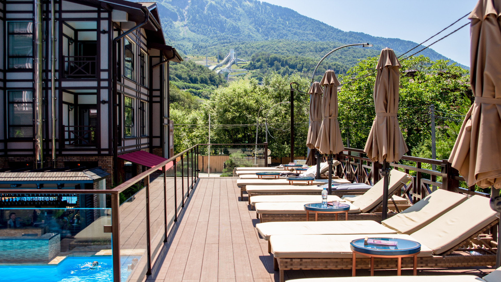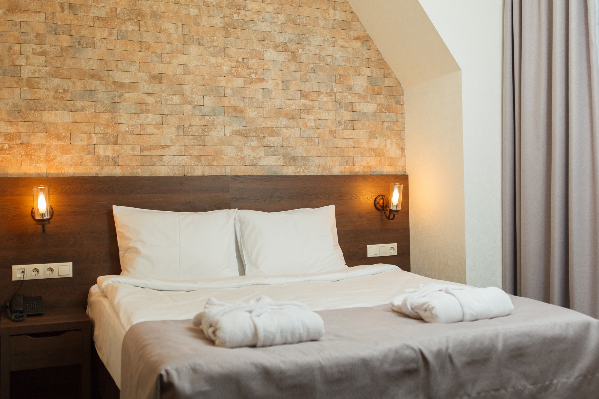В номере: душ, туалет, биде, ТВ, холодильник, кондиционер, сейф, фен, телефон, электрочайник, двуспальная или две раздельные кровати, кресло. В номере 2 основных места (без доп.мест). В номере созданы все условия для комфортного проживания, предусмотрен кондиционер, холодильник, плазменный телевизор, утюг, гладильная доска, сейф, банные принадлежности, халаты, тапочки, набор полотенец. Индивидуальный санузел оборудован современной душевой кабиной. Особенности номера: Особенность номера в панорамном окне, вид из которого открывается на горы и внутренний двор отеля.