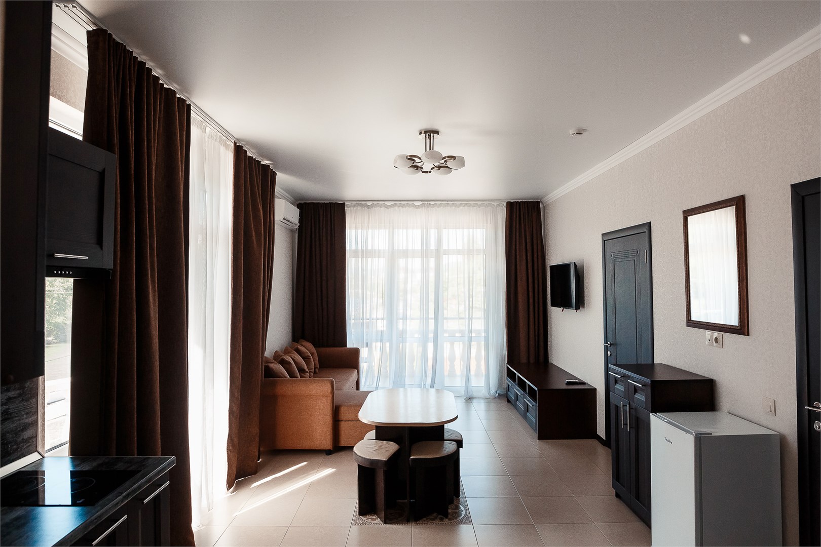 Бесплатные услуги: тренажерный зал, настольный теннис, открытый бассейн с подогревом (подогреваемые бассейны (16м/8м) и (12м/7м). Релакс-зона с плетеными шезлонгами и теневыми зонтами), парковка, проживание с животными (возможно размещение с животными до 5 кг (бесплатно) при наличии вет. паспорта), Wi-Fi, мангальная зона, песчаный (центральный, в 100 м. от отеля), галечный (центральный, в 100 м. от отеля)