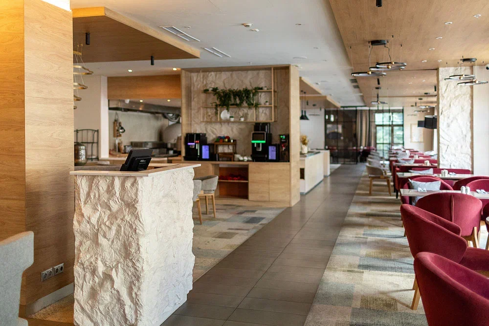 В корпусе: номерной фонд, ресепшн, бассейн, ресторан, SPA