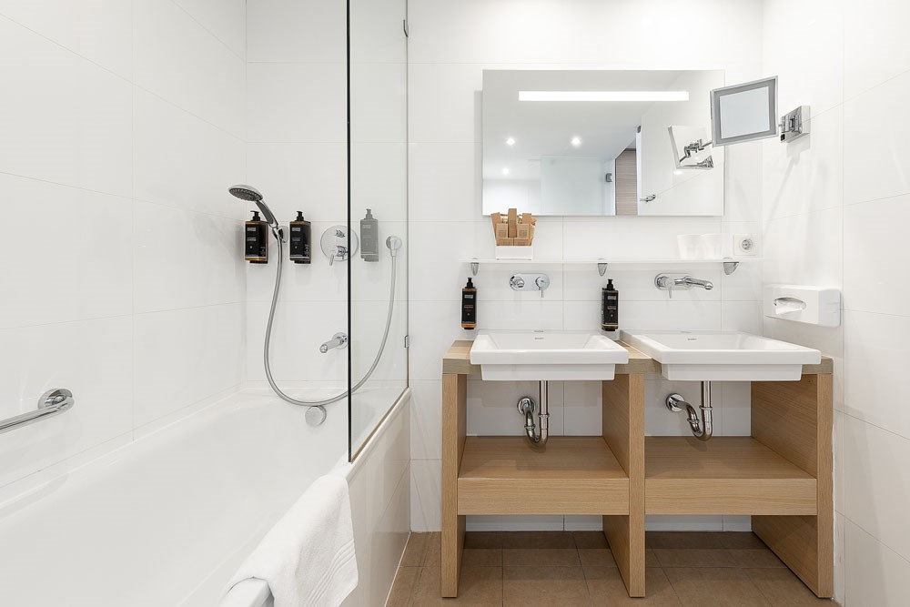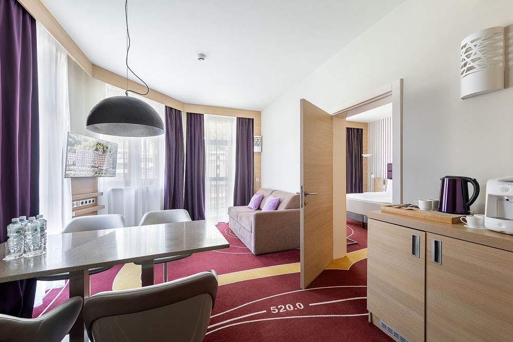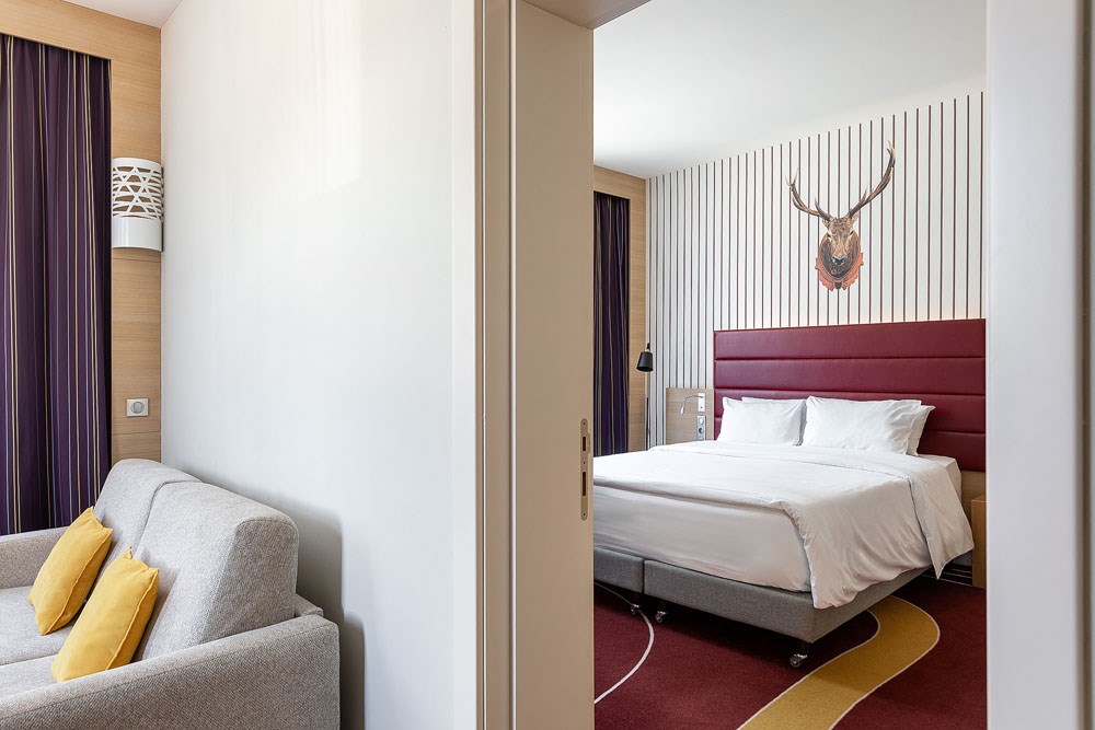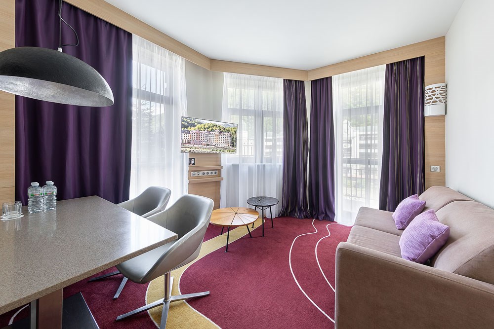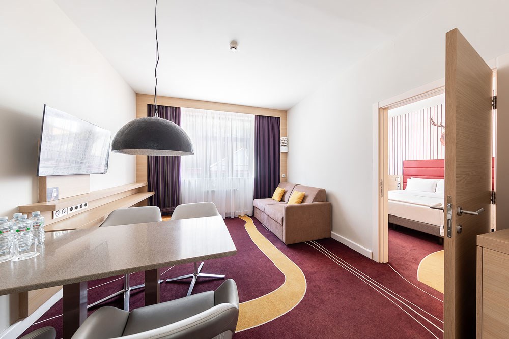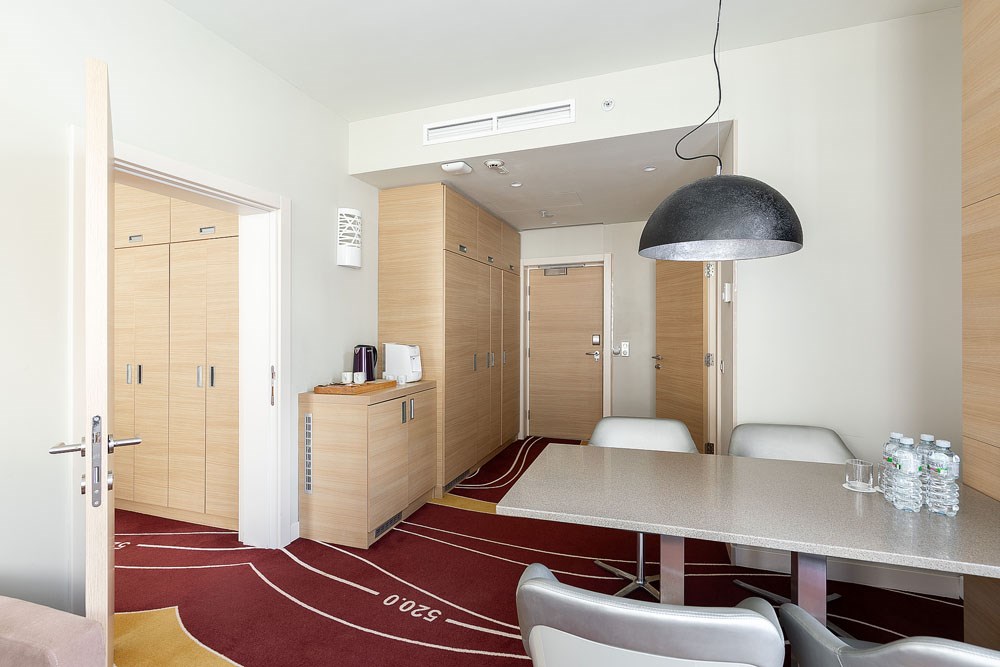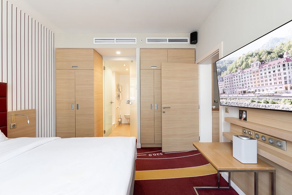 В номере: душ, туалет, ТВ, кондиционер, сейф, фен, телефон, чайная станция, электрочайник, двуспальная кровать, диван (раскладной), капсульная кофемашина, утюг