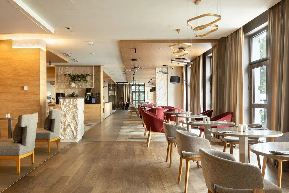 Бесплатные услуги: крытый бассейн (15*5м., с подогревом, под стеклянными куполами и просторными витражами с видом на лес), тренажерный зал (круглосуточный), СПА-комплекс, Wi-Fi, хаммам