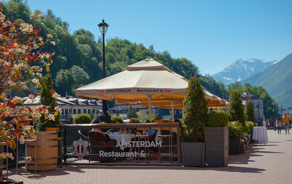 Питание: ресторан (Ресторан "TheAmsterdam" предоставляет кухню европейских стран. Есть детское меню в ресторане, постоянно действует ряд акций и специальных предложений для родителей с детьми. Вечера живой музыки.), летняя веранда (Для гостей ресторана "TheAmsterdam" открыта терраса с прекрасным видом на реку и горные вершины, рядом расположена детская площадка, которая является центром притяжения для маленьких гостей.)