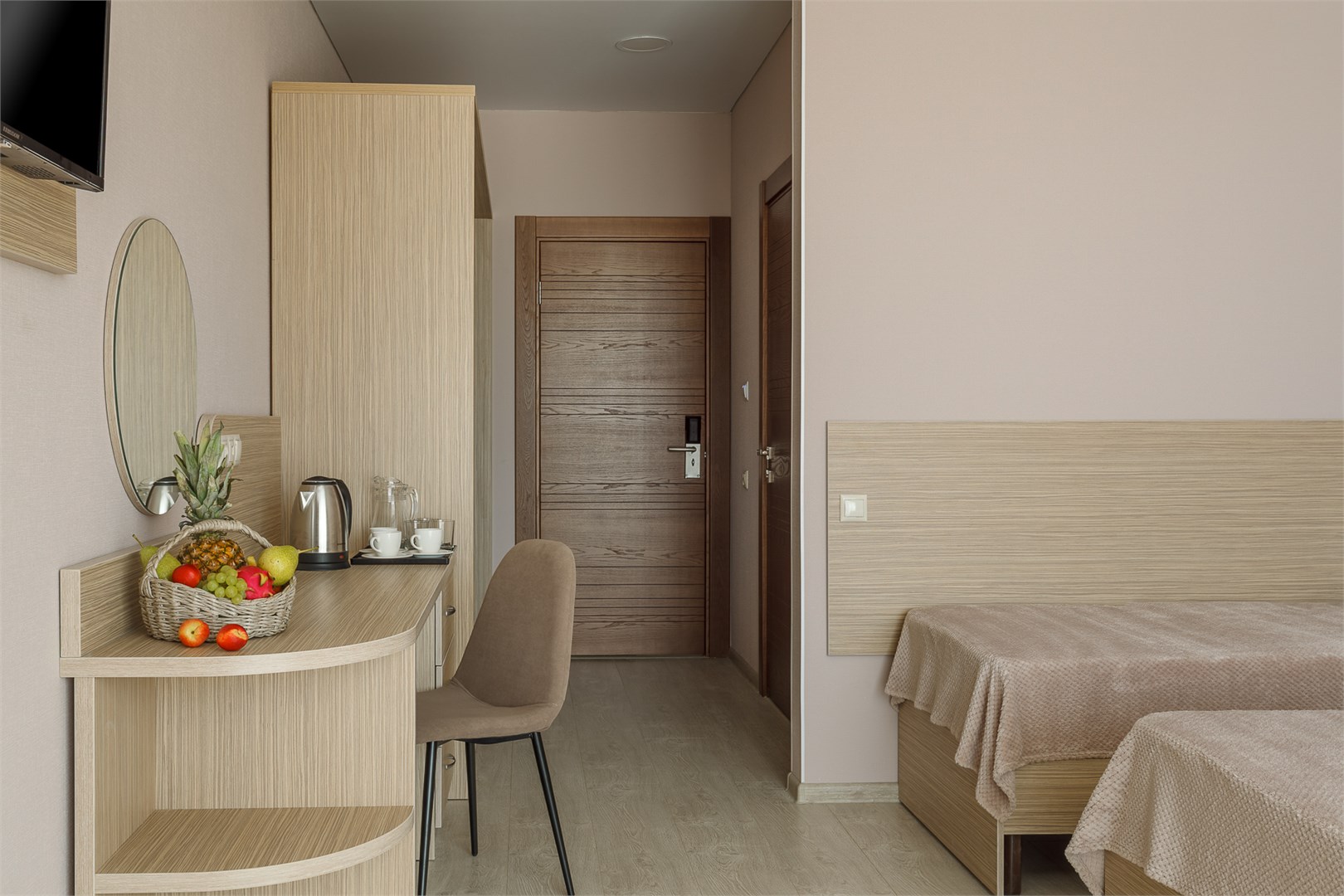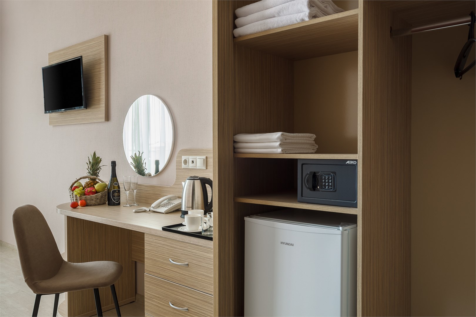 В номере: душ, туалет, ТВ, холодильник, кондиционер, сейф, фен, чайная станция, электрочайник, двуспальная кровать, диван, кресло, балкон, кофемашина, халаты детские и взрослые, банные принадлежности и гостиничная парфюмерия. Номера расположены с 2 по 4 этажи.
