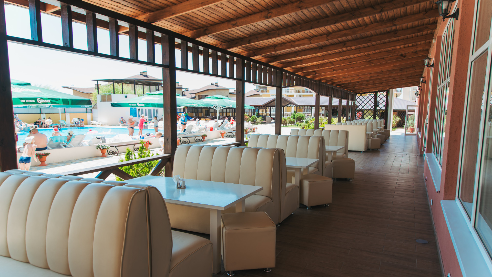 Детям: детское меню (питательные каши, нежные омлеты, аппетитная курочка и разнообразные фрукты и овощи), детская анимация, детский бассейн, детские горки в бассейне (Аквагородок, платно на пляже), услуги няни (платно), детская комната (с 9:00 до 18:00), детская площадка, детские кроватки, прокат детских колясок
