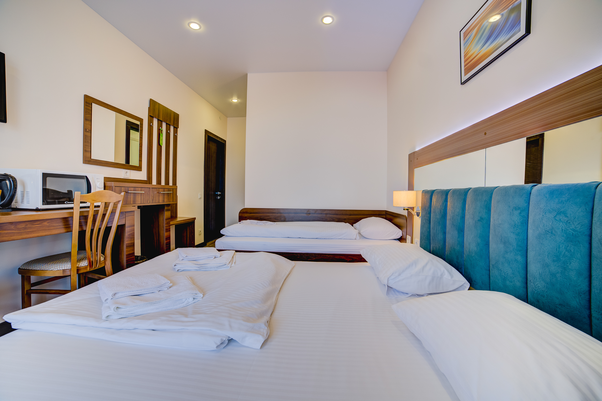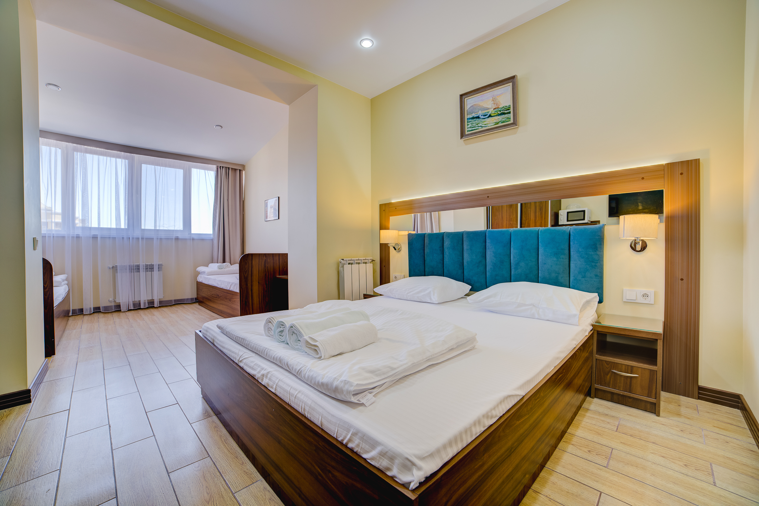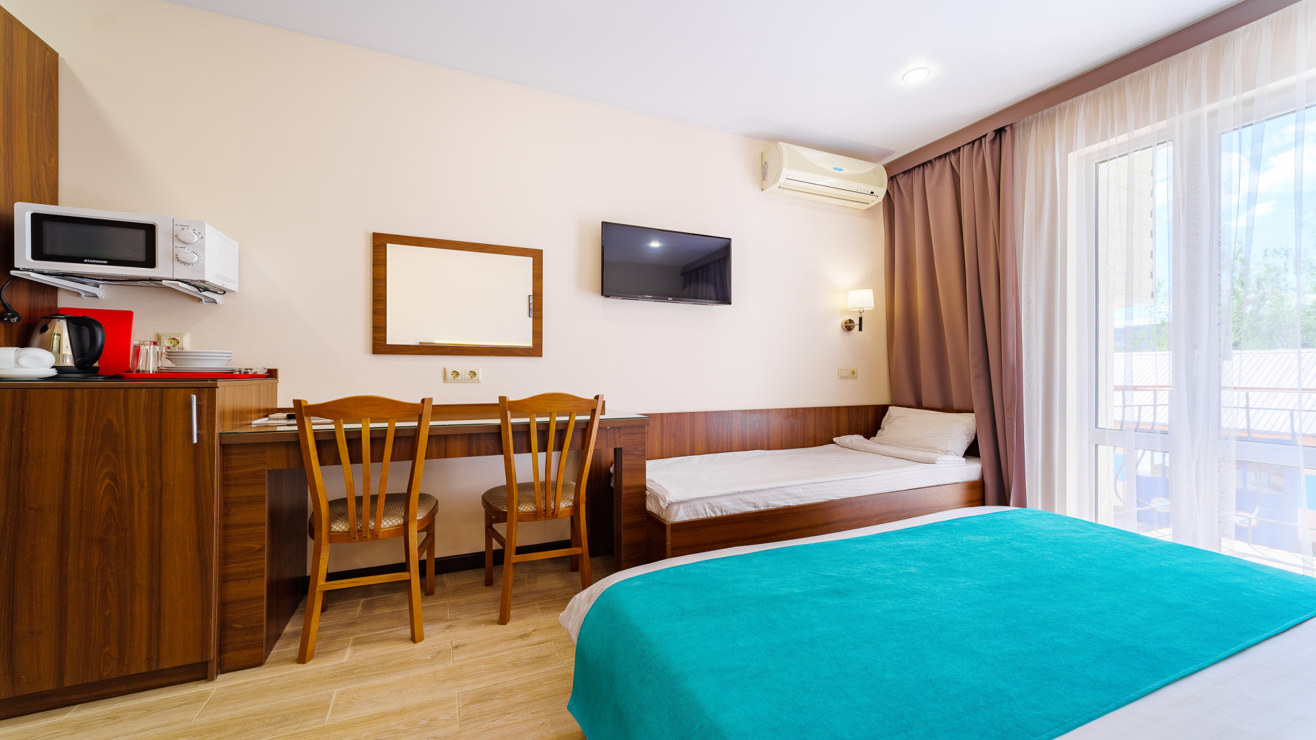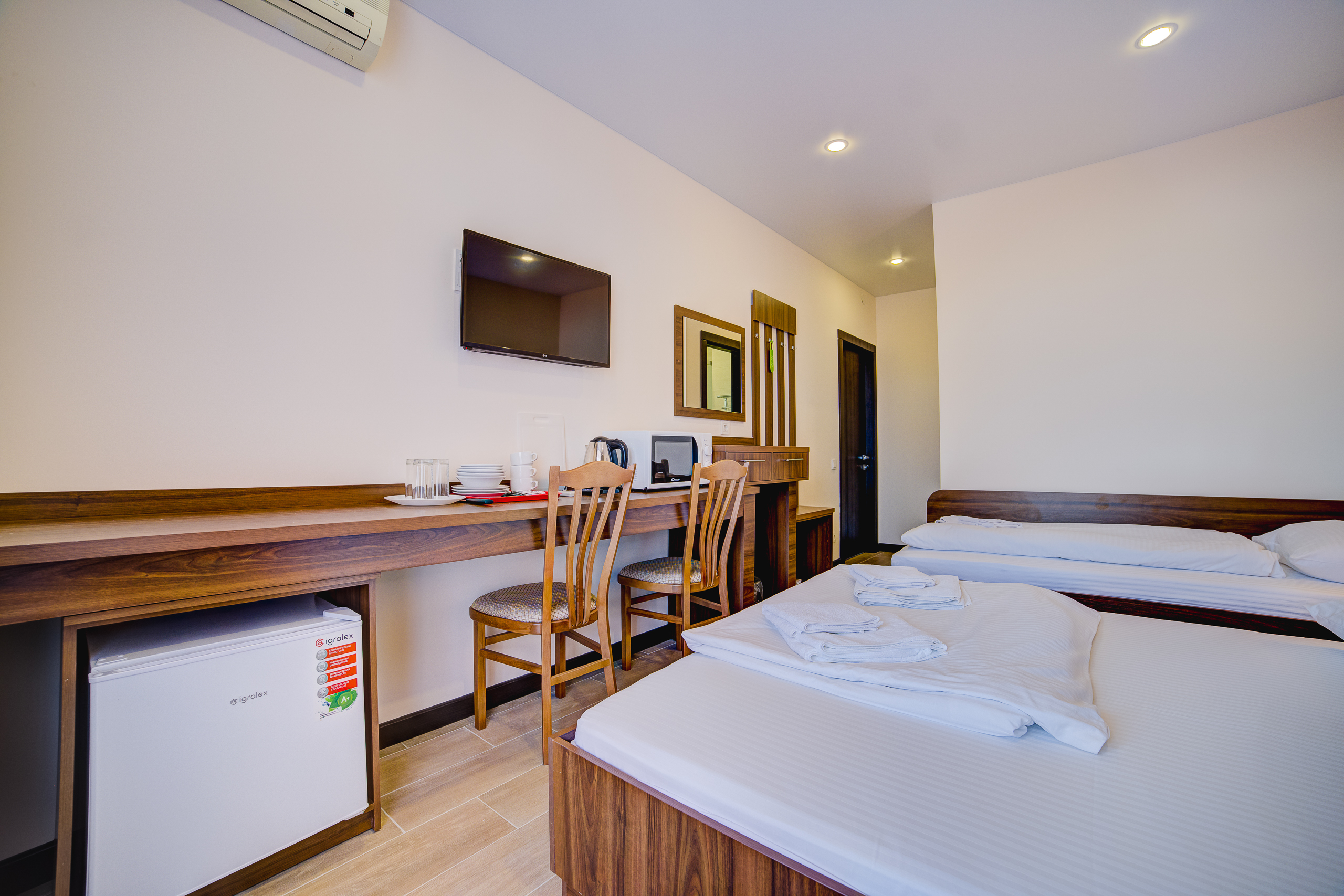 В номере: душ, туалет, ТВ, холодильник, кондиционер, сейф, фен, электрочайник, СВЧ-печь, односпальная кровать, двуспальная кровать, балкон (Вид на горы). Площадь комнаты – 16 кв.м. К вашим услугам: двуспальная кровать, односпальная кровать с ортопедическими матрасами, кондиционер, телевизор, холодильник, микроволновая печь, чайник, набор посуды, сейф, тапочки. С/у с душевой кабинкой, фен, гигиенические наборы, мыло, гель, шампунь. На этаже расположена кухня общего пользования