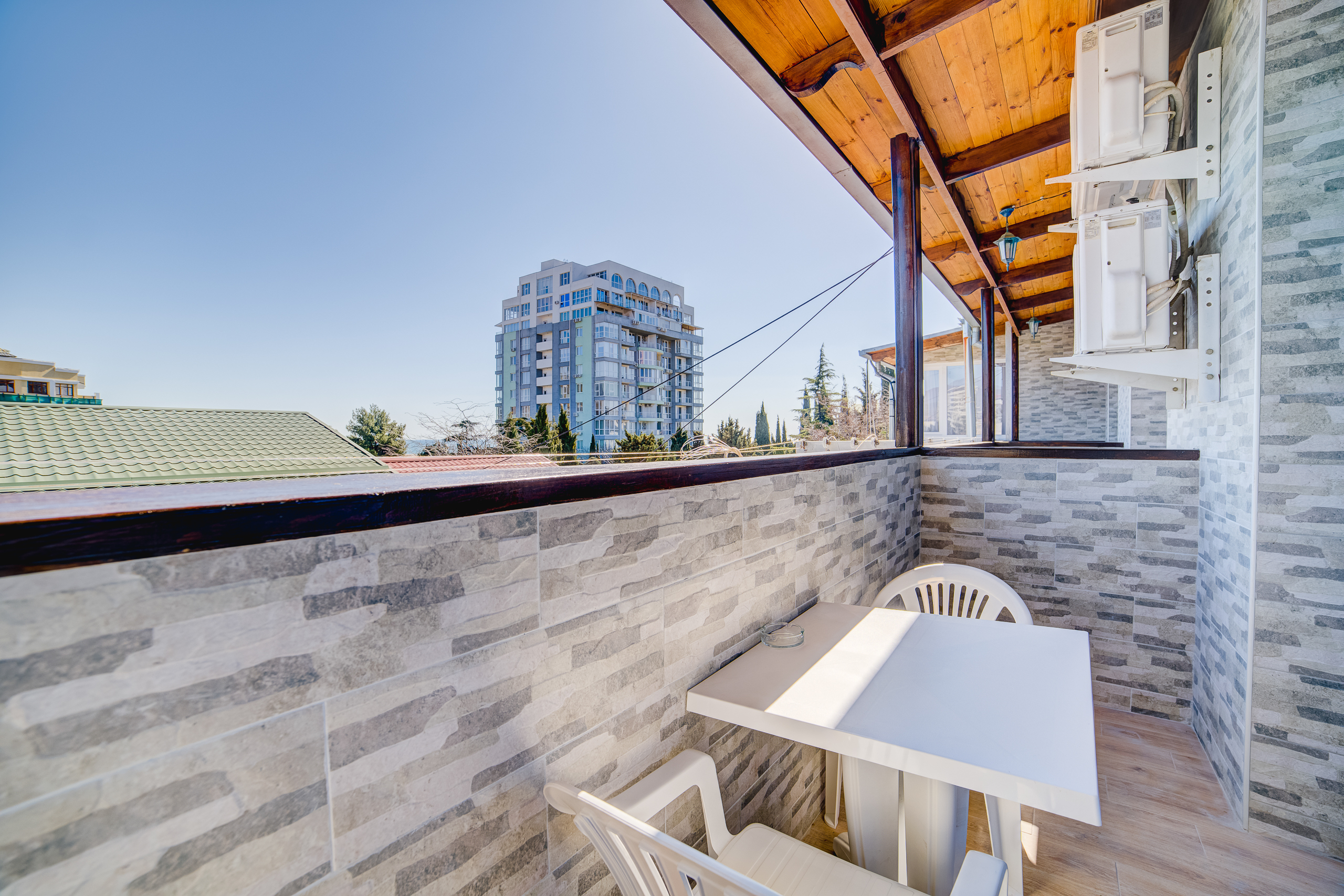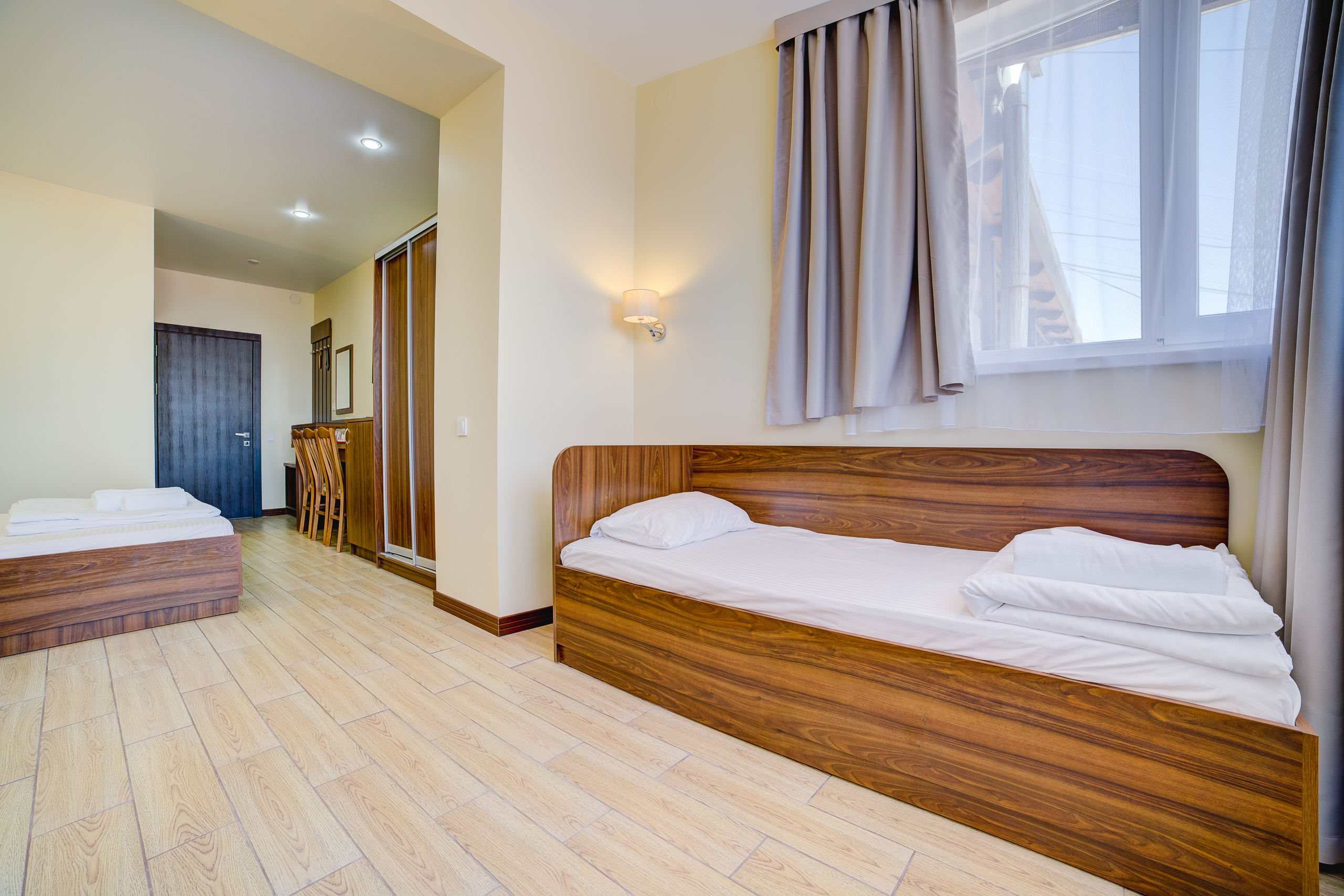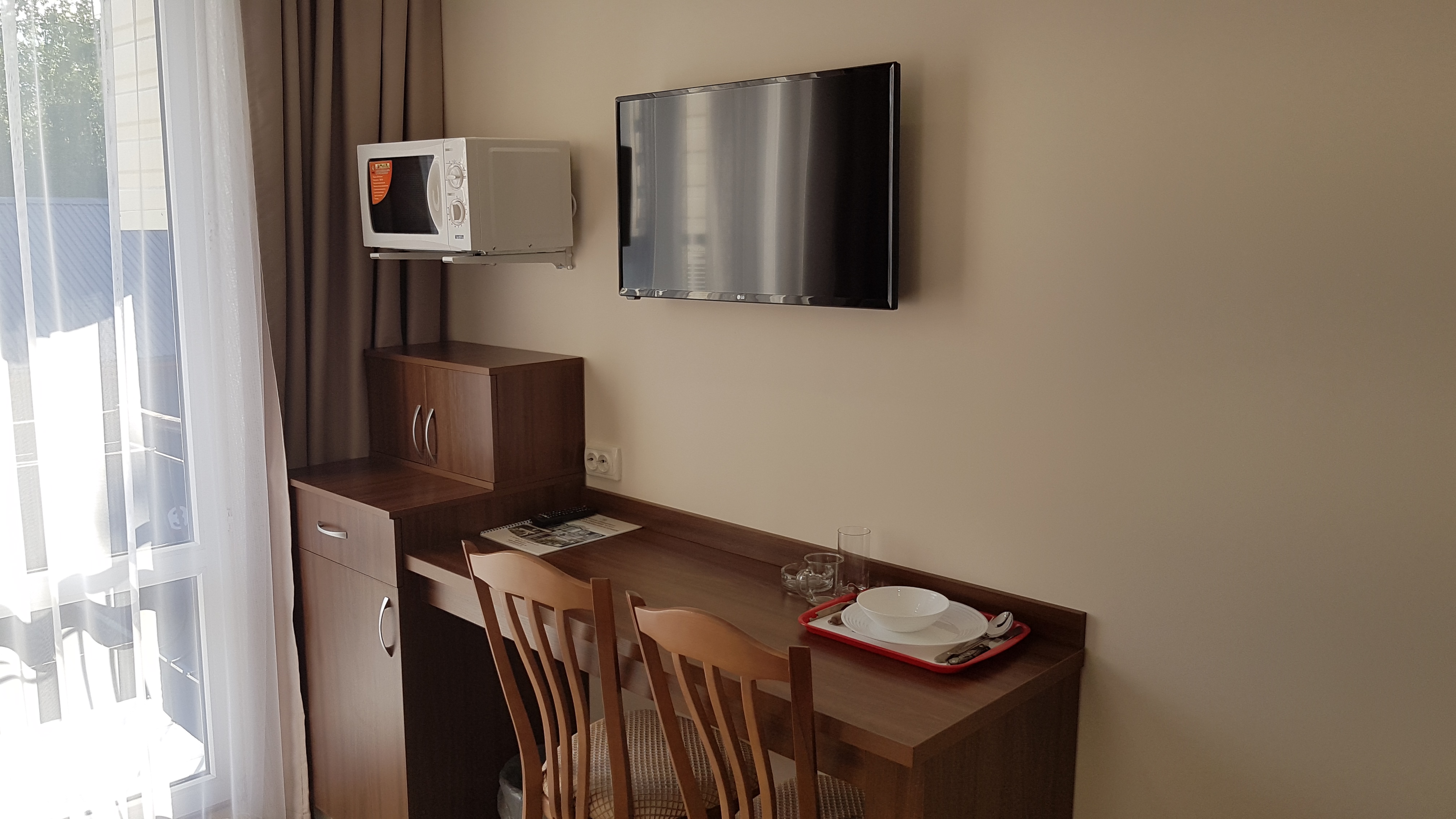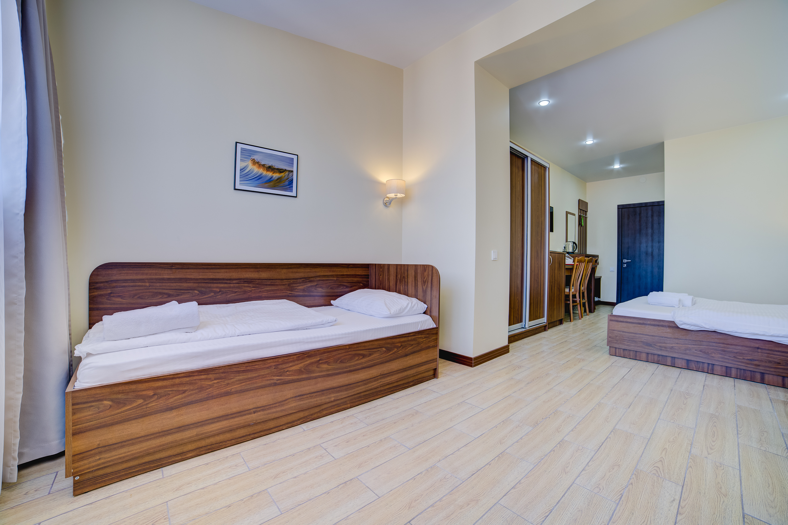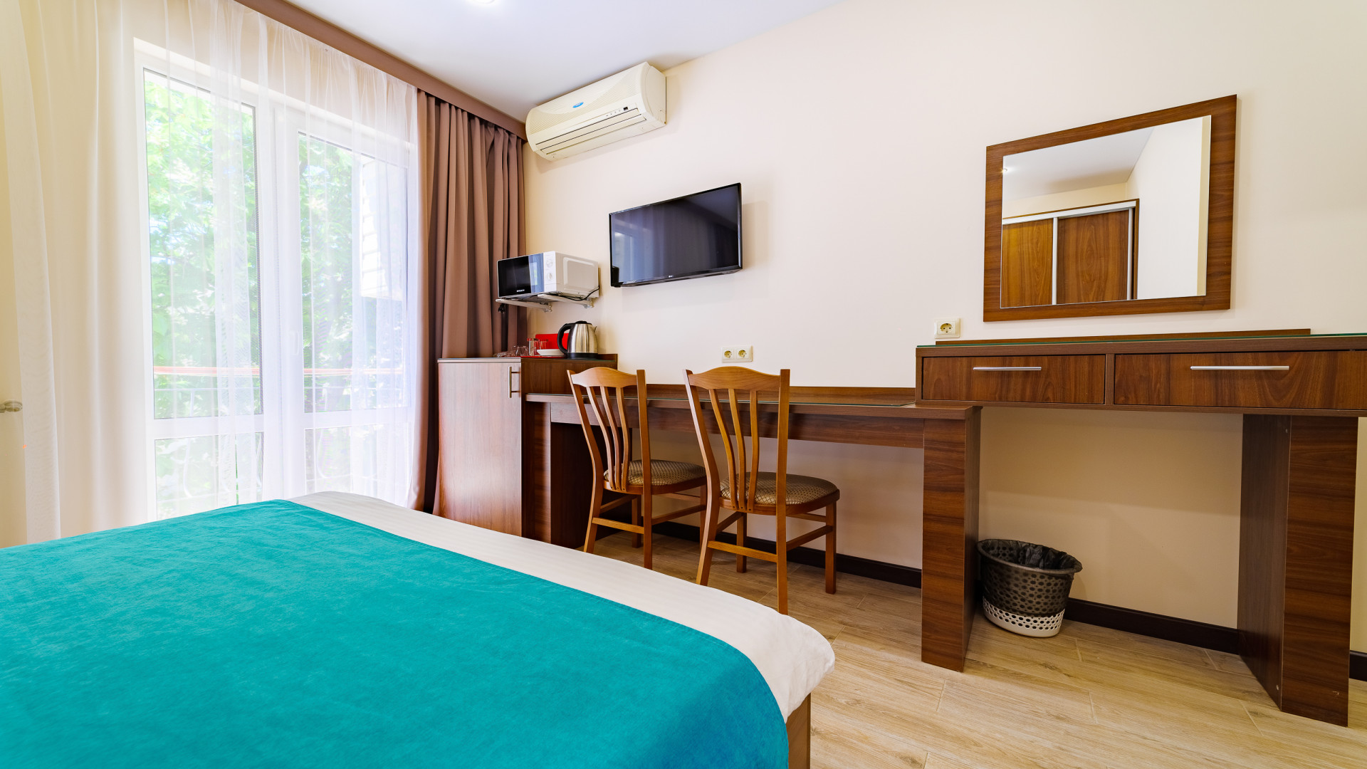 В номере: душ, туалет, ТВ, холодильник, кондиционер, сейф, фен, электрочайник, СВЧ-печь, односпальная кровать, двуспальная кровать, балкон (Вид на горы). Площадь комнаты – 16 кв.м. К вашим услугам: двуспальная кровать, односпальная кровать с ортопедическими матрасами, кондиционер, телевизор, холодильник, микроволновая печь, чайник, набор посуды, сейф, тапочки. С/у с душевой кабинкой, фен, гигиенические наборы, мыло, гель, шампунь. На этаже расположена кухня общего пользования