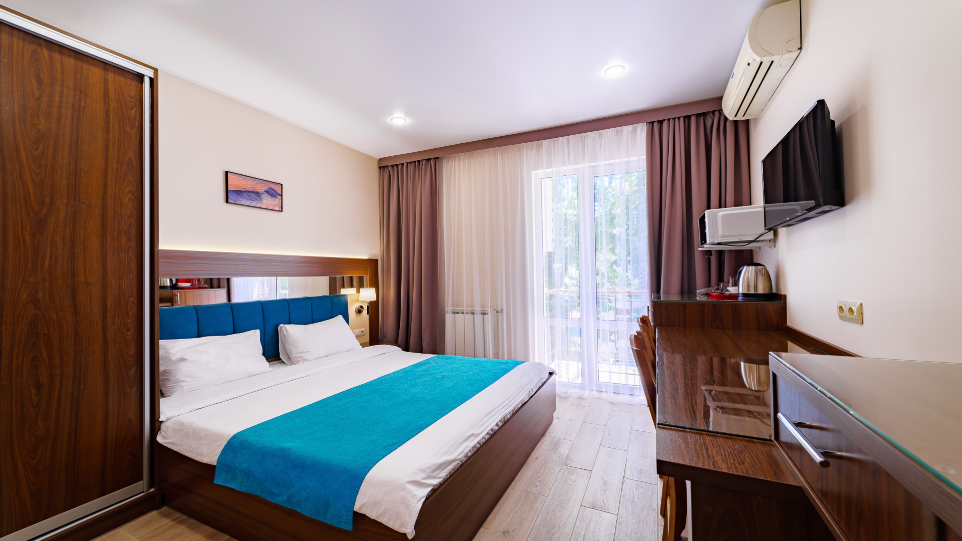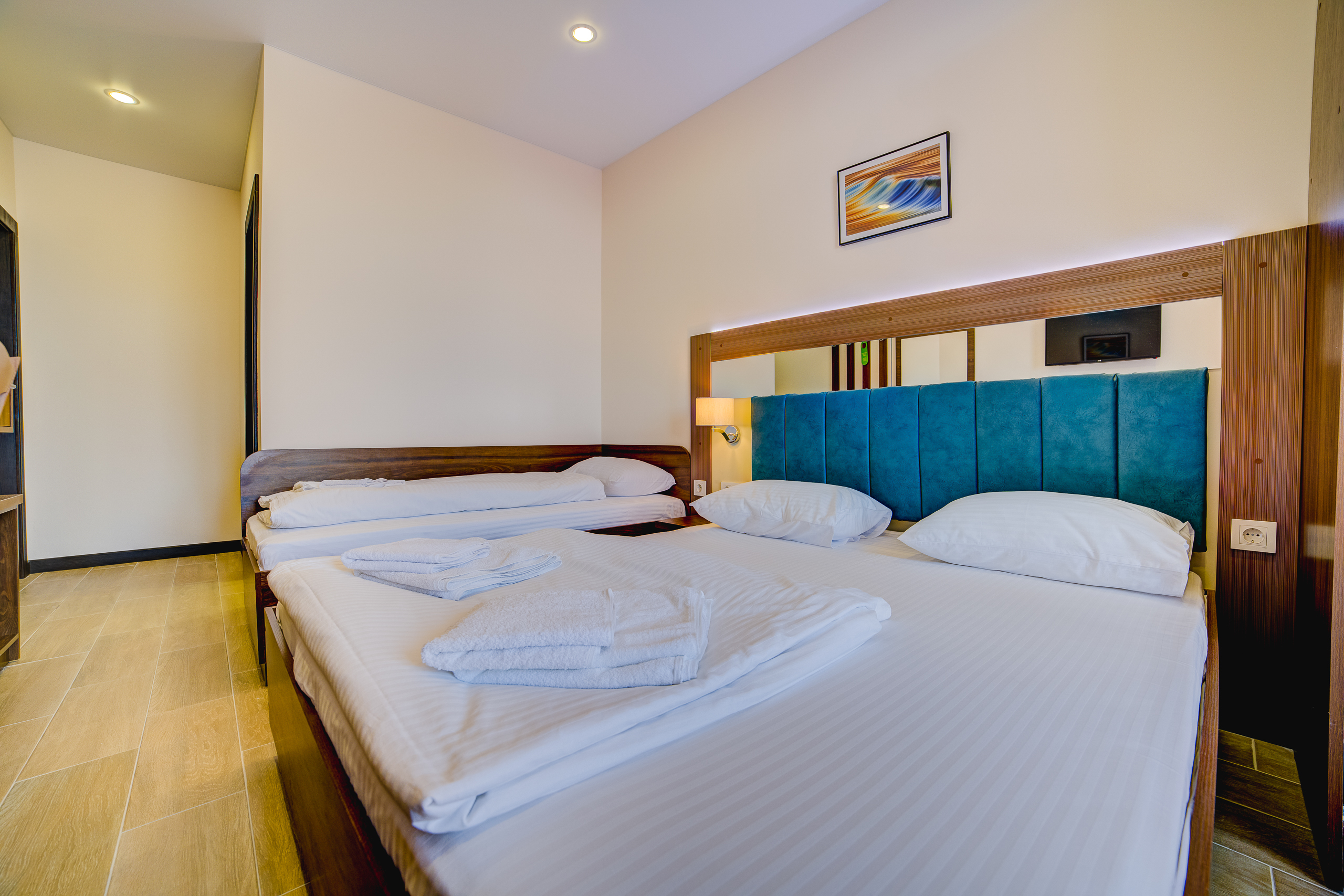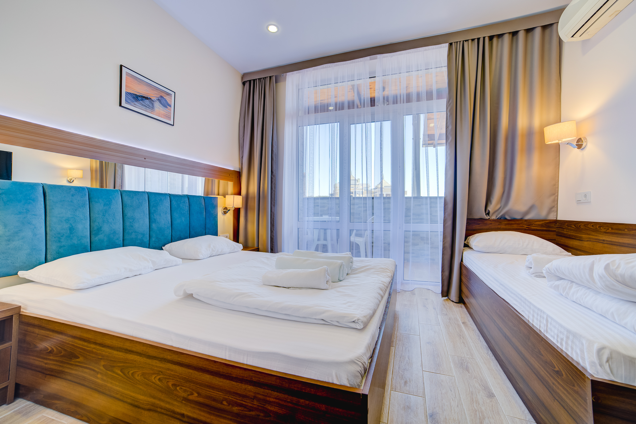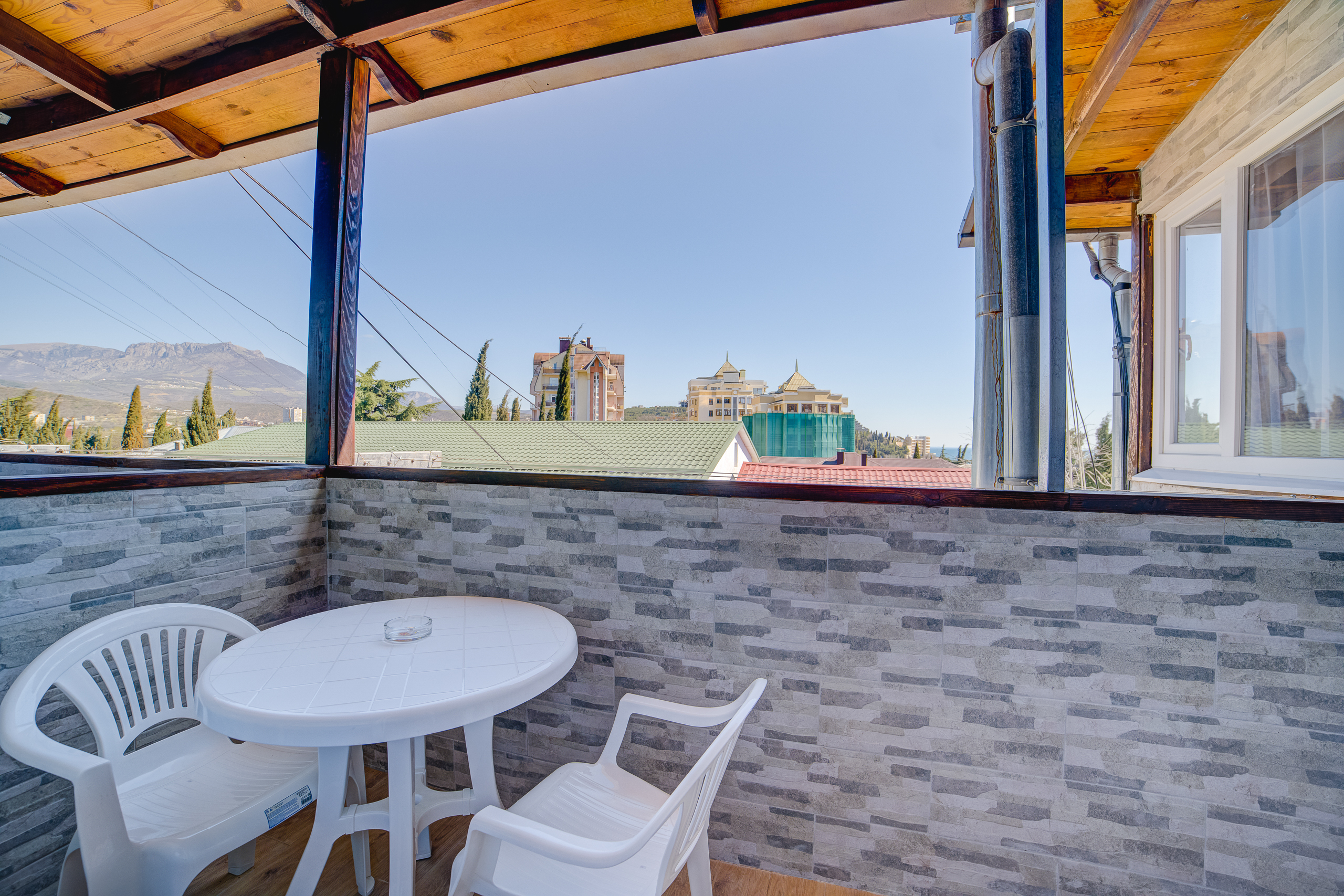 В номере: душ, туалет, ТВ, холодильник, кондиционер, сейф, фен, электрочайник, СВЧ-печь, односпальная кровать, двуспальная кровать, балкон (Вид на горы). Площадь комнаты – 16 кв.м. К вашим услугам: двуспальная кровать, односпальная кровать с ортопедическими матрасами, кондиционер, телевизор, холодильник, микроволновая печь, чайник, набор посуды, сейф, тапочки. С/у с душевой кабинкой, фен, гигиенические наборы, мыло, гель, шампунь. На этаже расположена кухня общего пользования