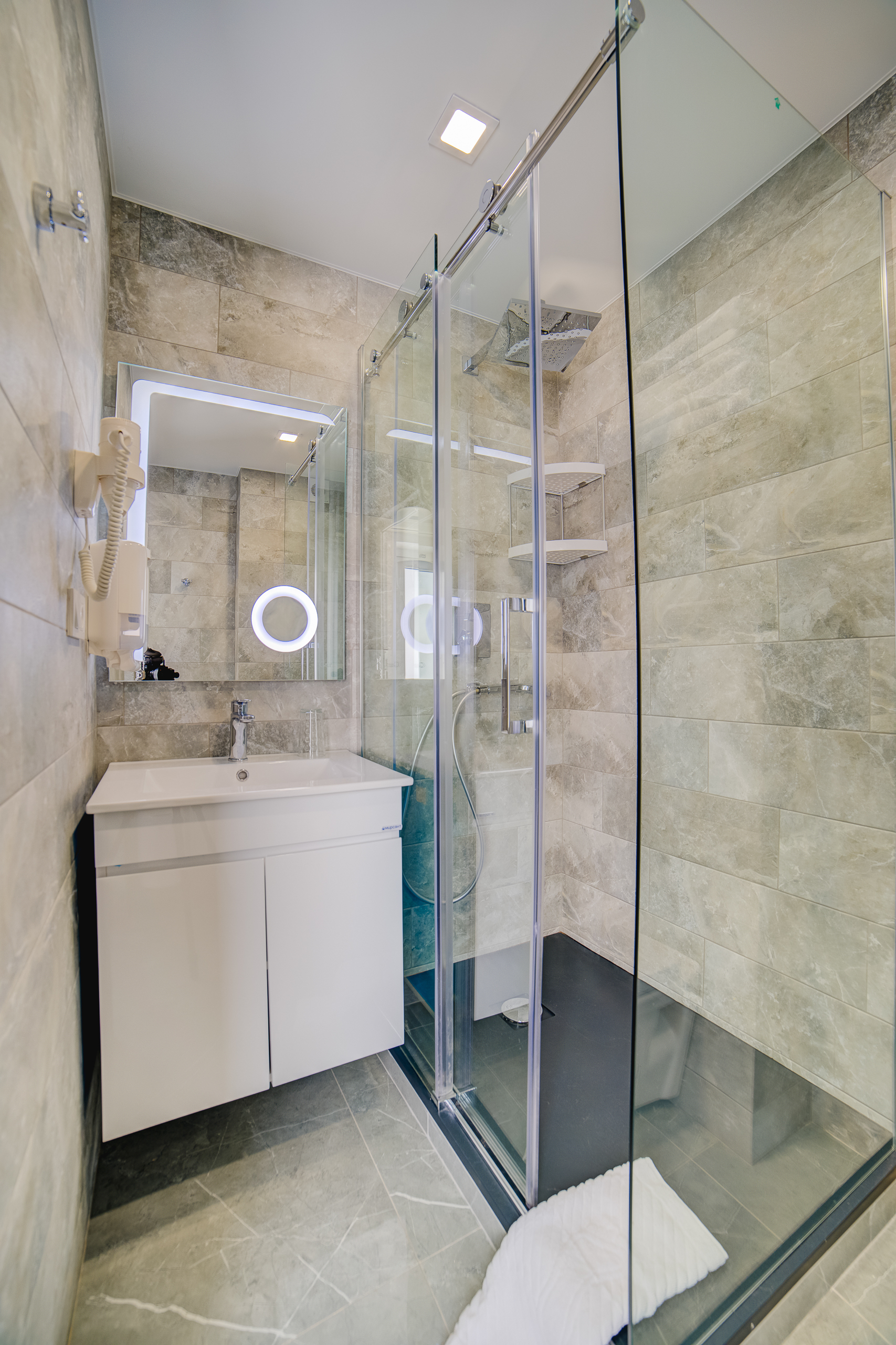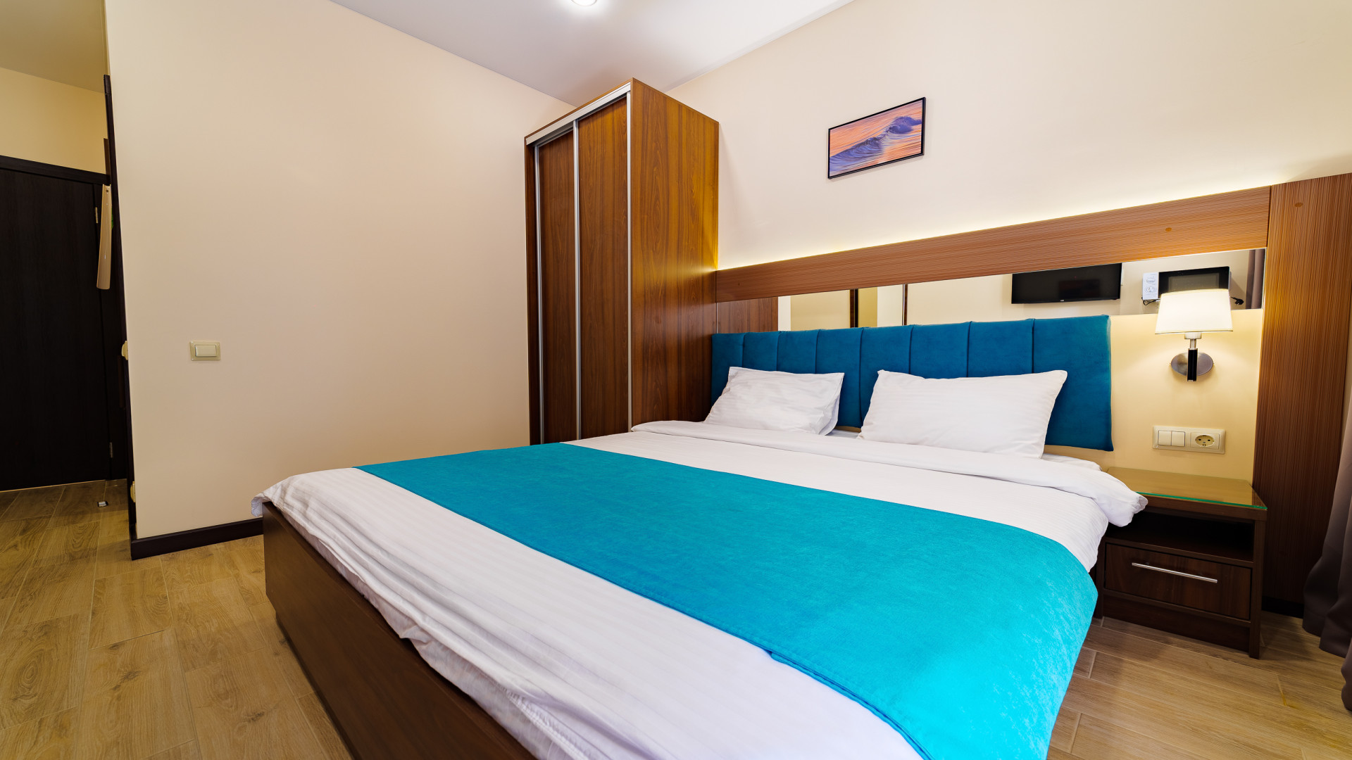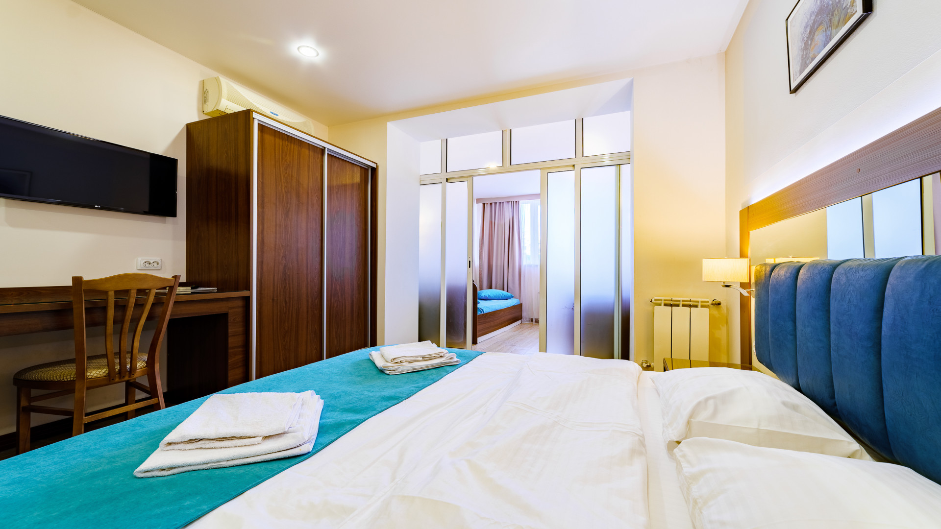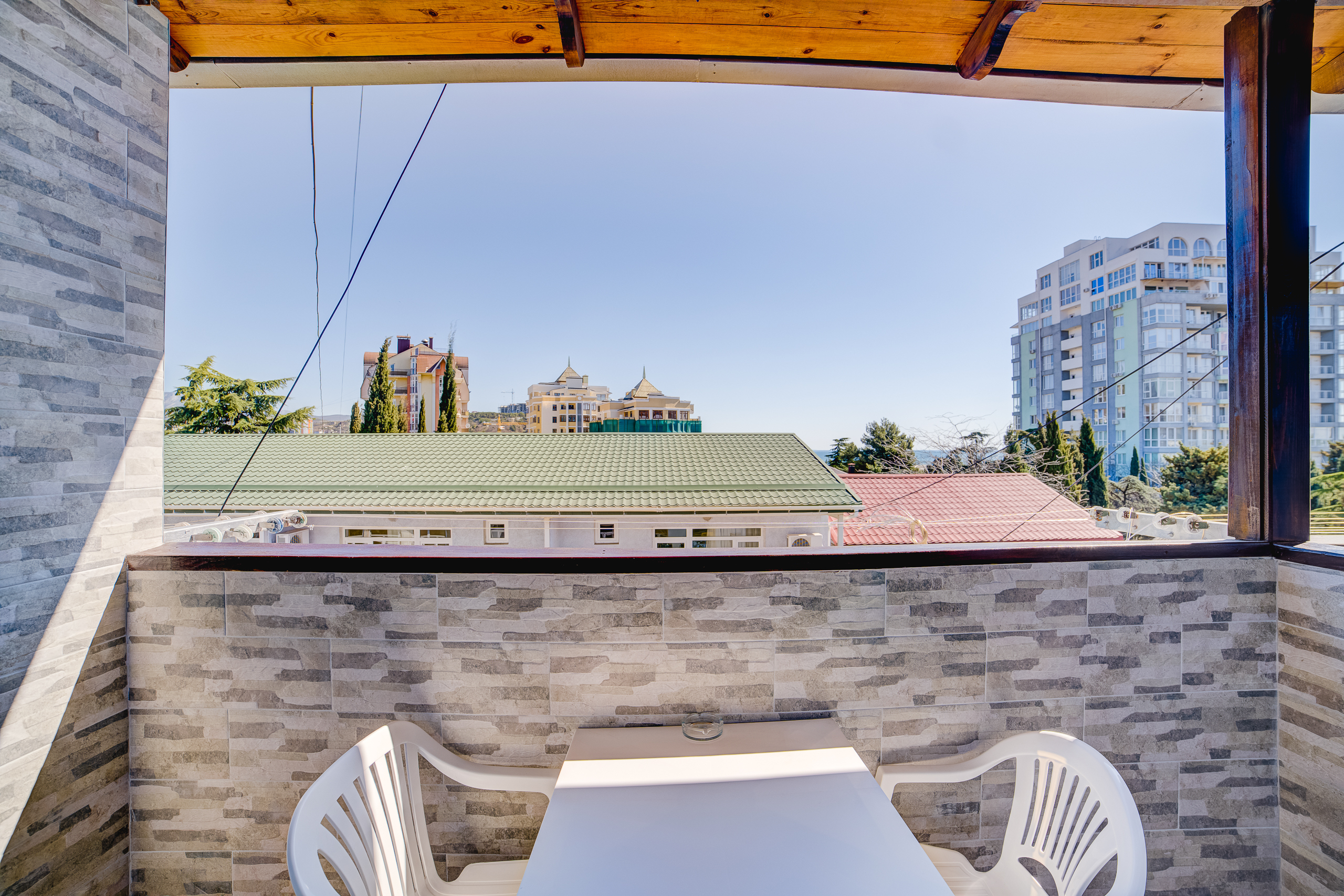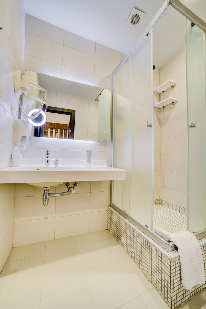 В номере: душ, туалет, ТВ, холодильник, кондиционер, сейф, фен, электрочайник, СВЧ-печь, односпальная кровать, двуспальная кровать, балкон (Вид на горы). Площадь комнаты – 16 кв.м. К вашим услугам: двуспальная кровать, односпальная кровать с ортопедическими матрасами, кондиционер, телевизор, холодильник, микроволновая печь, чайник, набор посуды, сейф, тапочки. С/у с душевой кабинкой, фен, гигиенические наборы, мыло, гель, шампунь. На этаже расположена кухня общего пользования