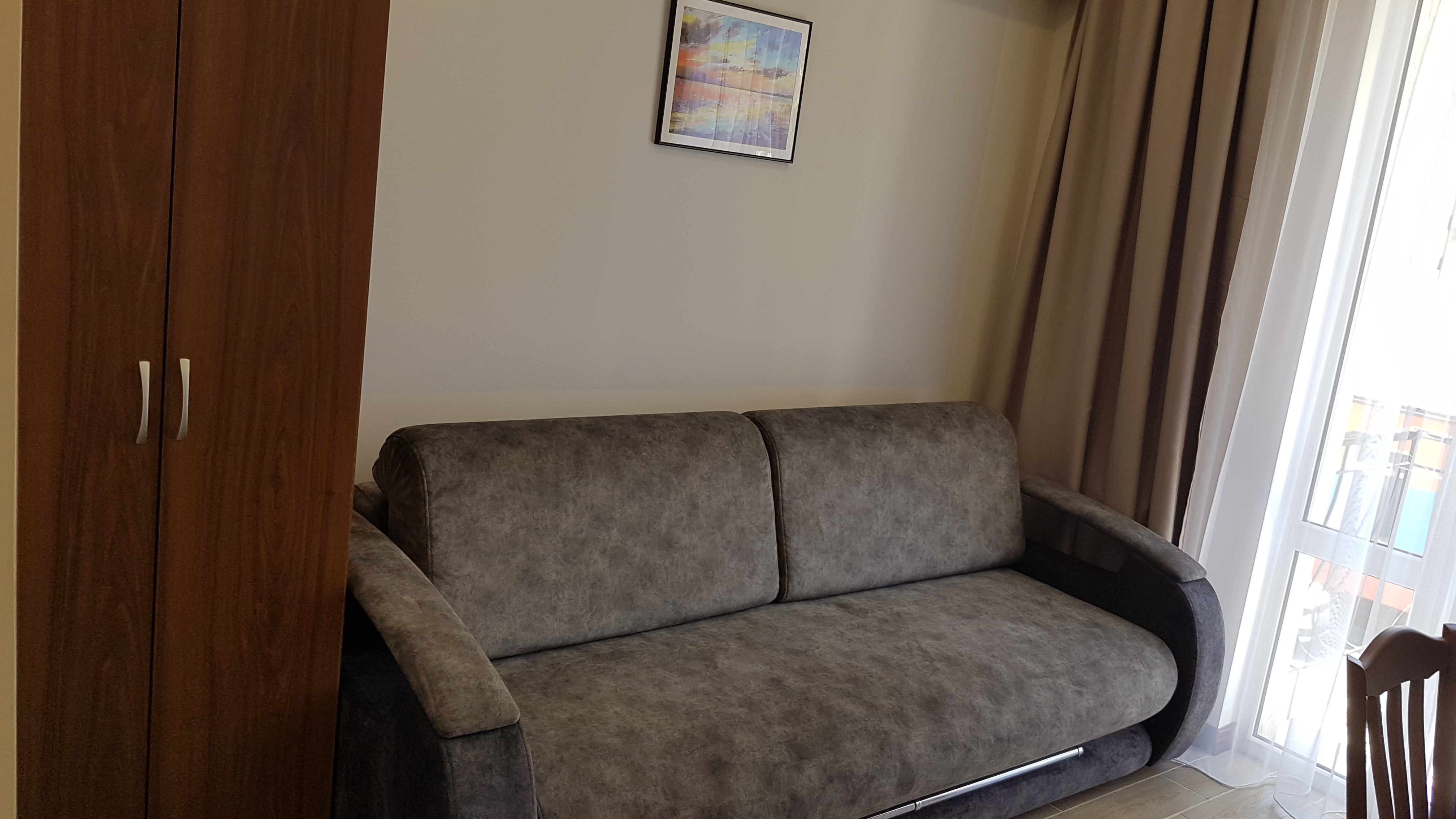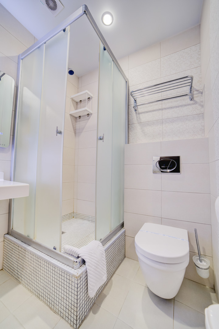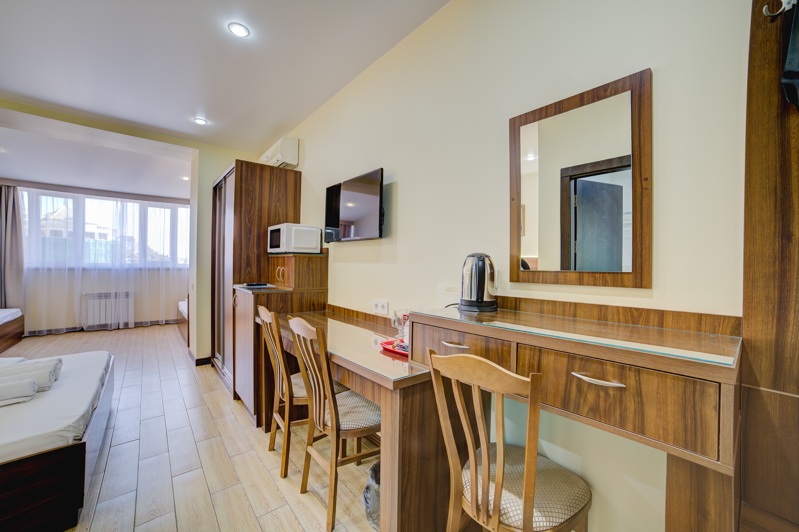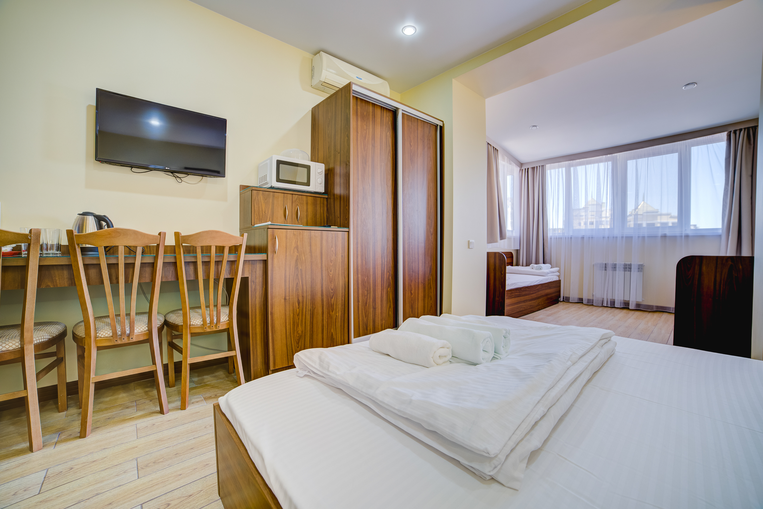 В номере: душ, туалет, ТВ, холодильник, кондиционер, сейф, фен, электрочайник, СВЧ-печь, диван, балкон. Площадь комнаты – 14 кв.м, диван-кровать, телевизор, холодильник, микроволновая печь, набор посуды, тапочки, туалетные средства, банные полотенца, кондиционер, сейф, автономное отопление (зимой), с/у с душевой кабинкой, фен, французский балкон (вид на город), WI-FI. Уборка – ежедневно, смена постельного белья – раз в три дня.