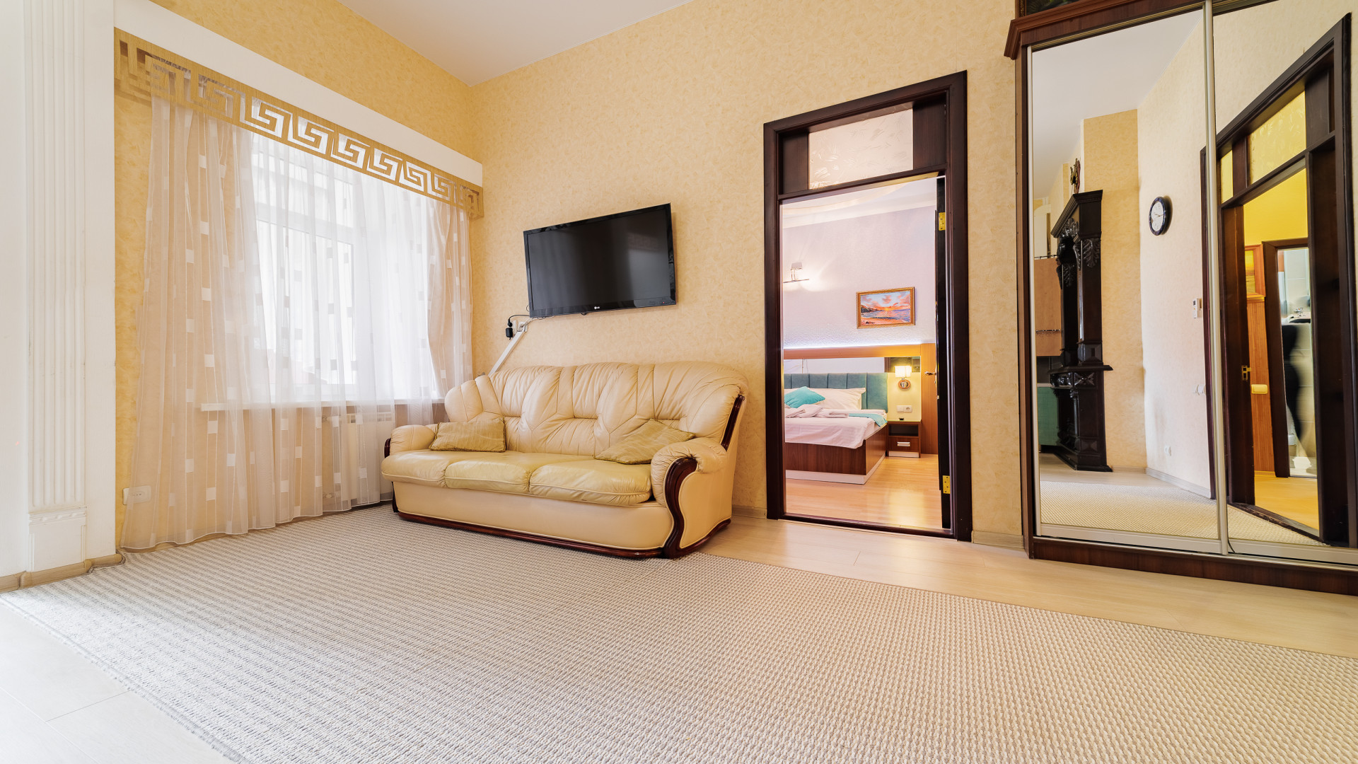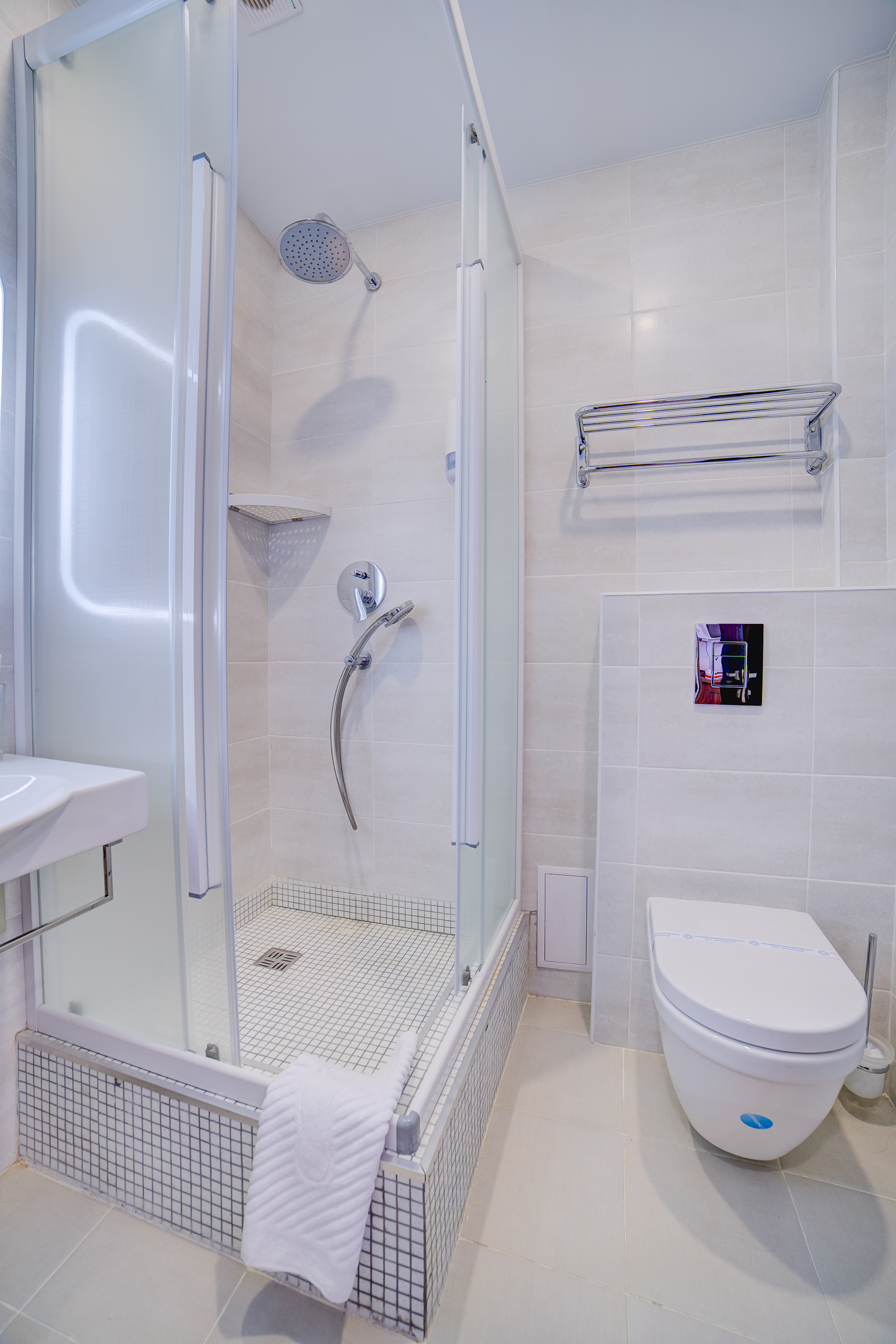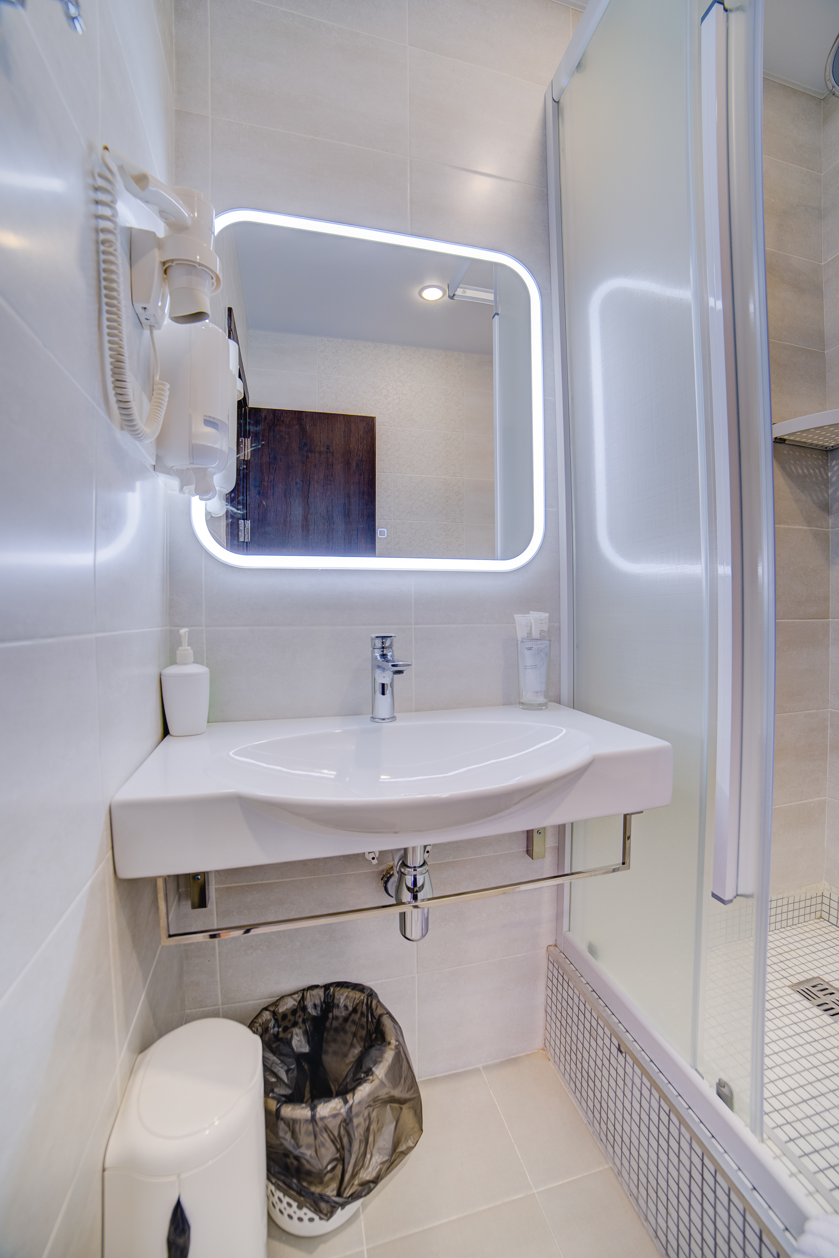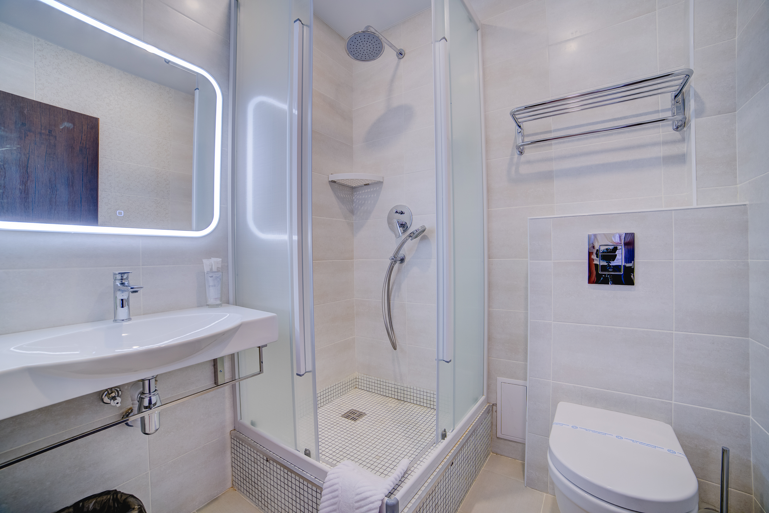 В номере: душ, туалет, ТВ, холодильник, кондиционер, сейф, фен, электрочайник, СВЧ-печь, диван, балкон. Площадь комнаты – 14 кв.м, диван-кровать, телевизор, холодильник, микроволновая печь, набор посуды, тапочки, туалетные средства, банные полотенца, кондиционер, сейф, автономное отопление (зимой), с/у с душевой кабинкой, фен, французский балкон (вид на город), WI-FI. Уборка – ежедневно, смена постельного белья – раз в три дня.