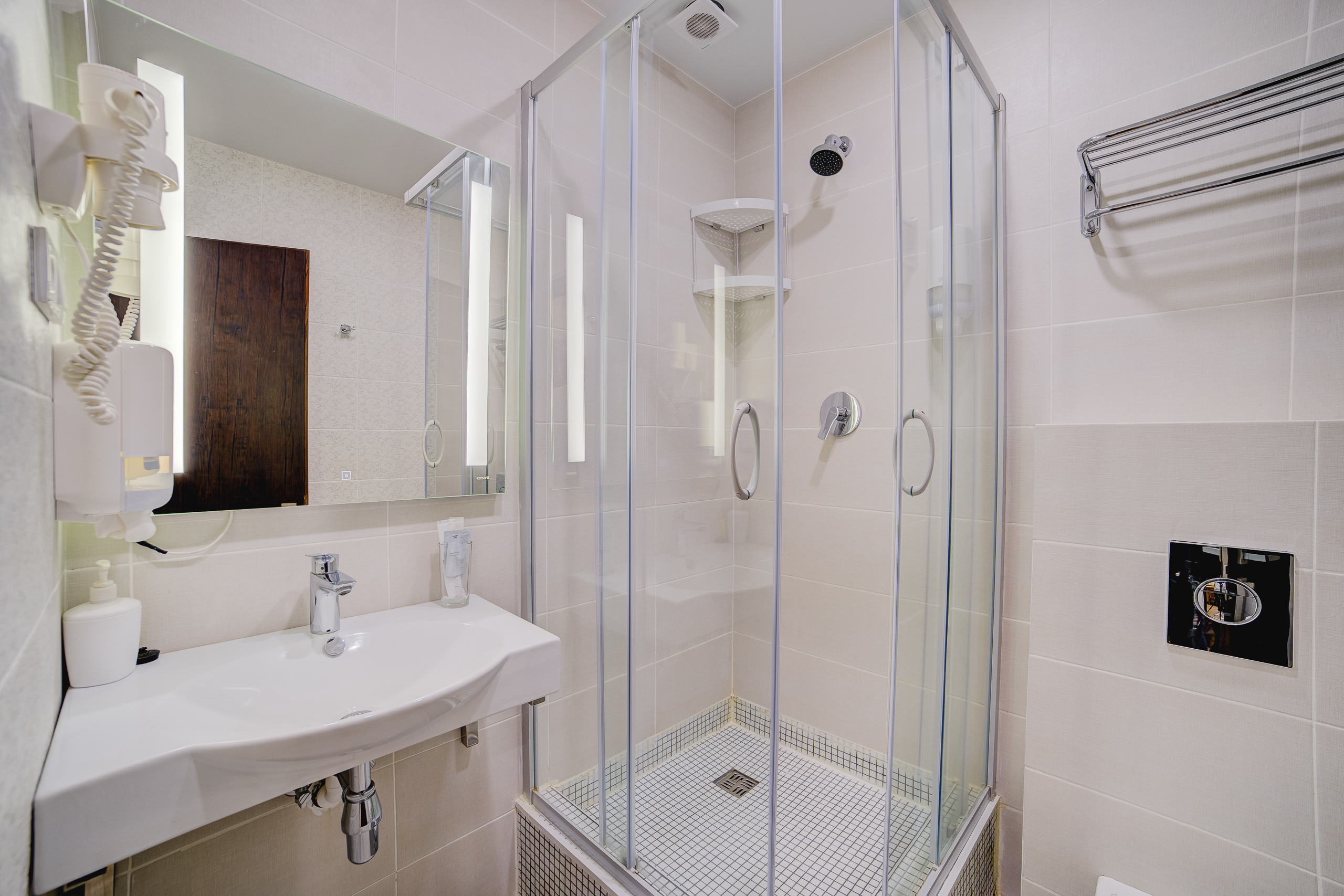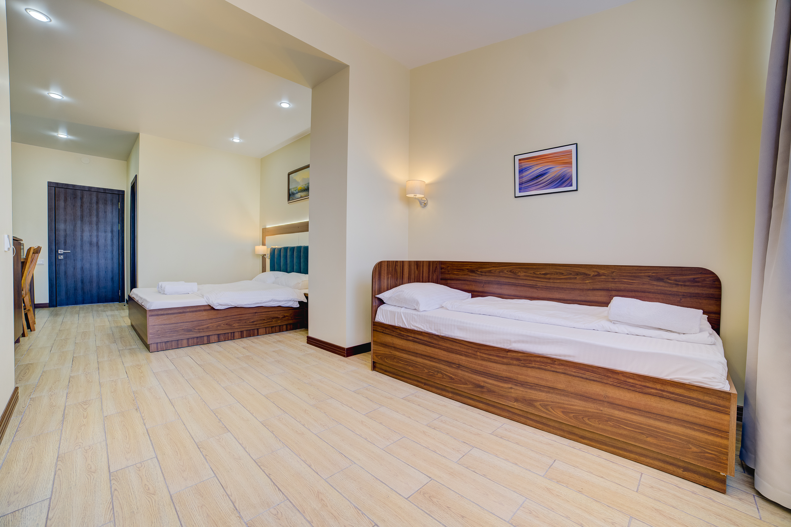 В номере: душ, туалет, ТВ, холодильник, кондиционер, сейф, фен, электрочайник, СВЧ-печь, двуспальная кровать, две раздельные кровати. Площадь комнаты 25 кв.м. К вашим услугам: двуспальная кровать, две односпальные кровати с ортопедическими матрасами, кондиционер, телевизор, холодильник, микроволновая печь, чайник, набор посуды, сейф, тапочки. С/у с душевой кабинкой, фен, гигиенические наборы, мыло, гель, шампунь. На этаже расположена кухня общего пользования