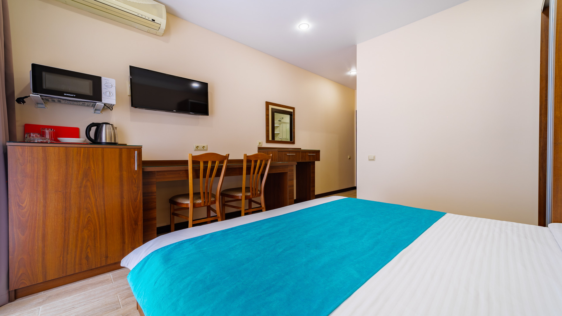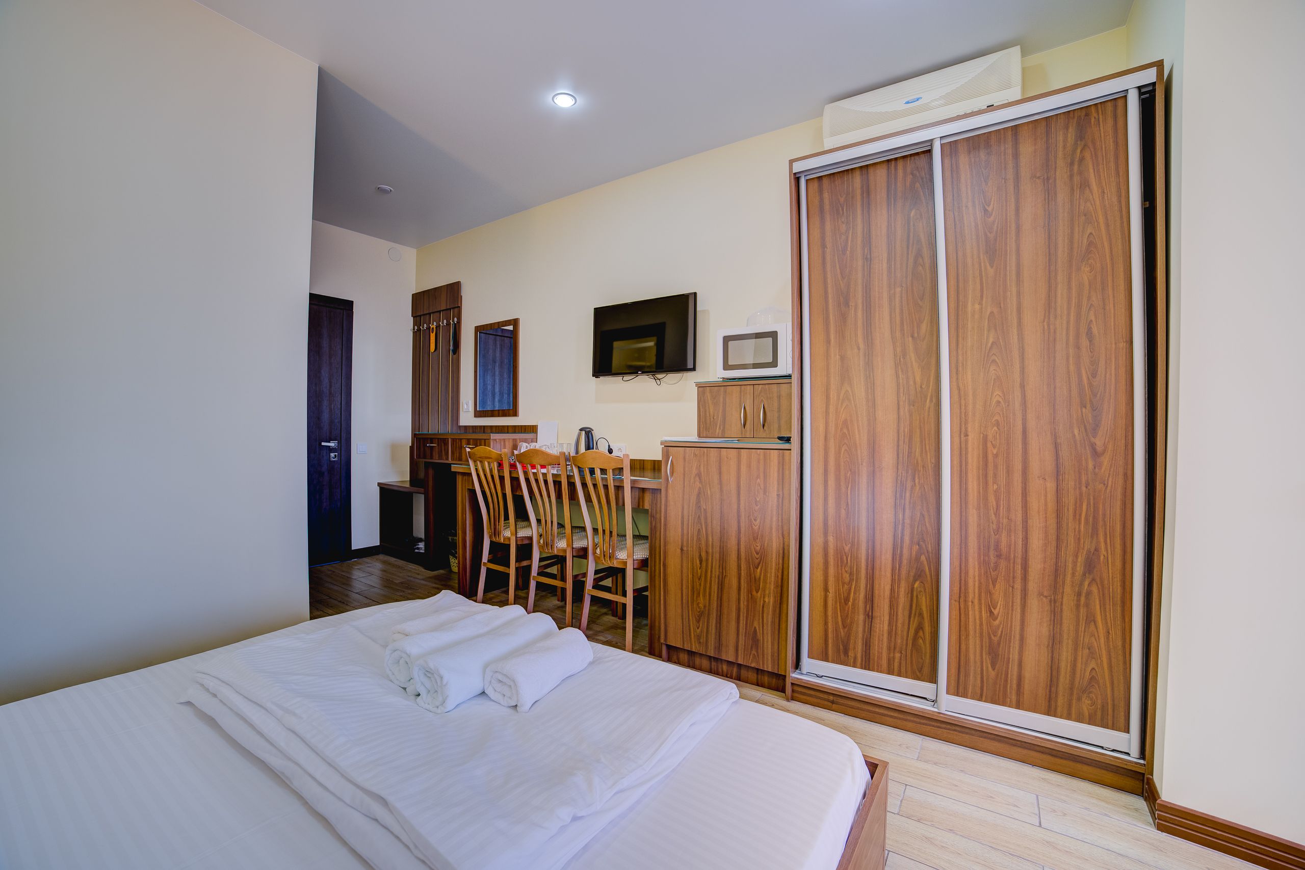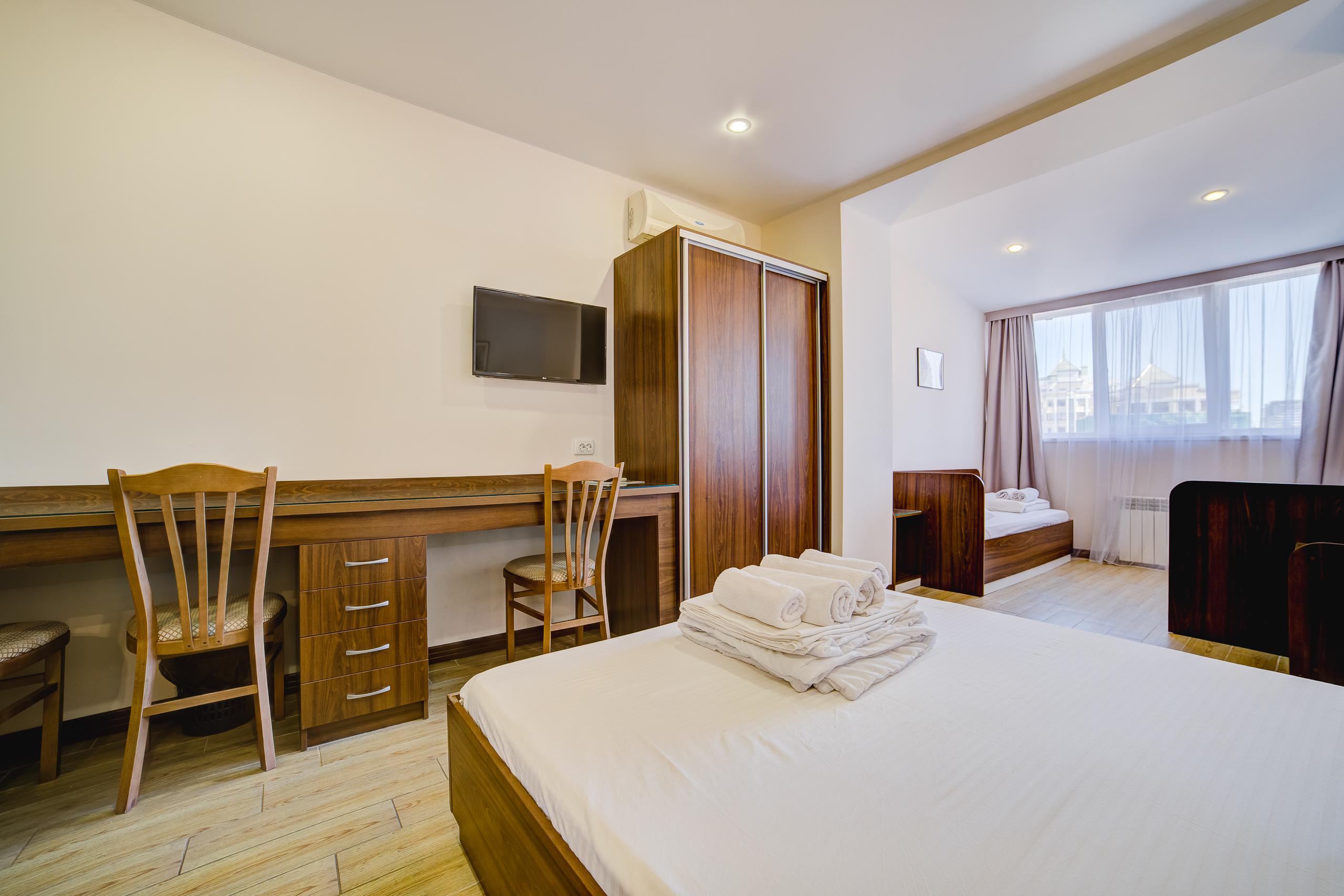 В номере: душ, туалет, ТВ, холодильник, кондиционер, сейф, фен, электрочайник, СВЧ-печь, двуспальная кровать, балкон (Вид на город). Площадь комнаты – 16 кв.м. Двуспальная кровать, телевизор, холодильник, набор посуды, тапочки, туалетные средства, банные полотенца, кондиционер, автономное отопление (зимой), с/у с душевой кабинкой, французский балкон (вид на город), WI-FI. Уборка – ежедневно, смена постельного белья – раз в три дня.
