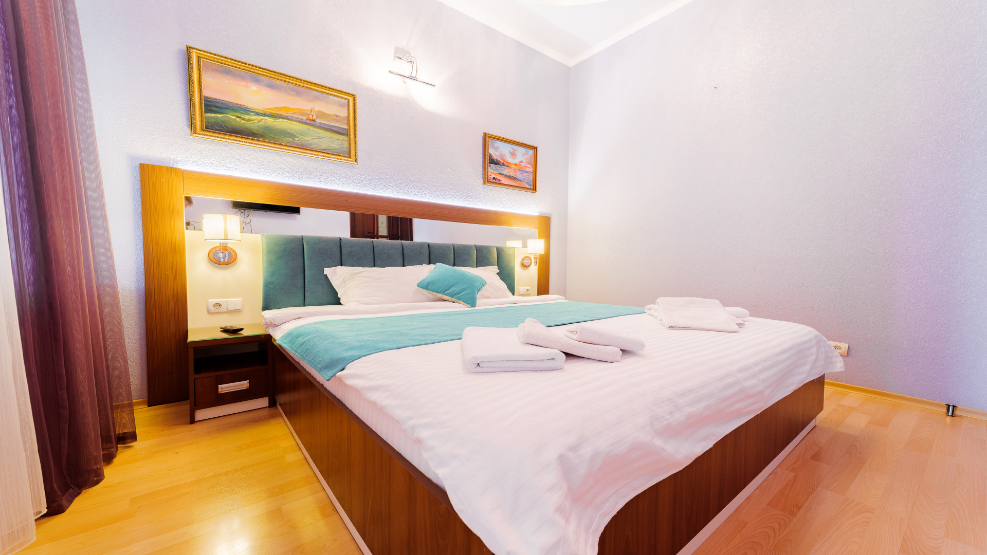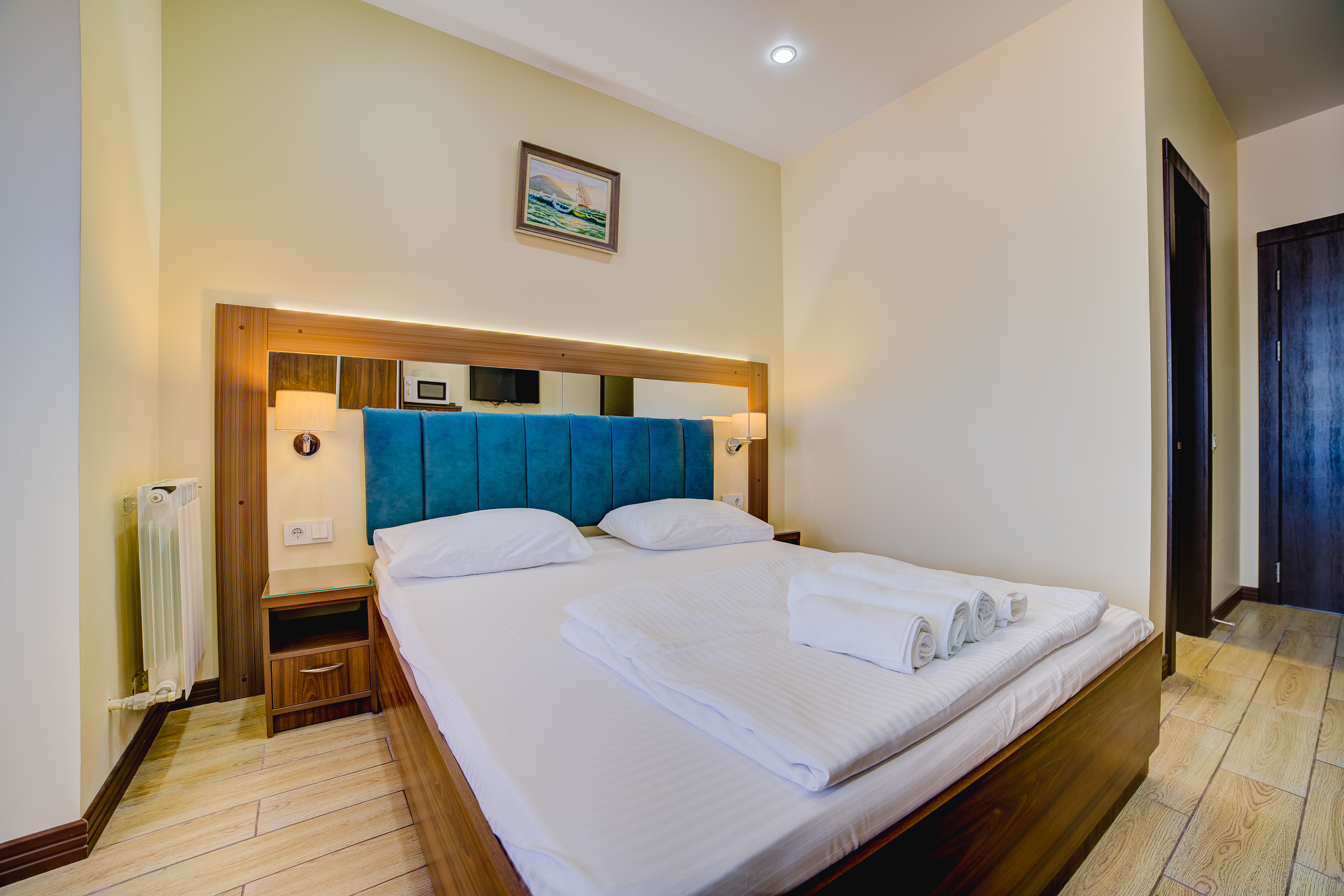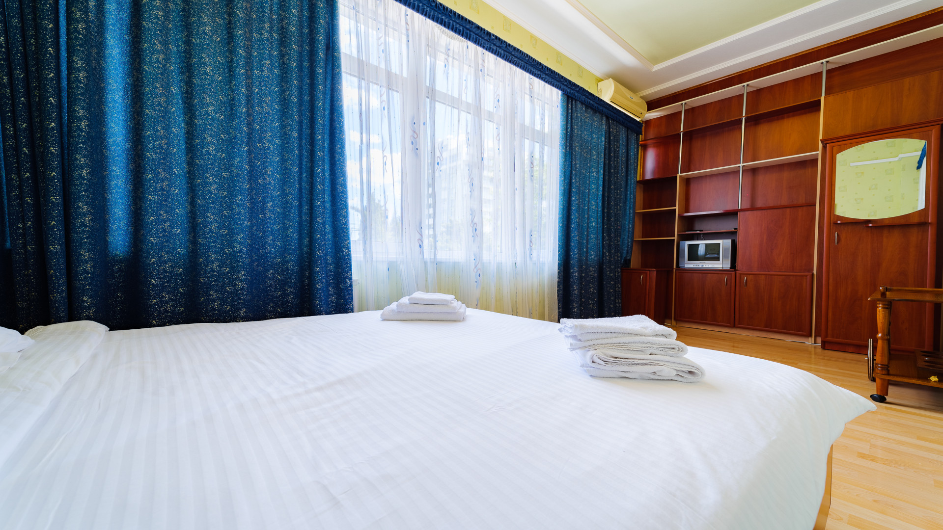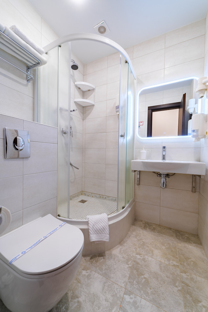 В номере: душ, туалет, ТВ, холодильник, кондиционер, сейф, фен, электрочайник, СВЧ-печь, двуспальная кровать, балкон (Вид на город). Площадь комнаты – 16 кв.м. Двуспальная кровать, телевизор, холодильник, набор посуды, тапочки, туалетные средства, банные полотенца, кондиционер, автономное отопление (зимой), с/у с душевой кабинкой, французский балкон (вид на город), WI-FI. Уборка – ежедневно, смена постельного белья – раз в три дня.