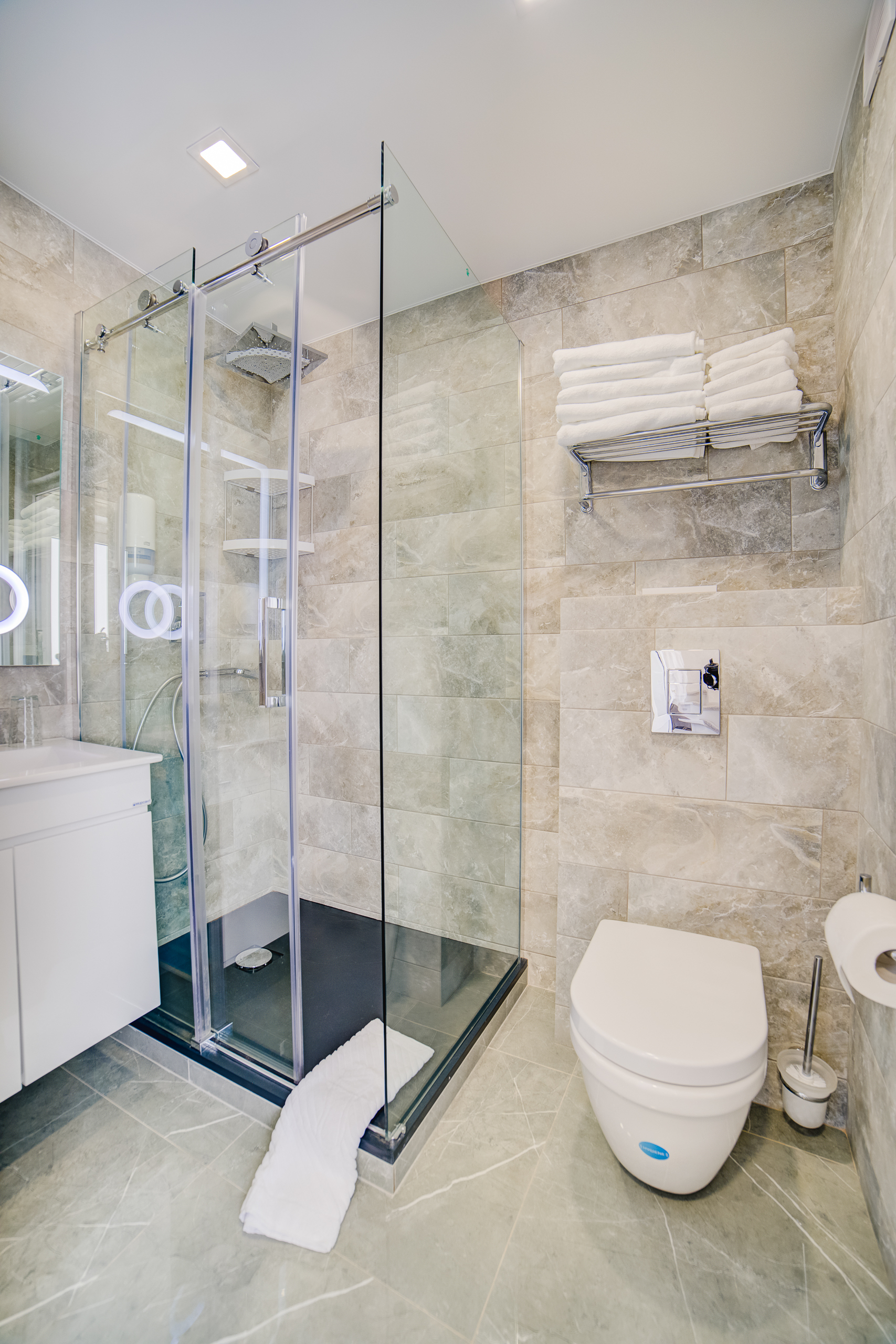 В номере: душ, туалет, ТВ, холодильник, кондиционер, сейф, фен, мини-кухня, электрочайник, СВЧ-печь, двуспальная кровать, две раздельные кровати. Площадь комнаты – 25 кв.м. К вашим услугам: двухспальная кровать, две односпальных кровати с ортопедическими матрасами, оборудованная кухня с посудой и электрической плитой, стиральная машина, холодильник, чайник, микроволновая печь, кондиционер, сейф, телевизор, тапочки. С/у с душевой кабинкой, фен, гигиенические наборы, мыло, гель, шампунь. На этаже расположена кухня общего пользования