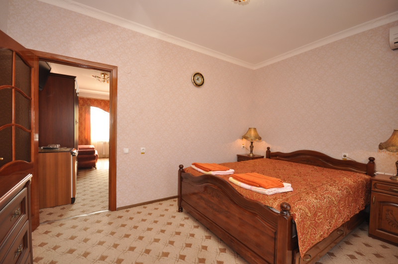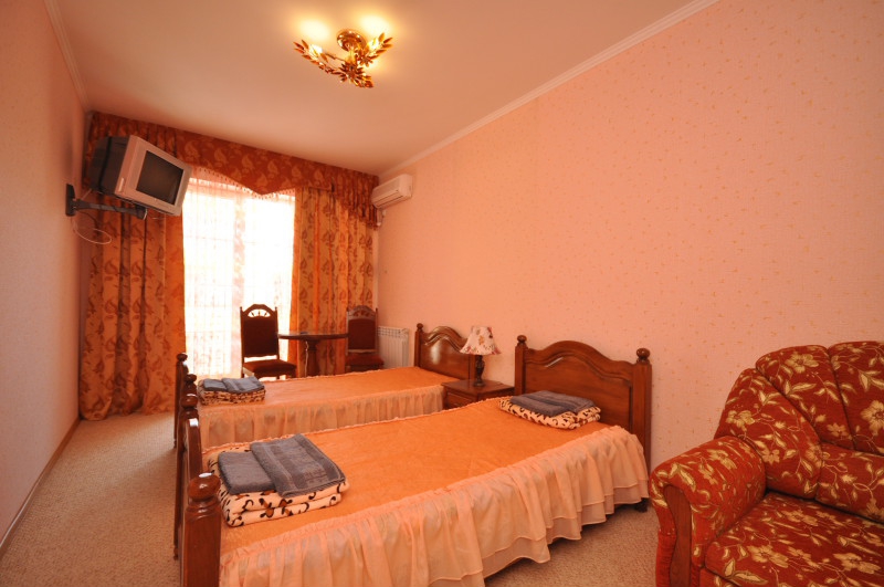 Четырехэтажный корпус отеля занимает небольшую закрытую территорию в 600 метрах от моря. Просторный жилой фонд предлагает однокомнатные и двухкомнатные номера со всеми удобствами. В каждом номере предусмотрен санузел с душем, есть кондиционер, отлично справляющийся с крымской жарой, телевизор и холодильник.