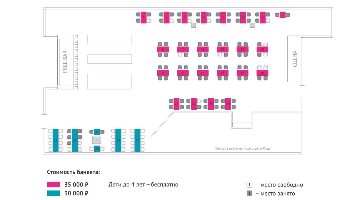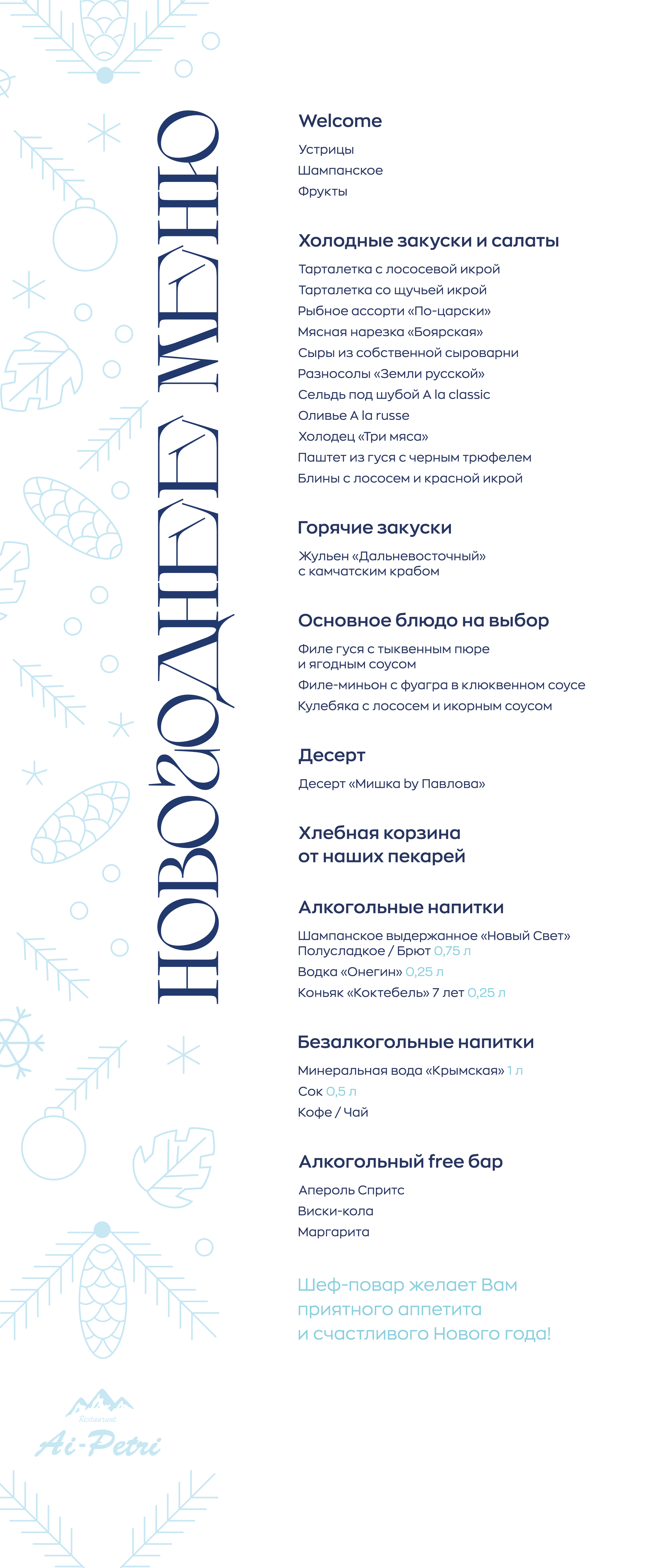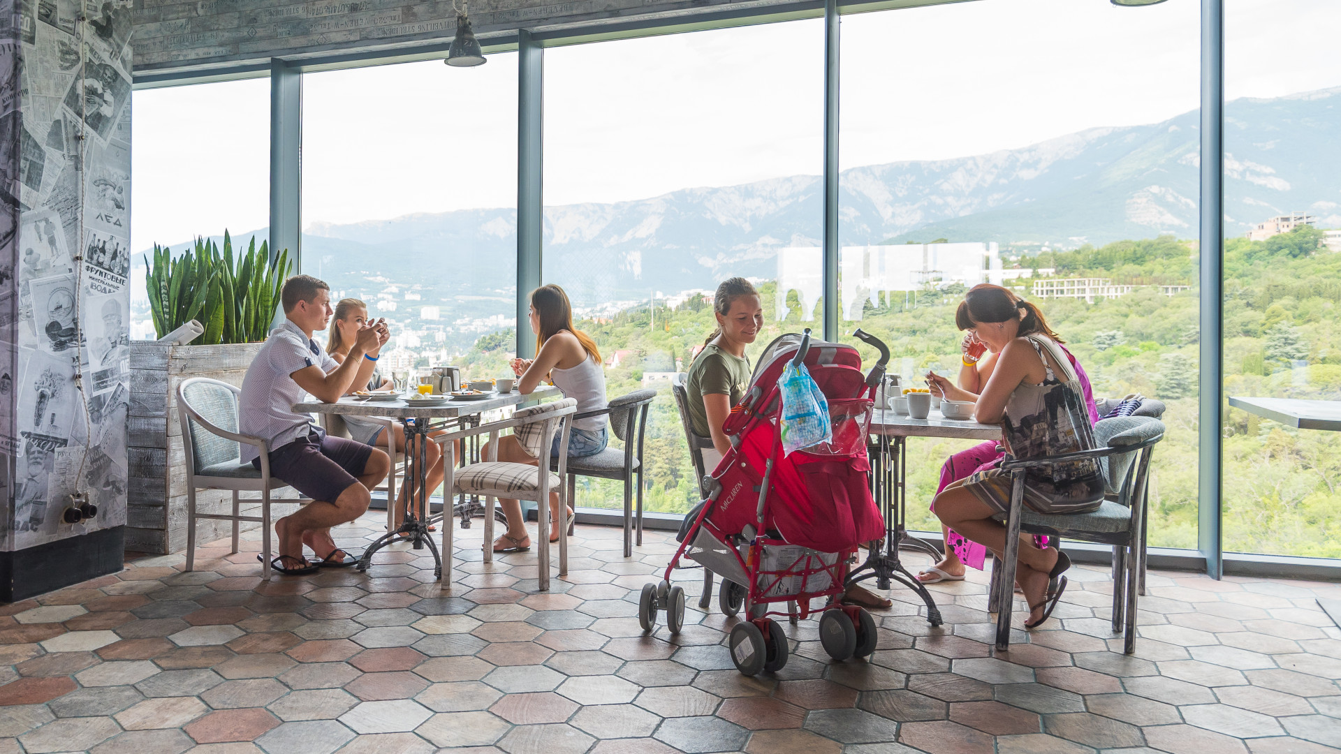 Питание: ресторан (Мраморный, Ай-Петри, Бездна, Ливадия, А-Тавола (итальянский), Мамины Пельмешки (домашняя кухня), Тюбетейка (восточная кухня), клуб Kiki Beach, клуб Чайка на пляже, этно-кафе Селям Алейкум, кафе Apelsin, Старик и рыба, Синее море), бар (спорт-бары Свисток и Кеды, пул-бар Gazebo), лобби-бар (Cinema), кафе (Amelie, Fresh, винный бутик Хлеб.Сыр.Вино.(широкий ассортимент вин местного и иностранного производства, горячие хлебобулочные изделия ручной работы и более 30 сортов благородного сыра)), room-service