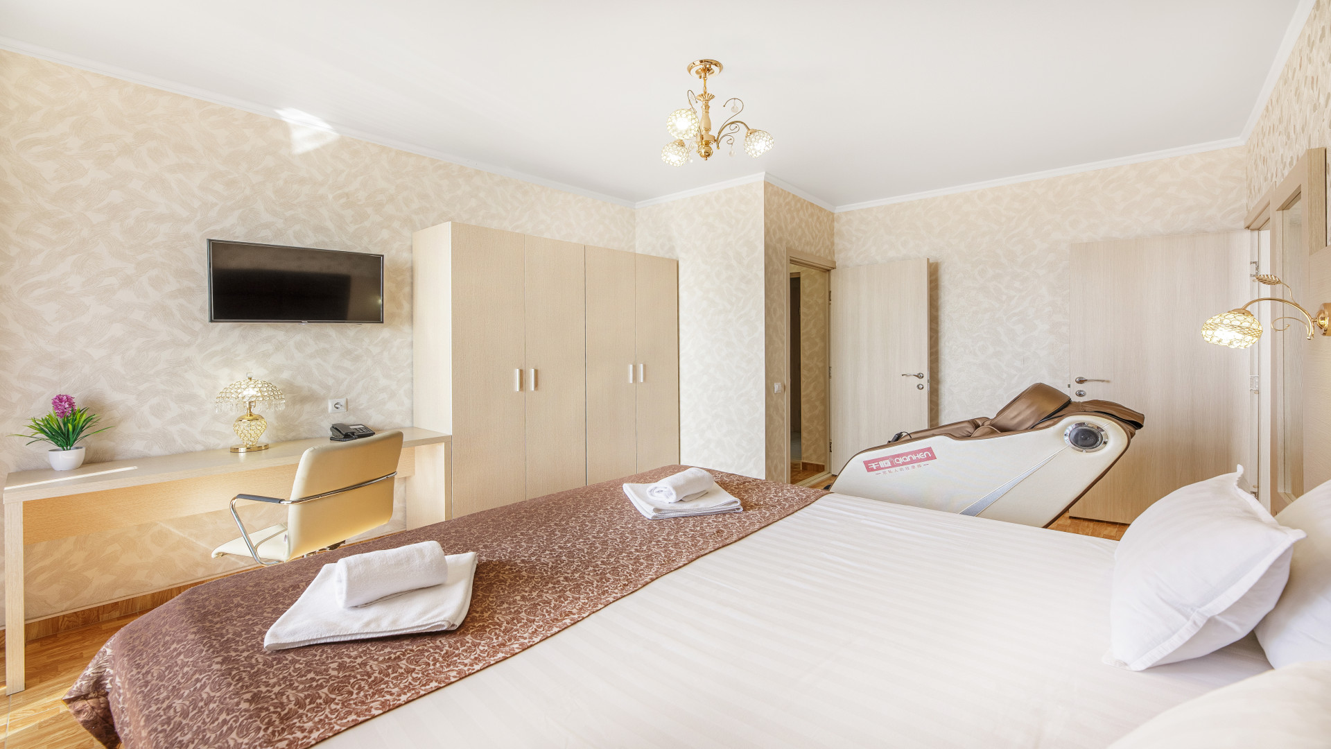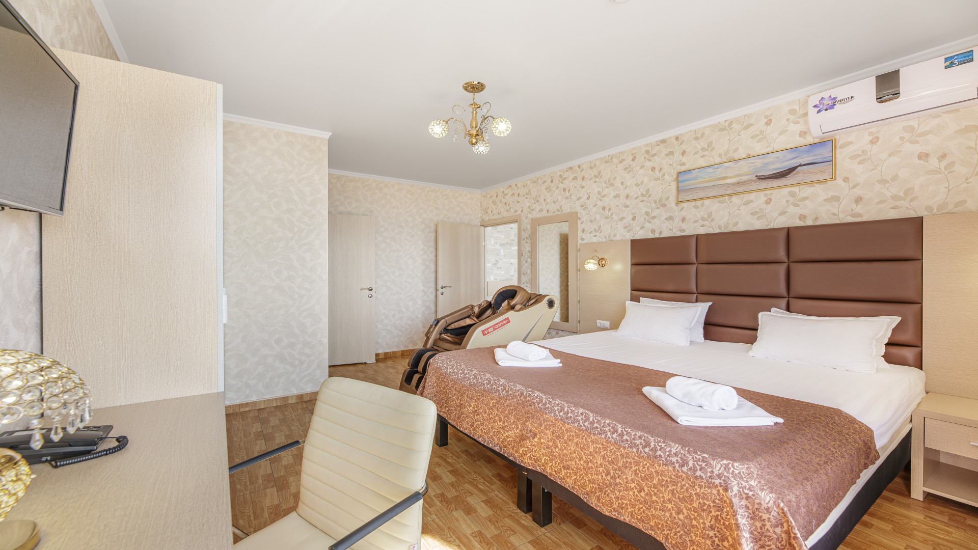 1‑я спальня: двуспальная кровать (или две односпальные), массажное кресло, ТВ, кондиционер, шкаф, гладильная станция.
