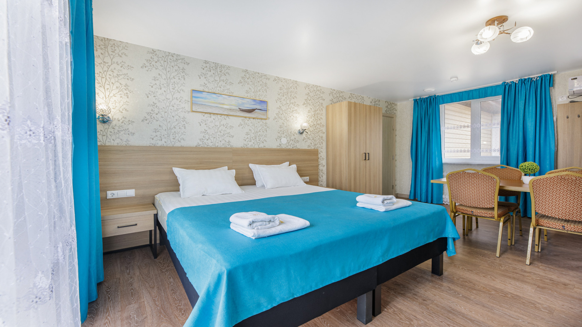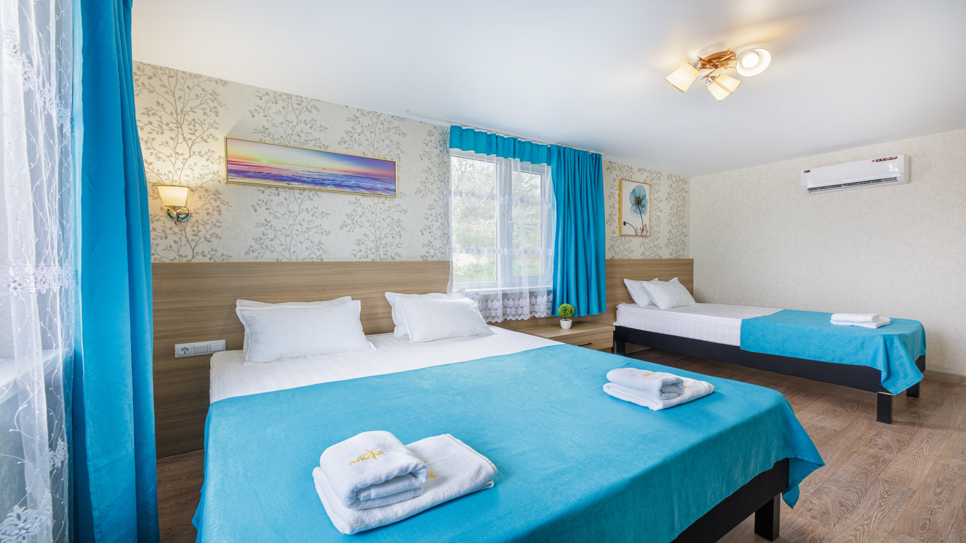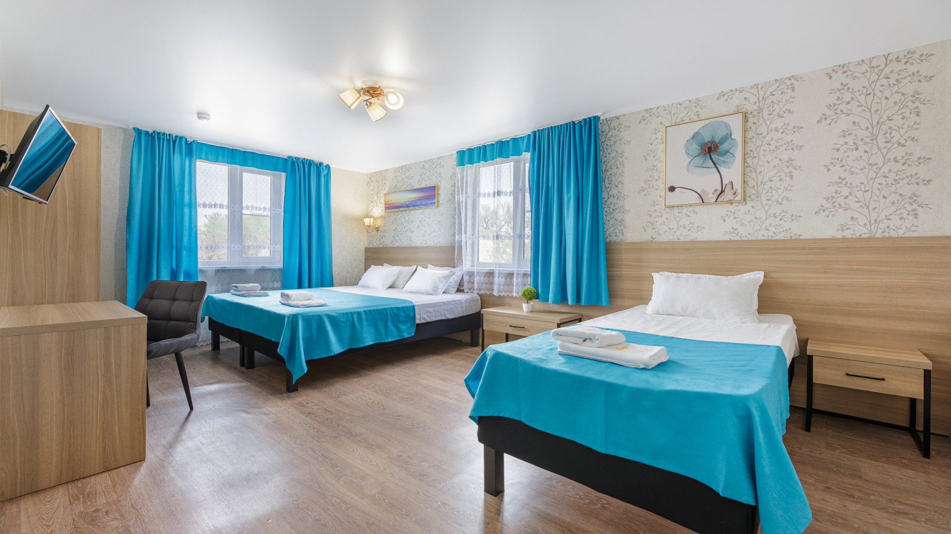 2‑я комната: двуспальная + односпальная кровати (или три односпальные), шкаф, письменный стол, ТВ, кондиционер.