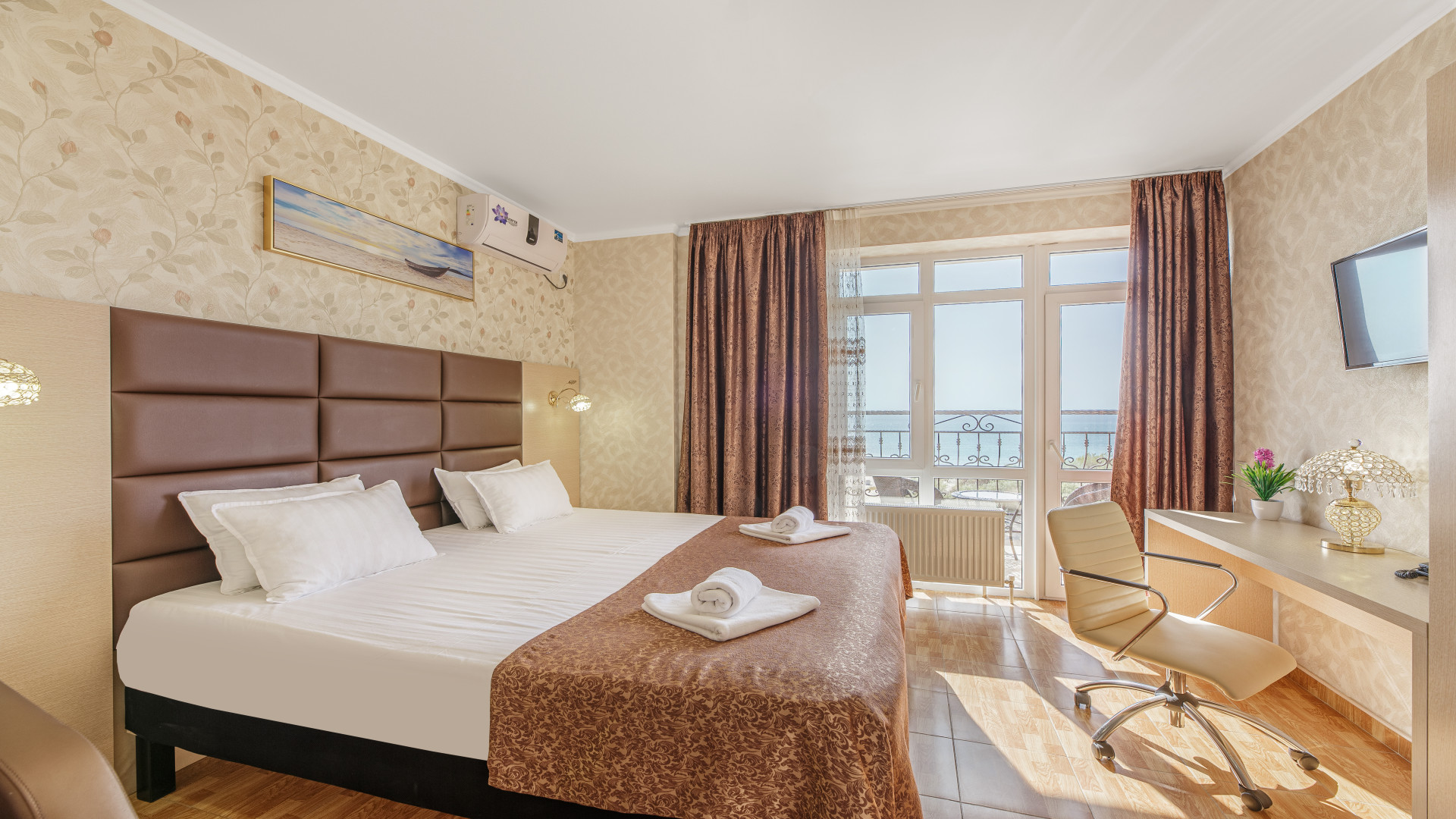 В номере: душ, ванна, туалет, ТВ, холодильник, кондиционер, сейф, фен, телефон, электрочайник, односпальная кровать, двуспальная кровать, кресло, балкон. Однокомнатный номер. В номере: одна двуспальная и одна односпальная кровати (бокс-спринг) или двуспальная и кресло-кровать, плательный шкаф, рабочий стол, кресло, подставка для чемодана, прикроватные тумбы, зеркало, настенные бра, настольная лампа, сейф, мини-холодильник, сплит-система, ЖК-телевизор, чайная станция, телефон, WI-FI, система электронного доступа.