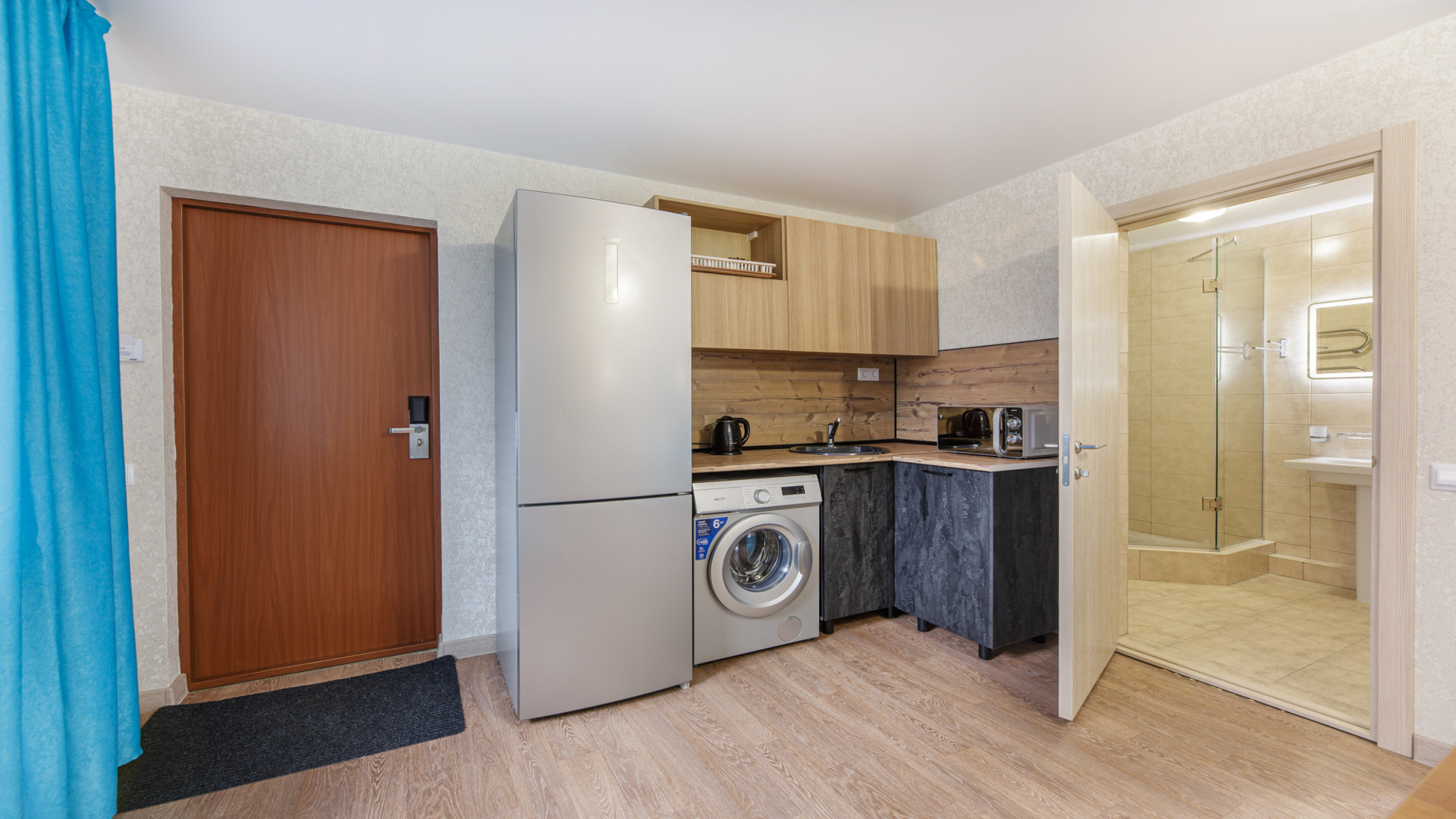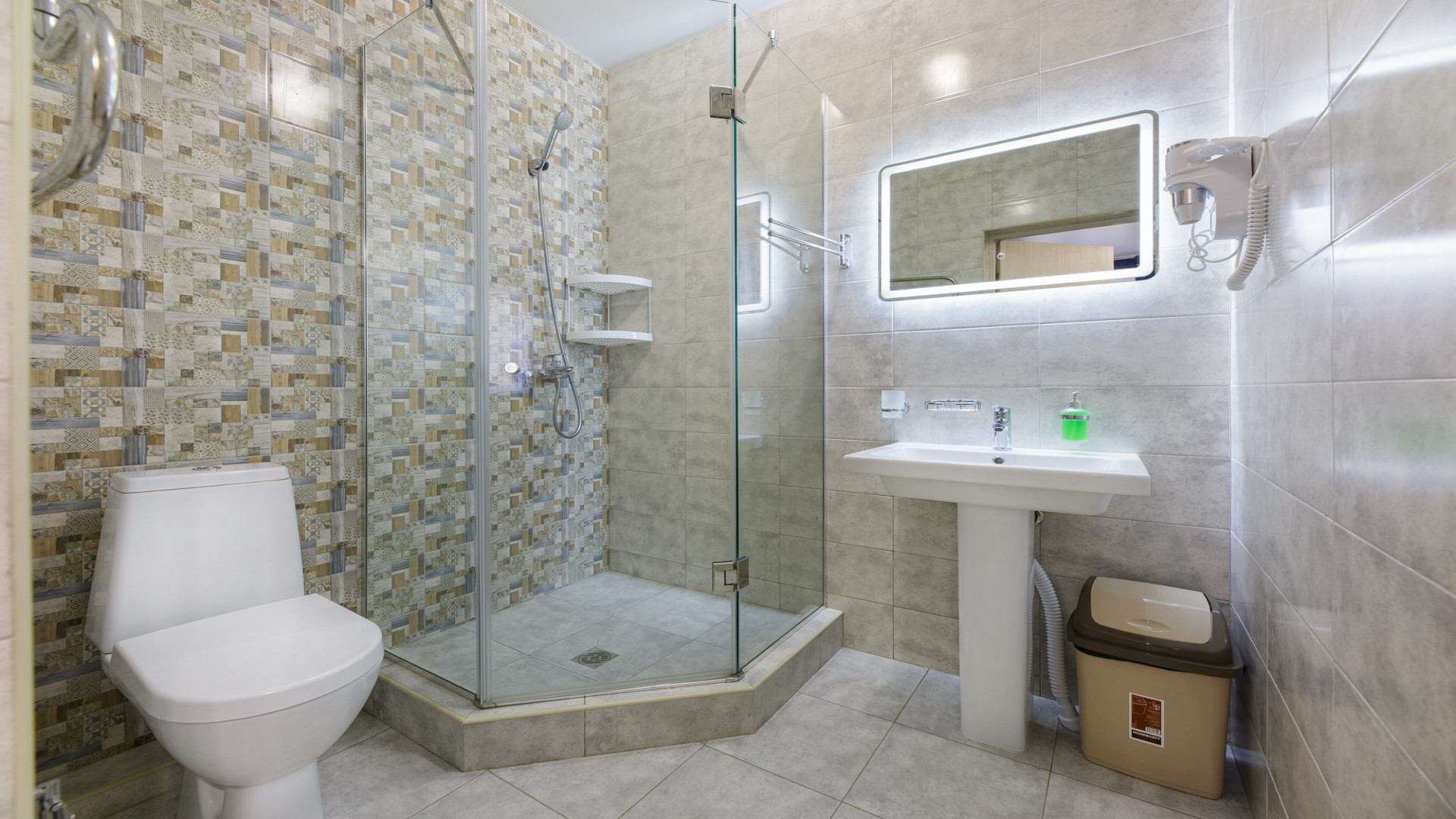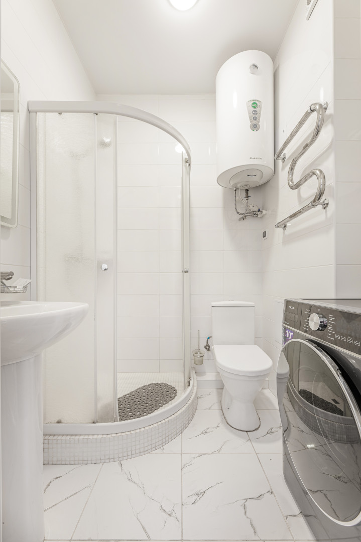 Ванная: душевая кабина, стиральная машина, фен, косметика.