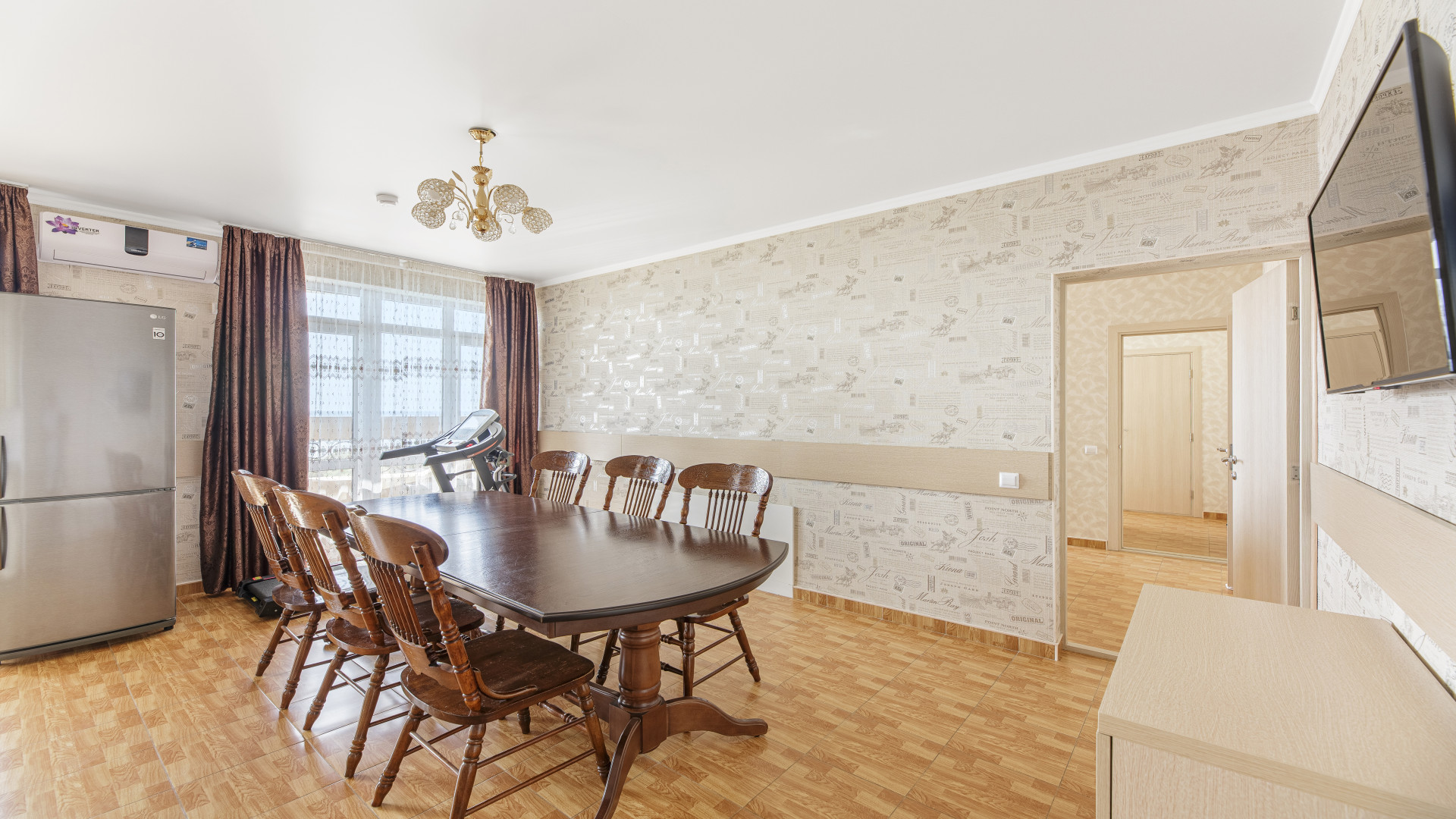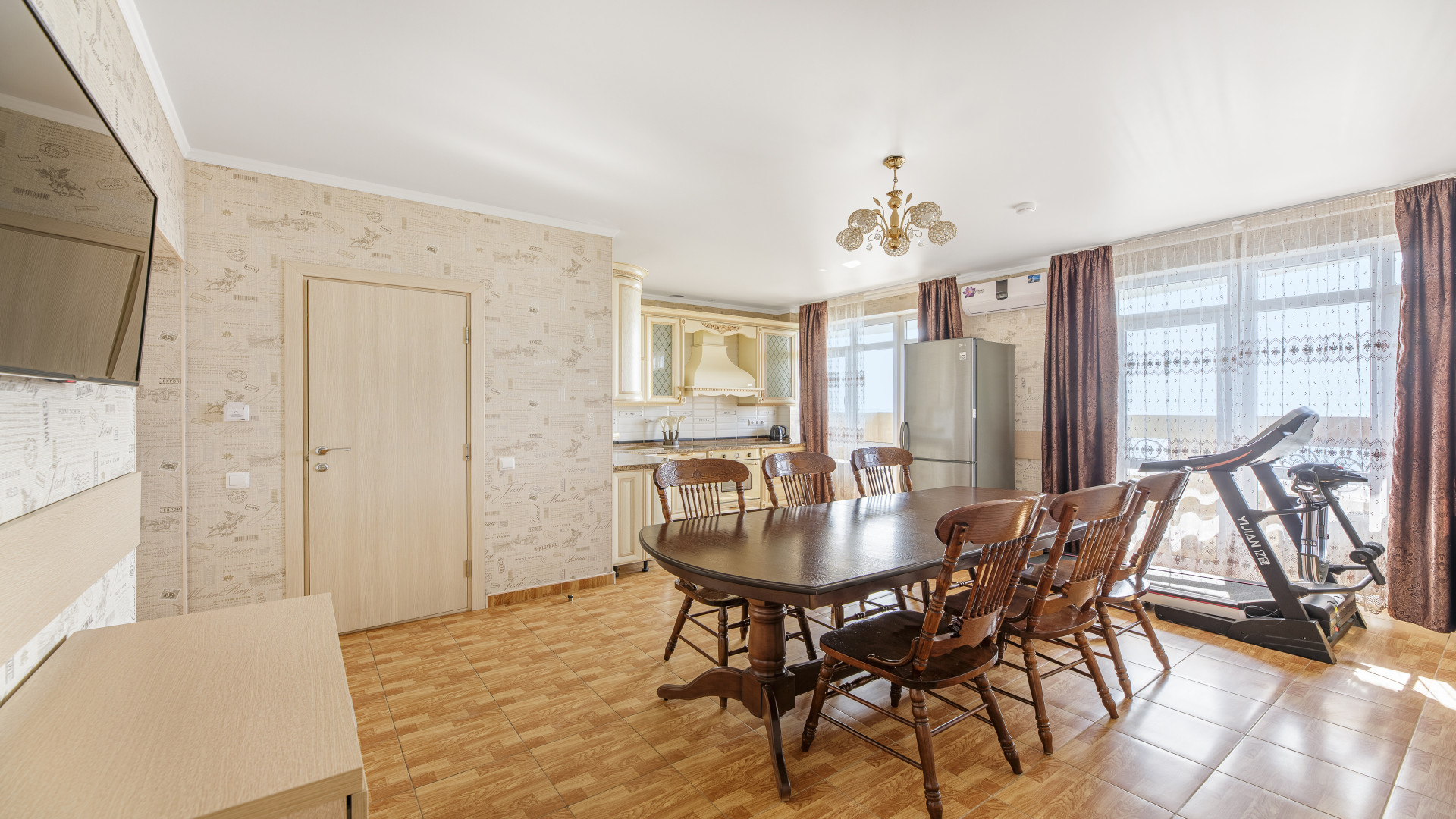Кухня-гостиная: обеденная зона, ТВ, кондиционер, посудомоечная машина, варочная поверхность, микроволновка, кофемашина, холодильник, посуда.