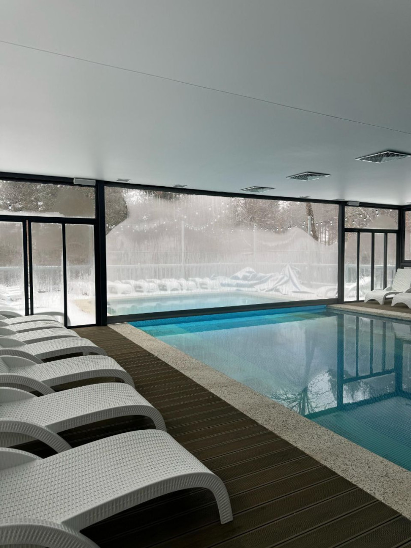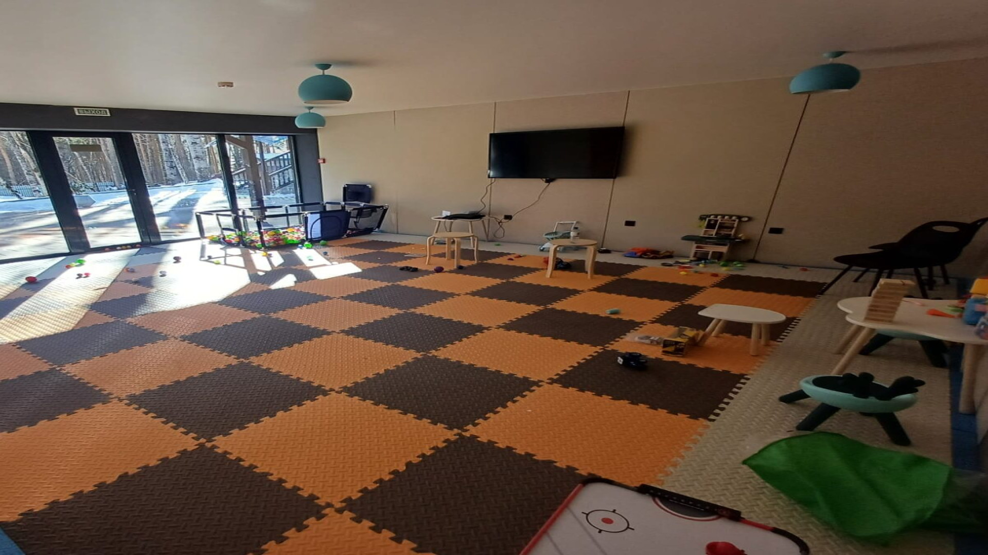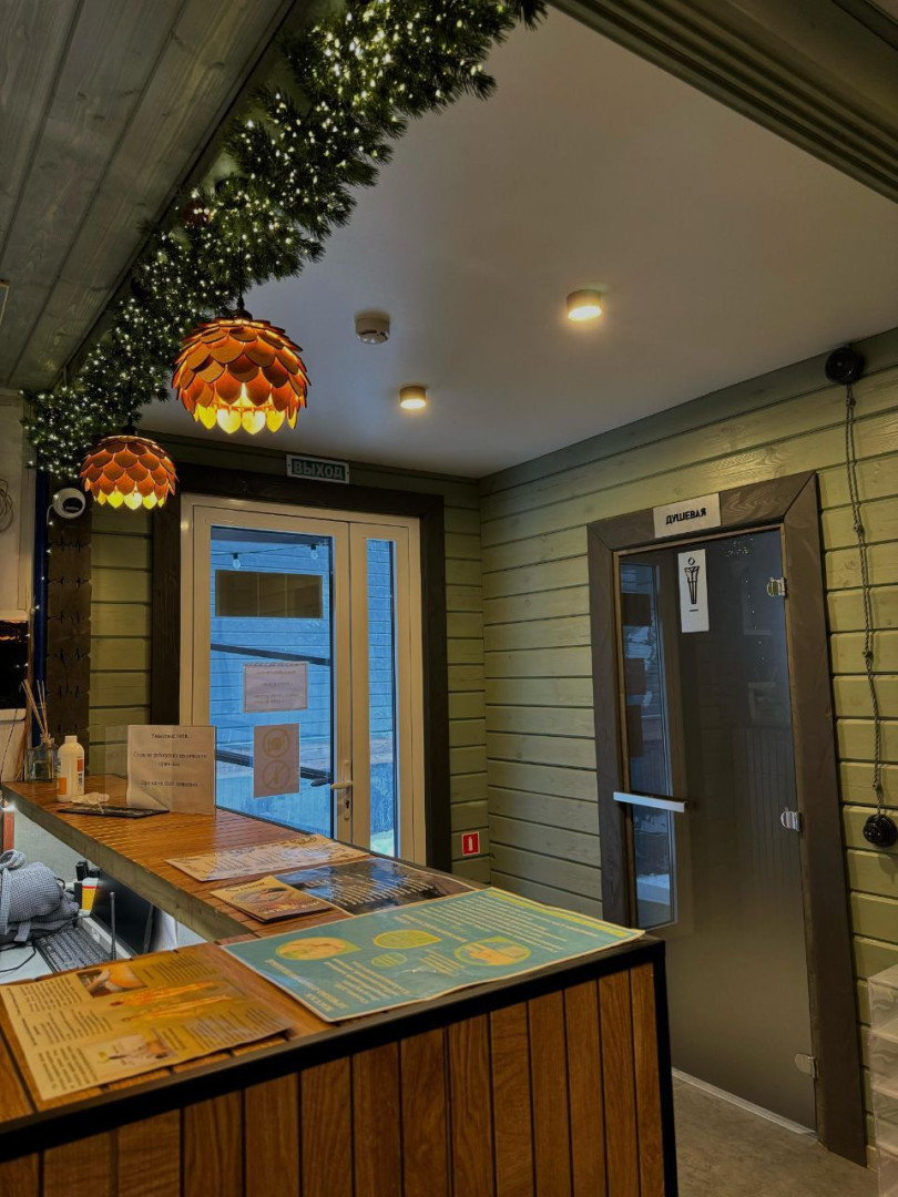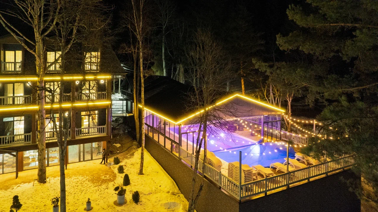 В корпусе: ресепшн, столовая, номерной фонд, бассейн, лыжная комната, детская комната, бар