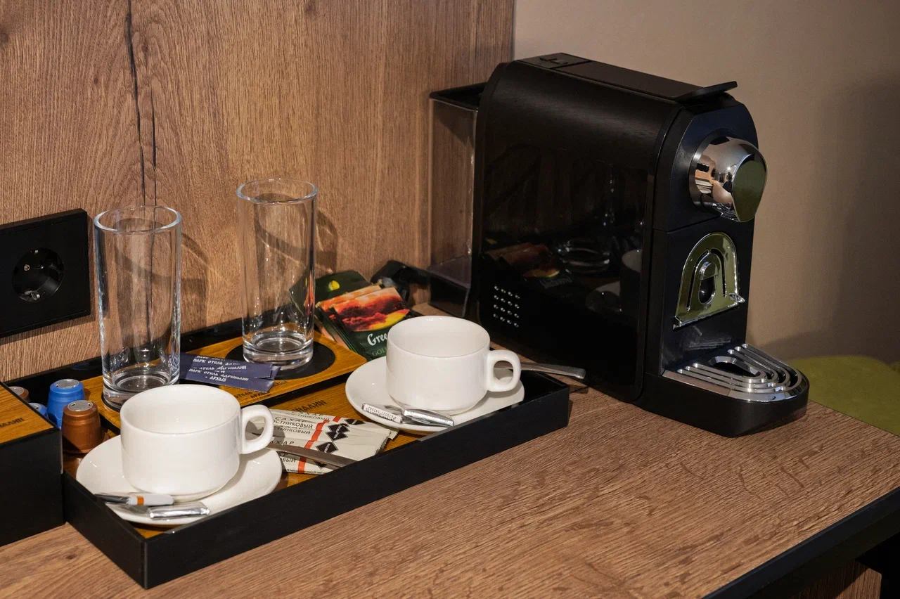 В номере дополнительно: платяной шкаф, тумбочки, стол, кофемашина, мини бар, чай, сахар, чайная пара, стаканы.