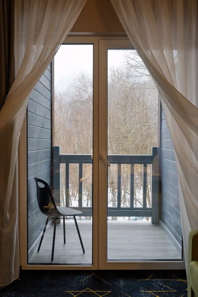 Панорамные окна открывают потрясающий вид на горы и лес, а уютный балкон позволит насладиться горным воздухом.