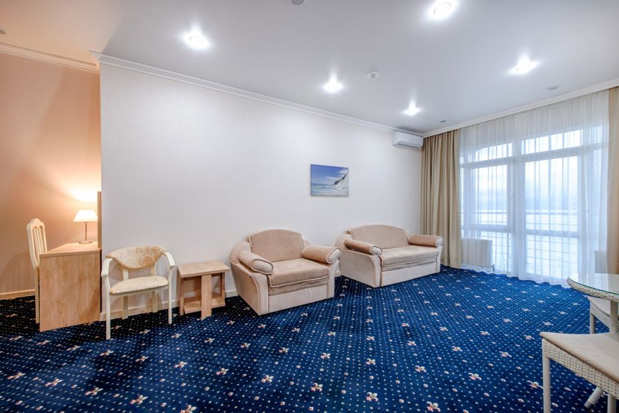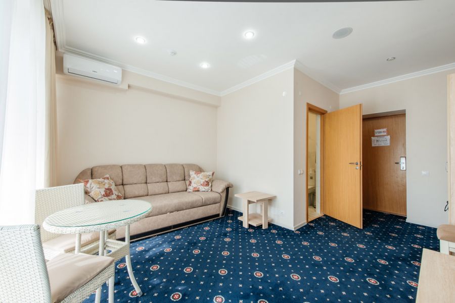 В номере: душ, туалет, ТВ, холодильник, кондиционер, сейф, фен, телефон, двуспальная кровать, диван, предоставляются пляжные полотенца, набор посуды, тапочки, шампунь, гель для душа, шапочка, мыло, швейный набор; по запросу: бритвенный и зубной наборы.. Комфортабельные двухкомнатный номер с гостиной и спальней, на полу ковровое покрытие. В спальне - одна большая кровать и туалетный столик. Окна номера выходят во двор, на пицундские сосны, боковой вид на море. Идеально подходит для семей с детьми. Максимальное размещение 2+2.