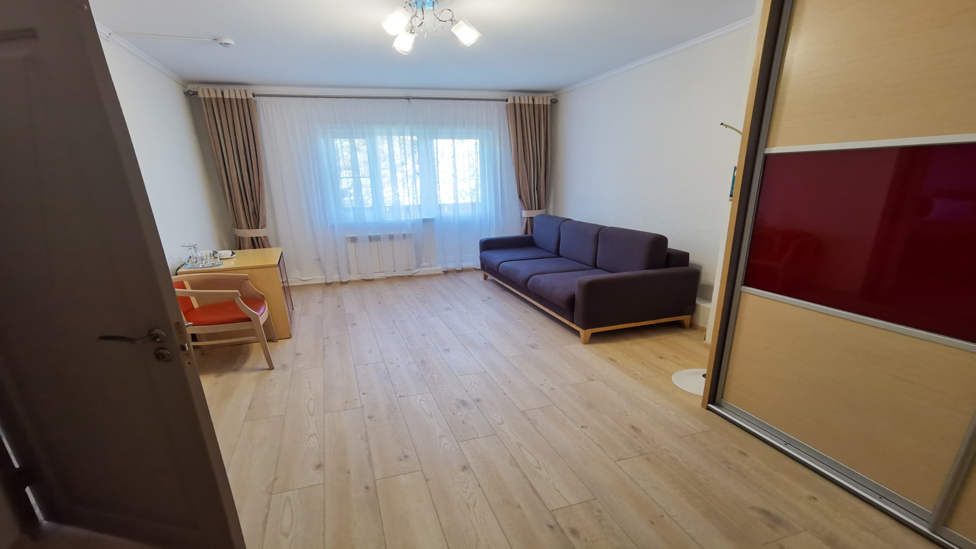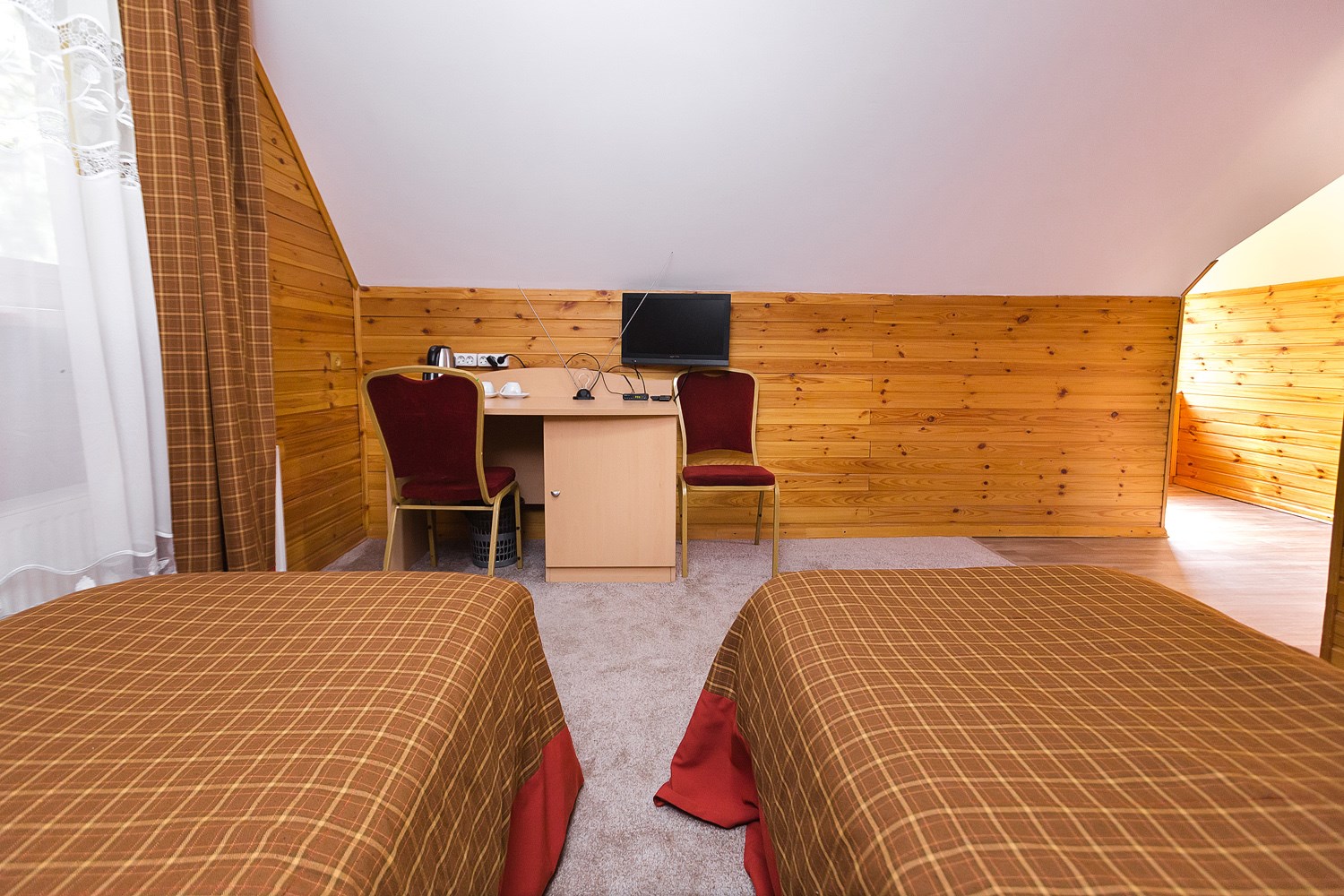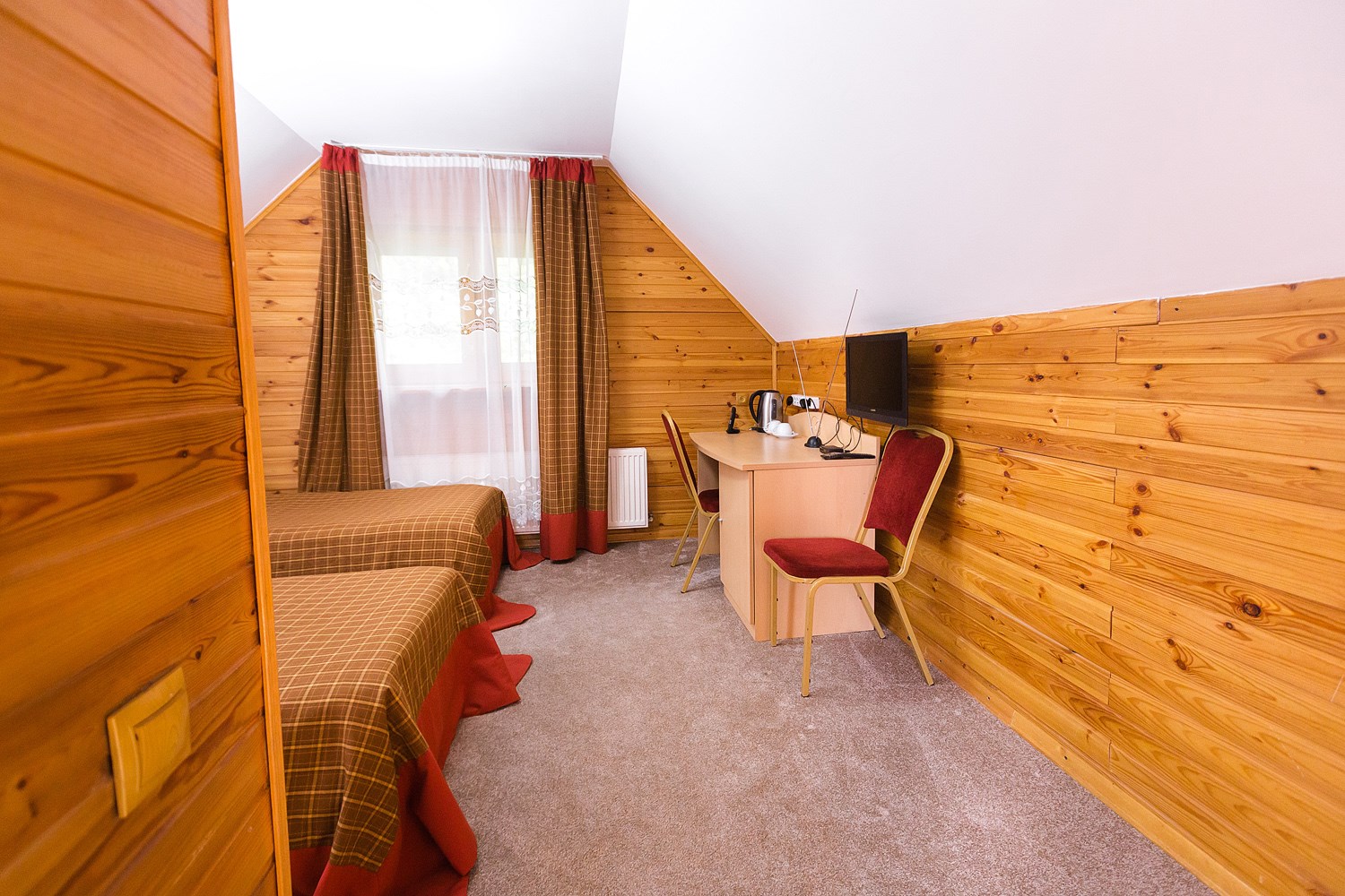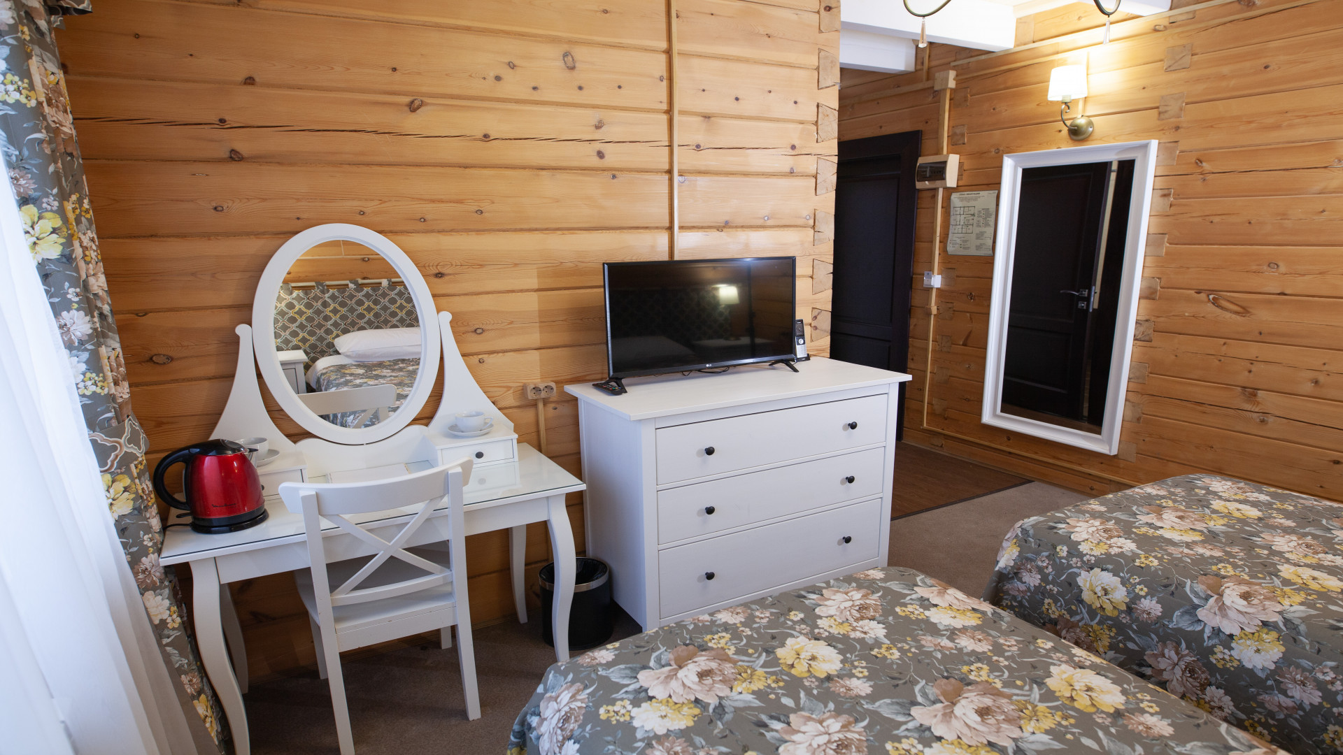 В номере: душ, туалет, ТВ, фен, телефон, электрочайник, две раздельные кровати ((три)), диван, wi-fi. В спальне – две односпальные кровати, в гостиной – одна односпальная кровать. Особенности номера: Номер расположен на 2-м этаже двухэтажного деревянного корпуса без лифта.
