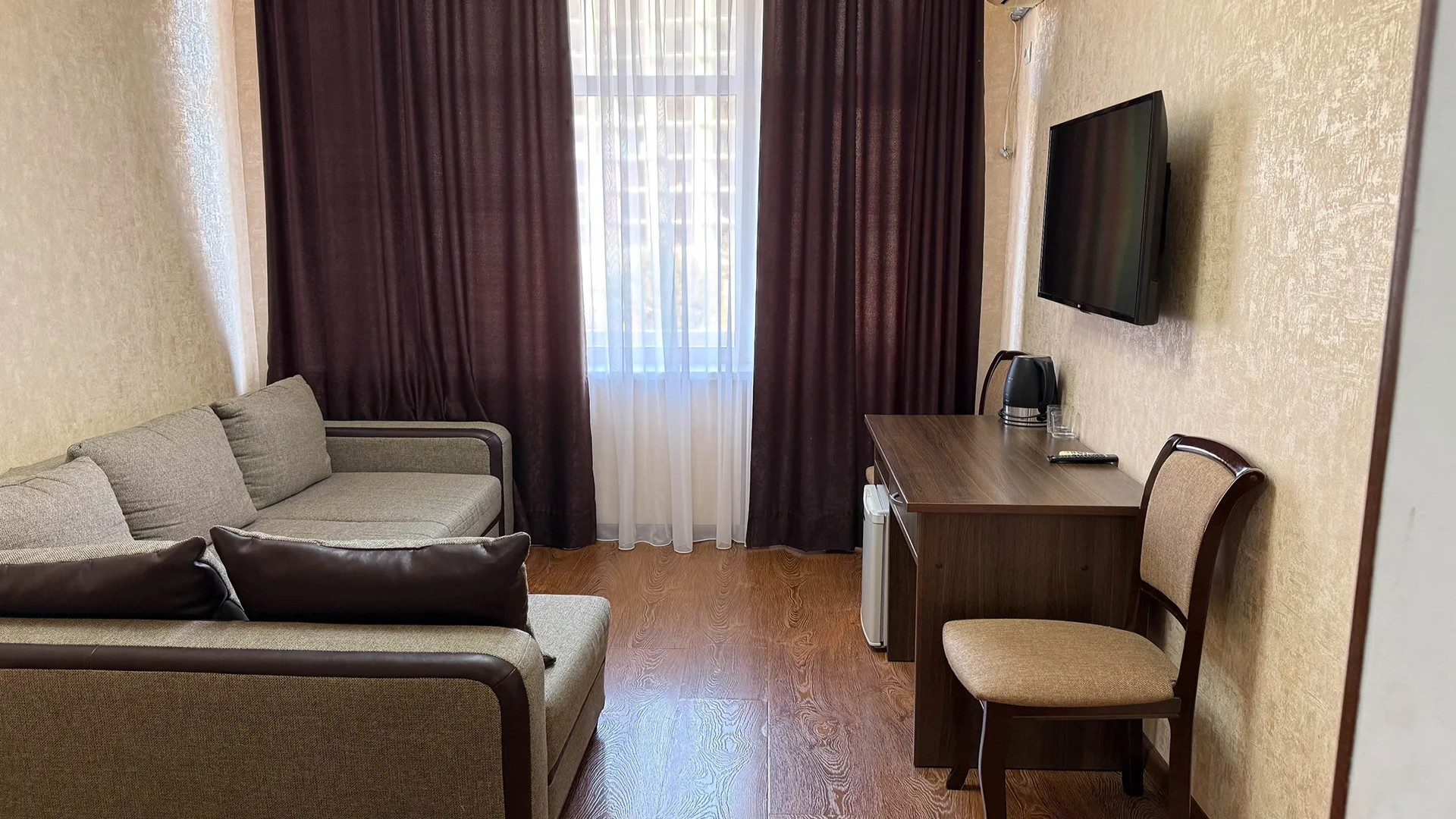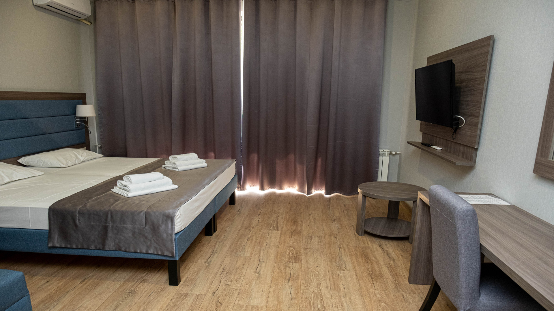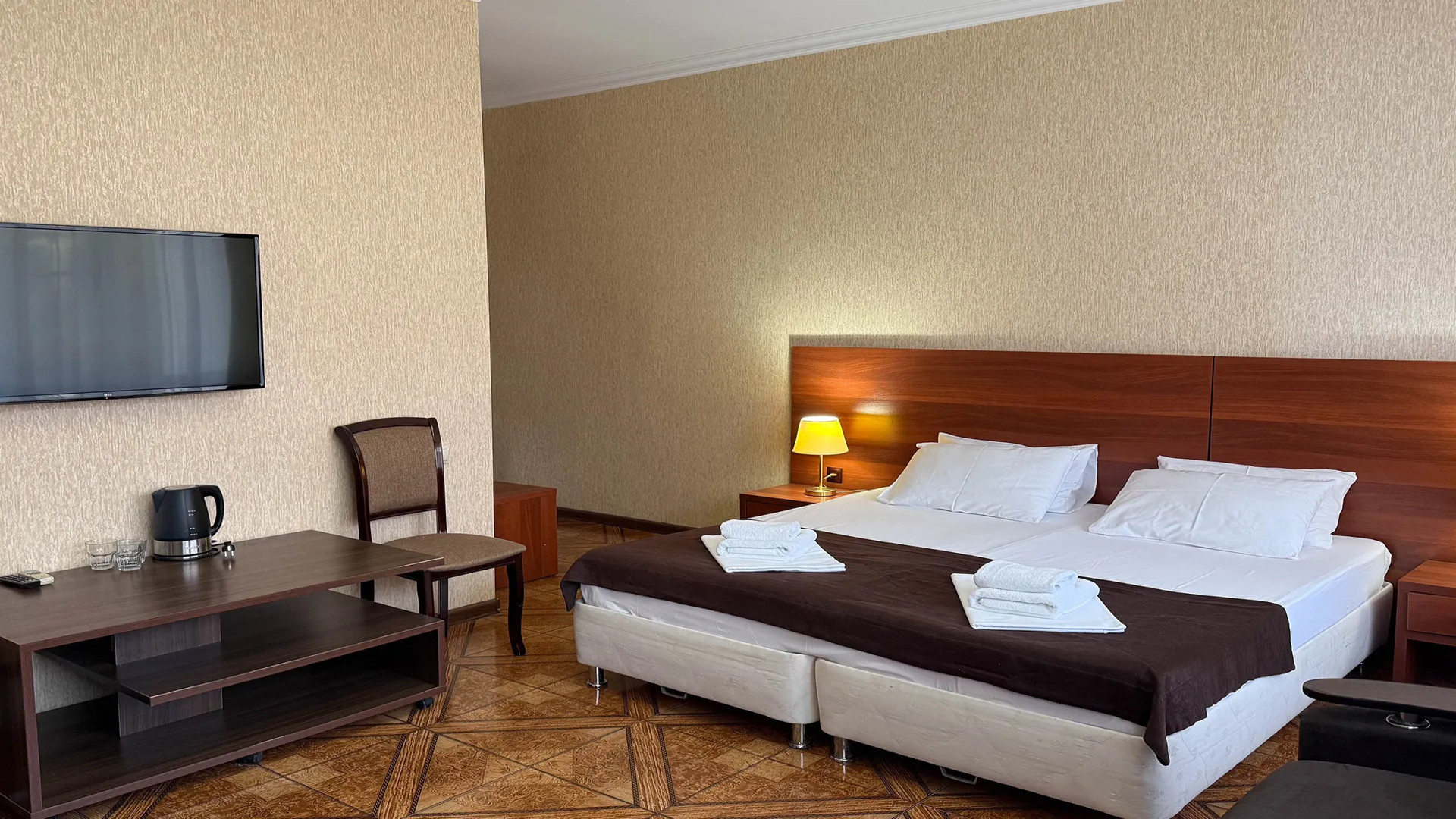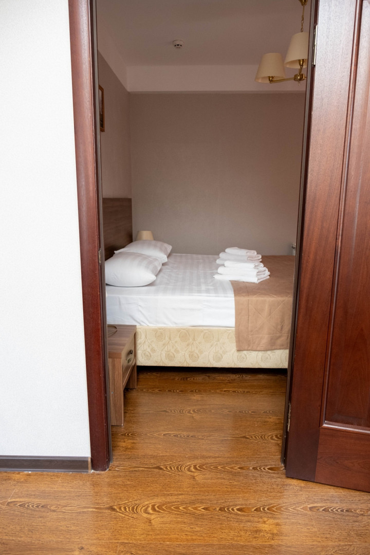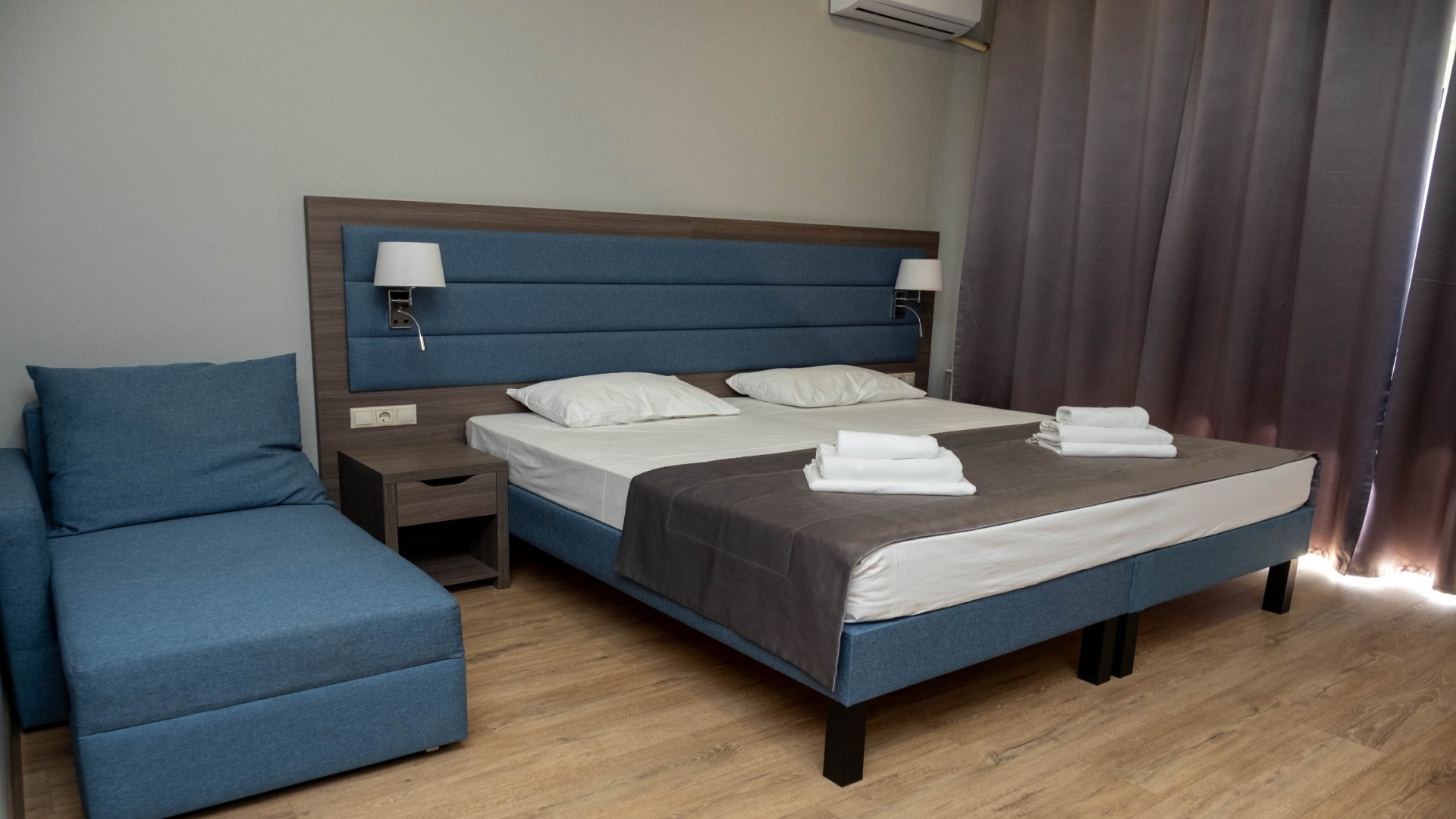 В номере: душ, туалет, ТВ, холодильник, кондиционер, фен, двуспальная или две раздельные кровати, диван