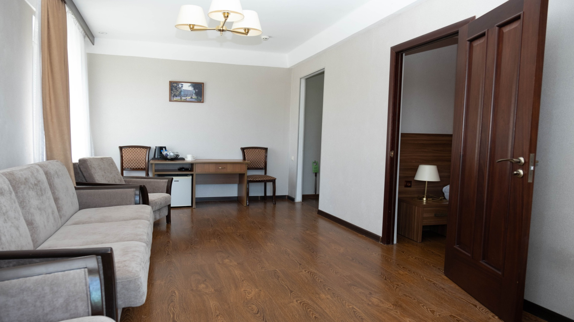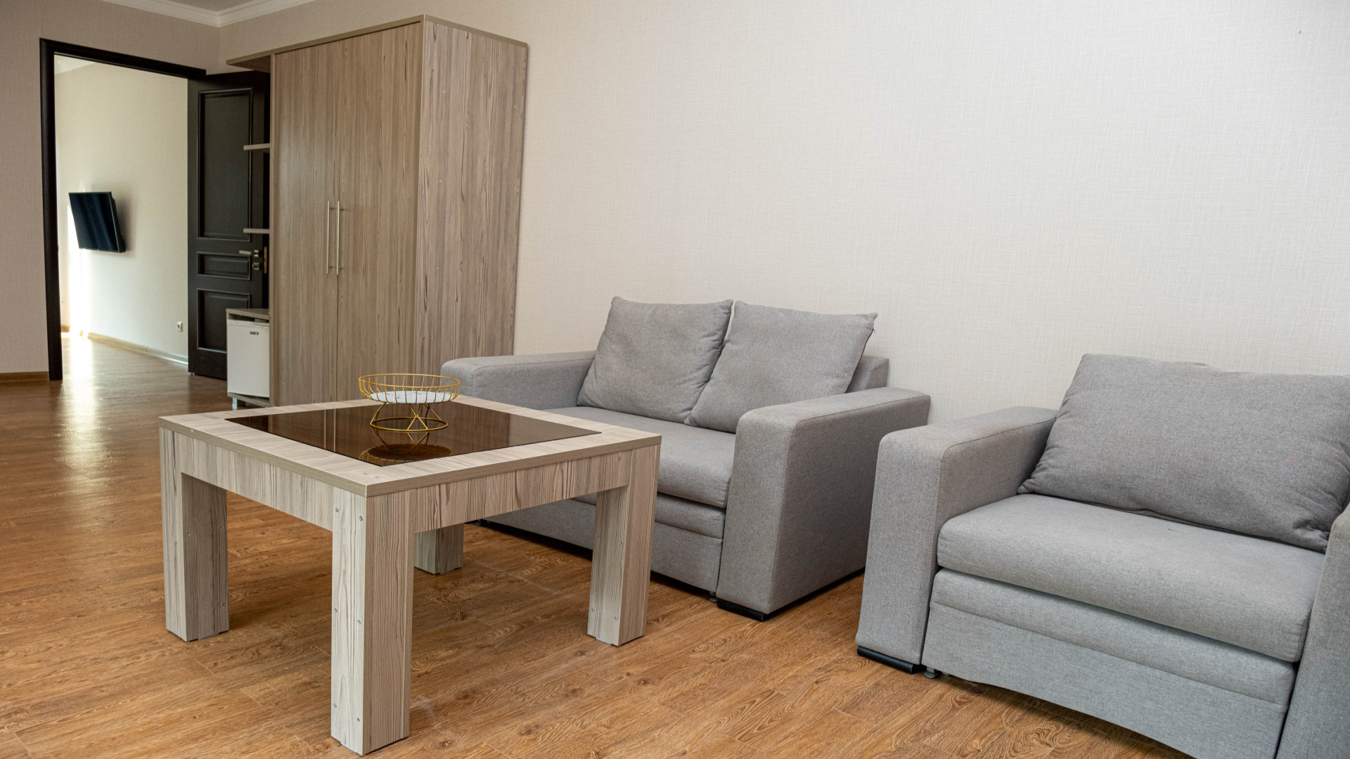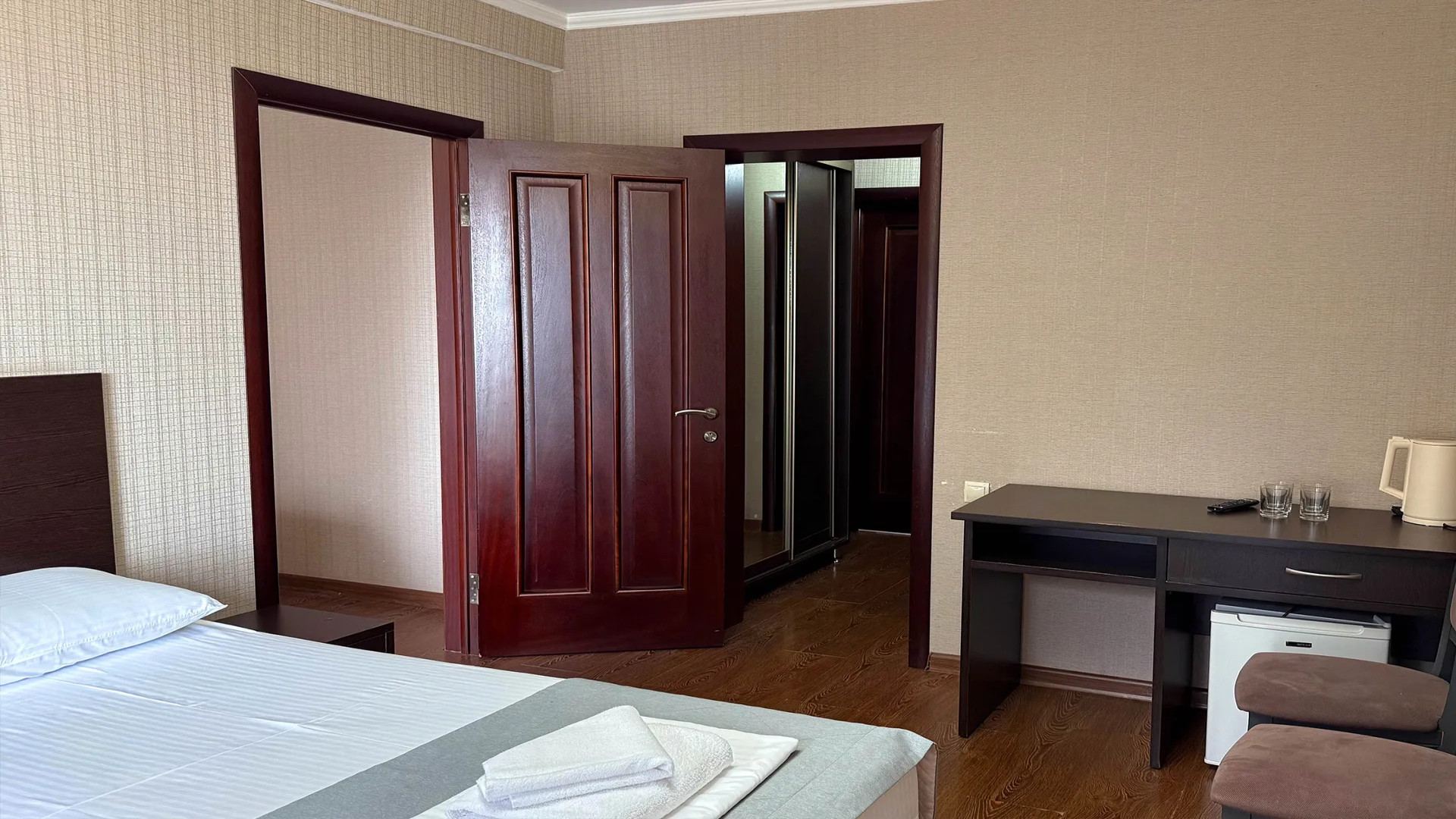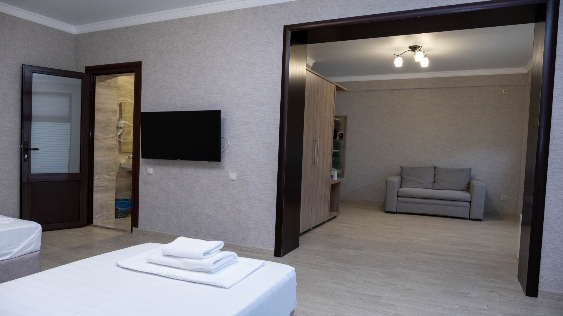 В номере: душ, туалет, ТВ, холодильник, кондиционер, фен, двуспальная или две раздельные кровати, диван