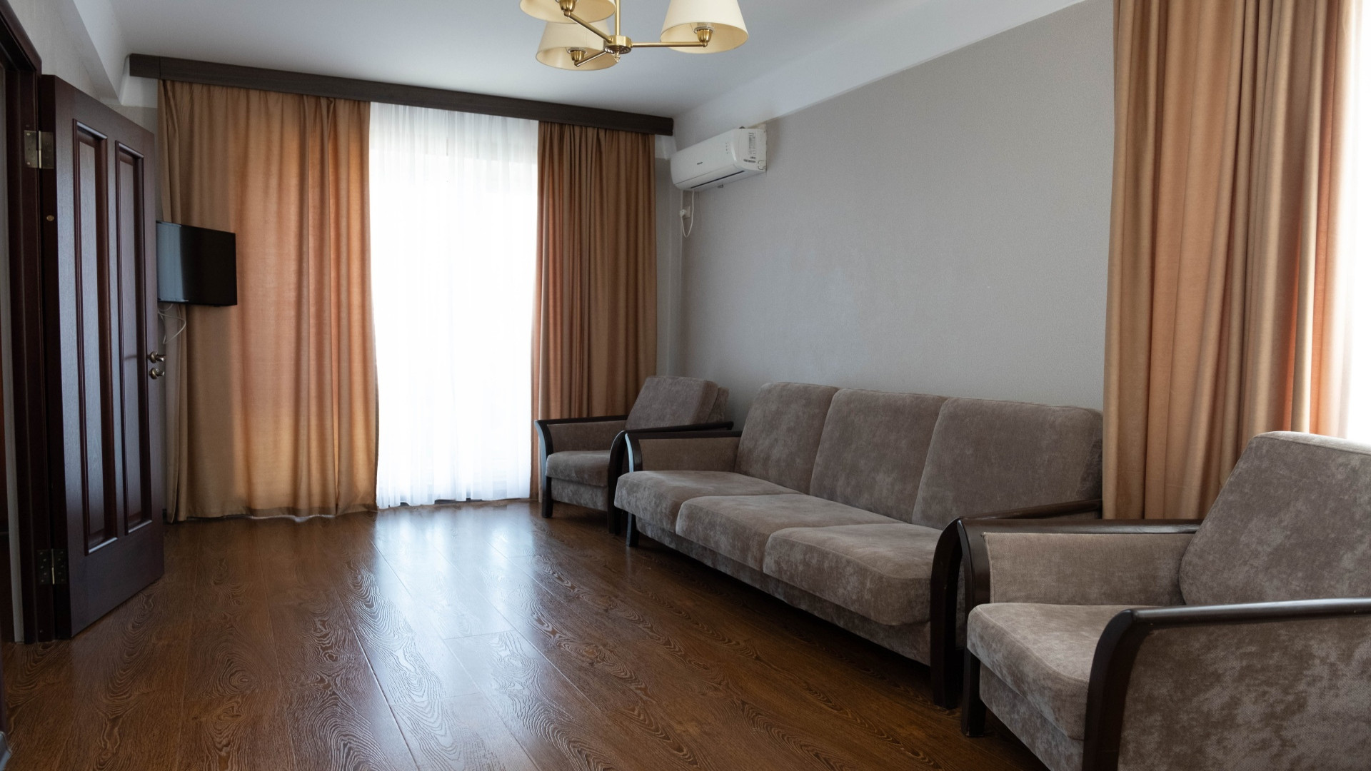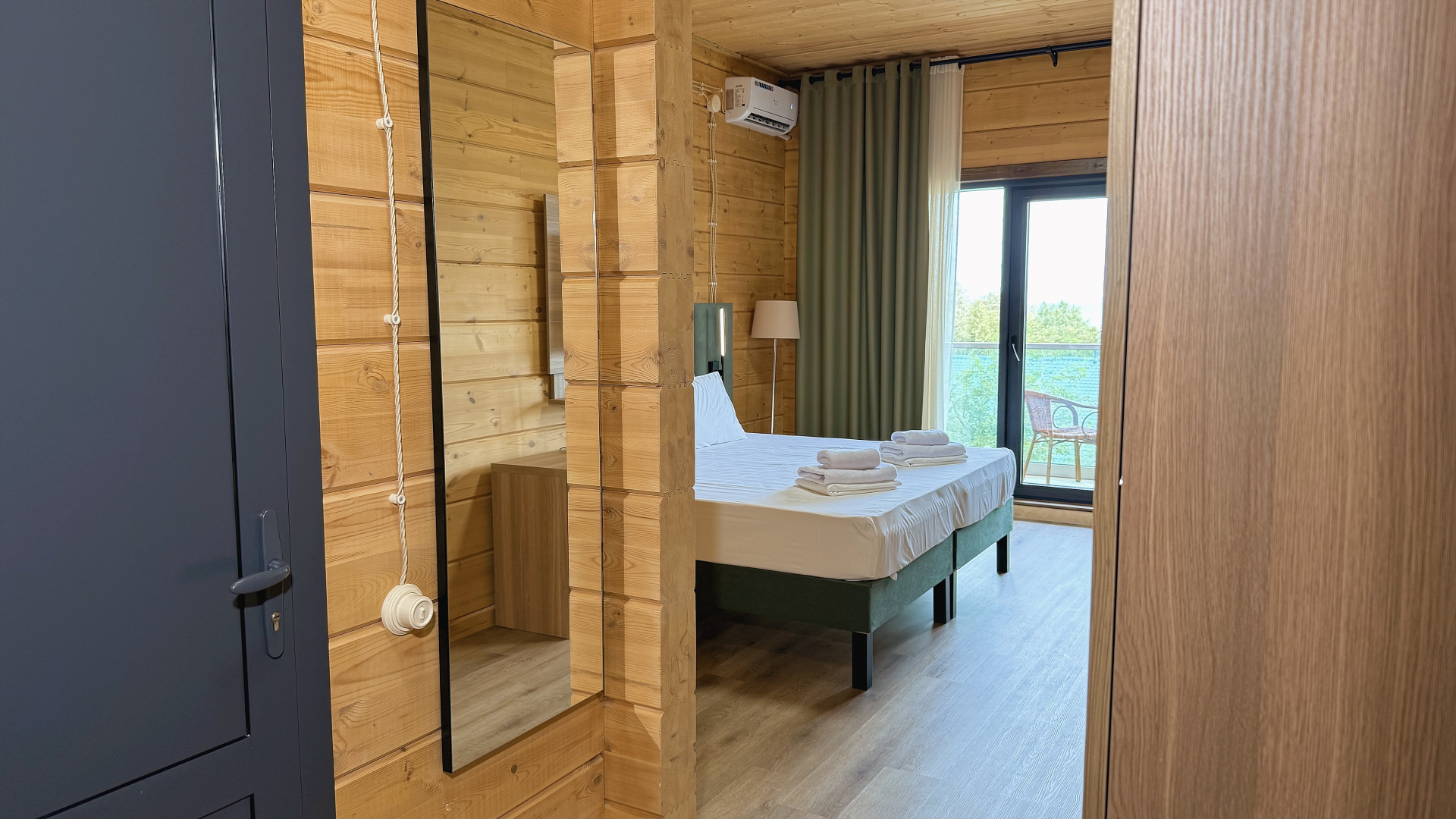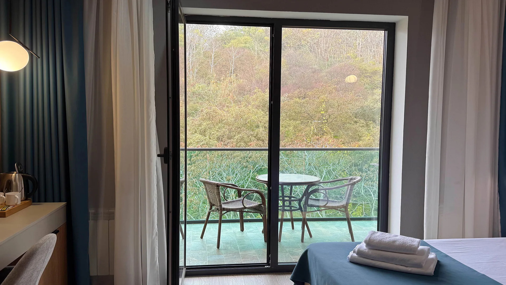 В номере: душ, туалет, ТВ, холодильник, кондиционер, фен, диван, балкон