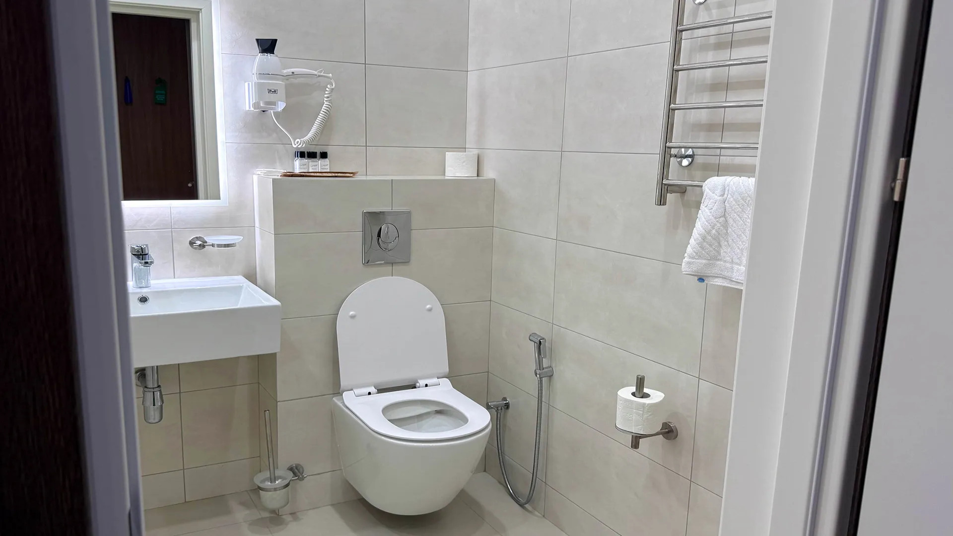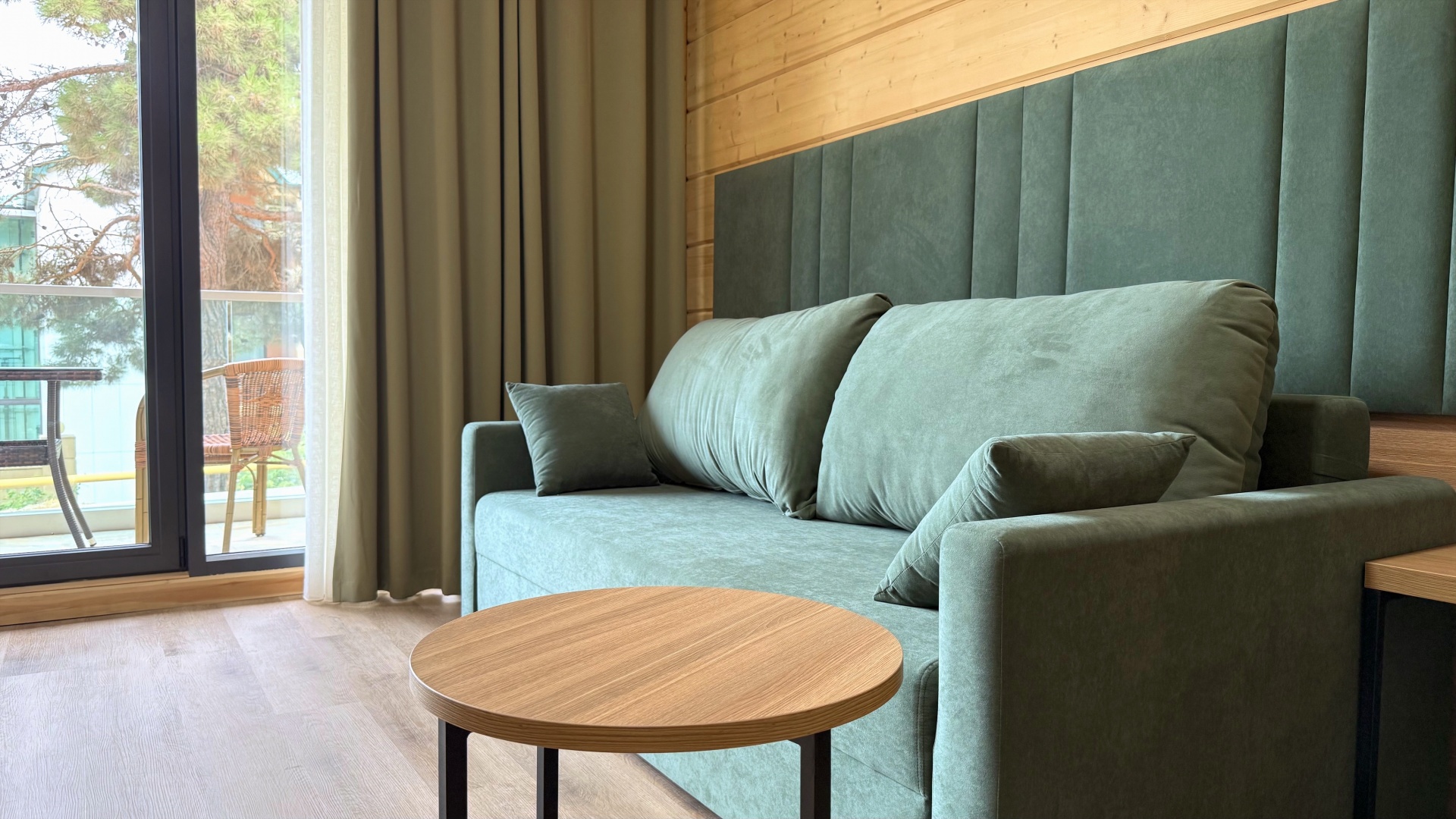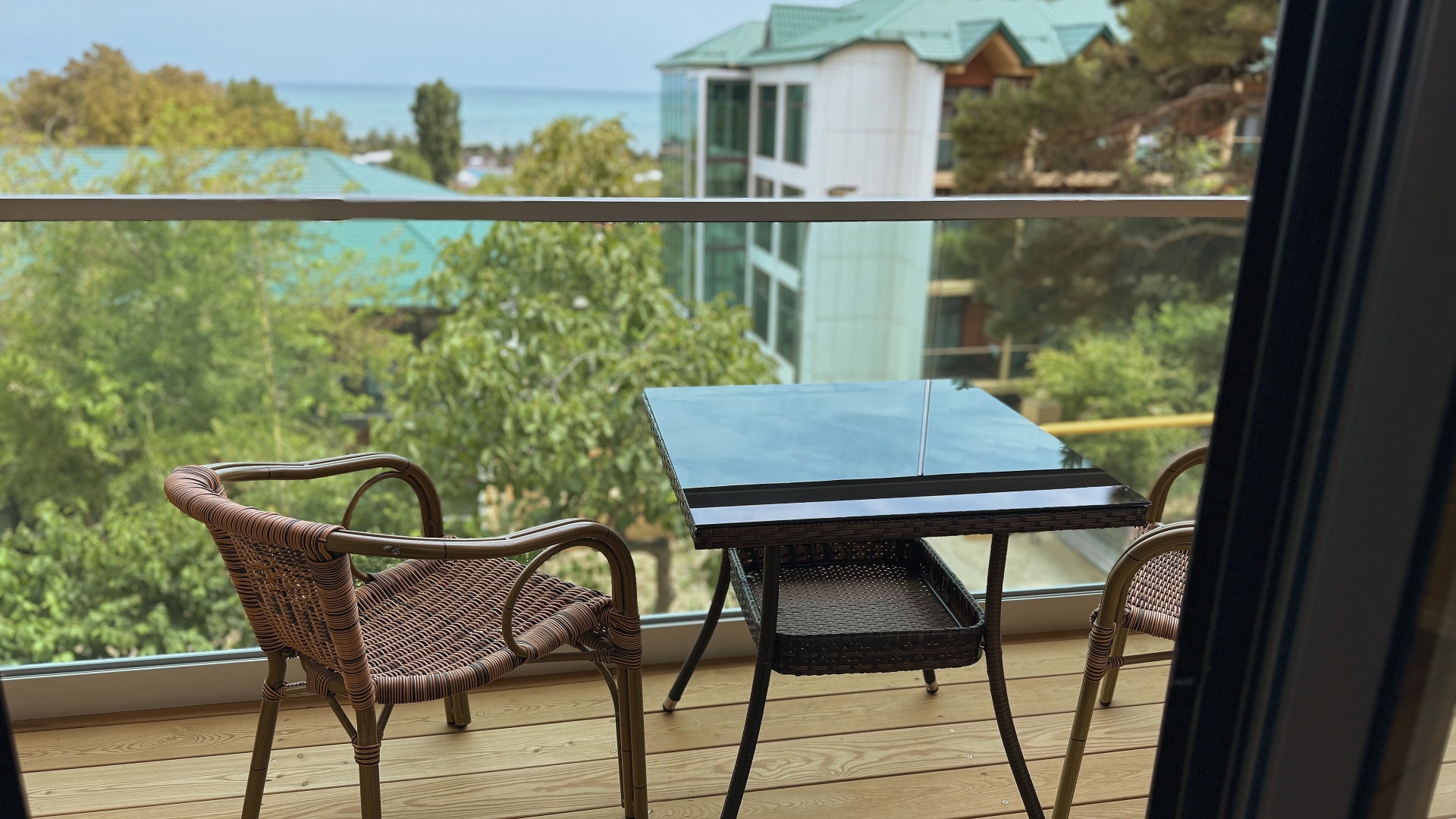 В номере: душ, туалет, ТВ, холодильник, кондиционер, фен, диван, балкон