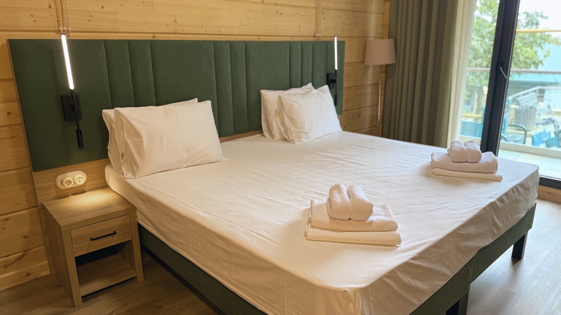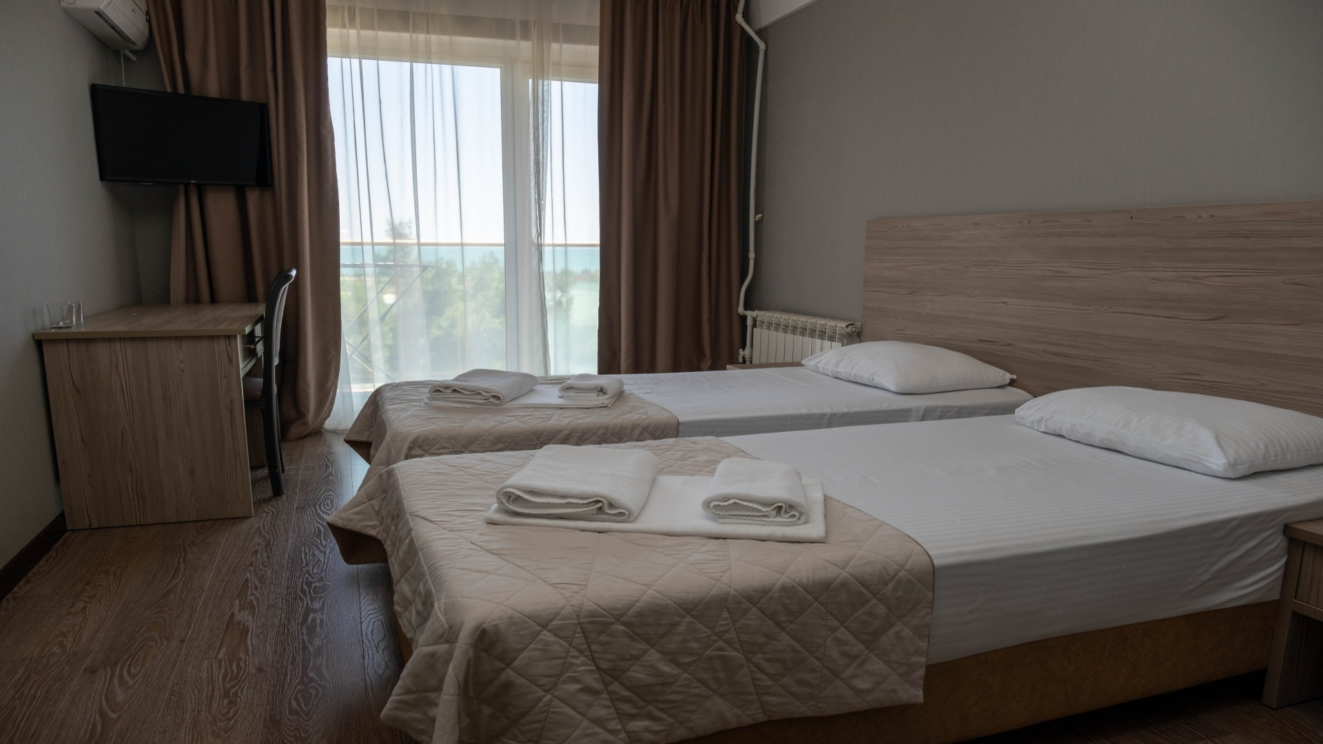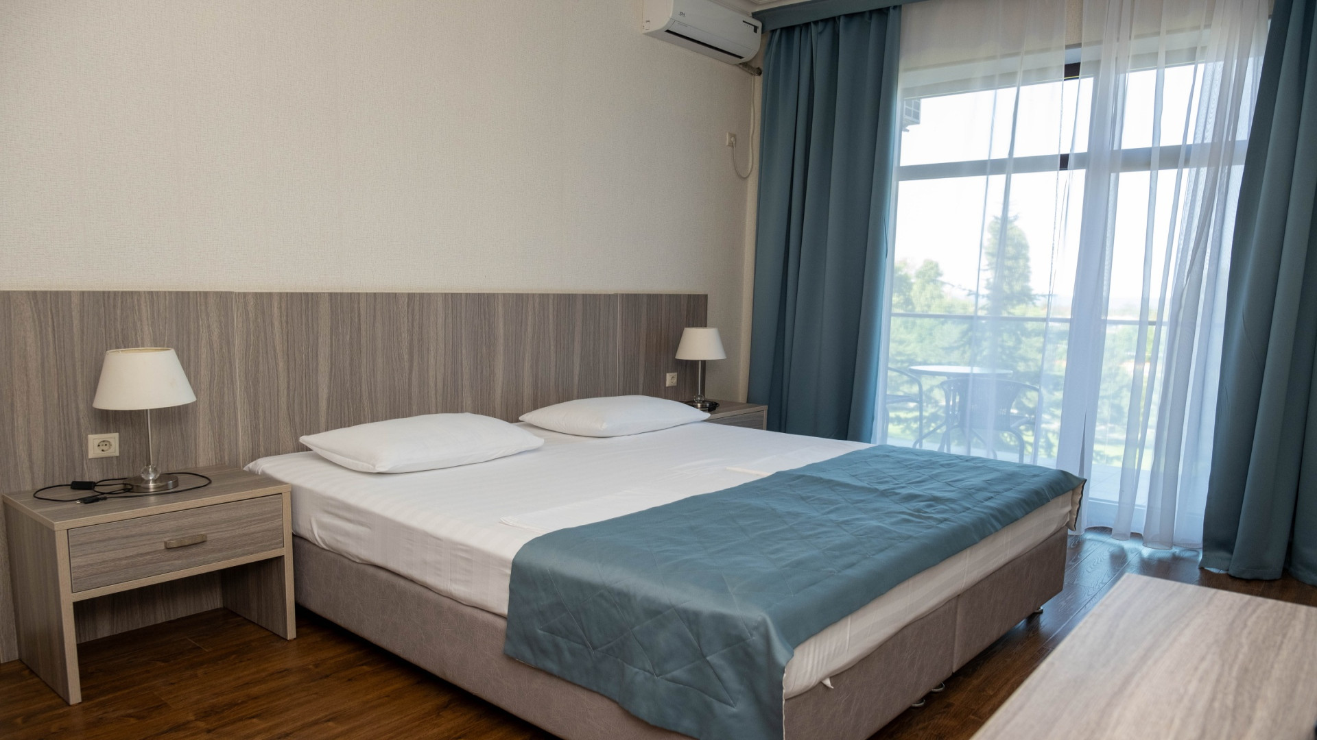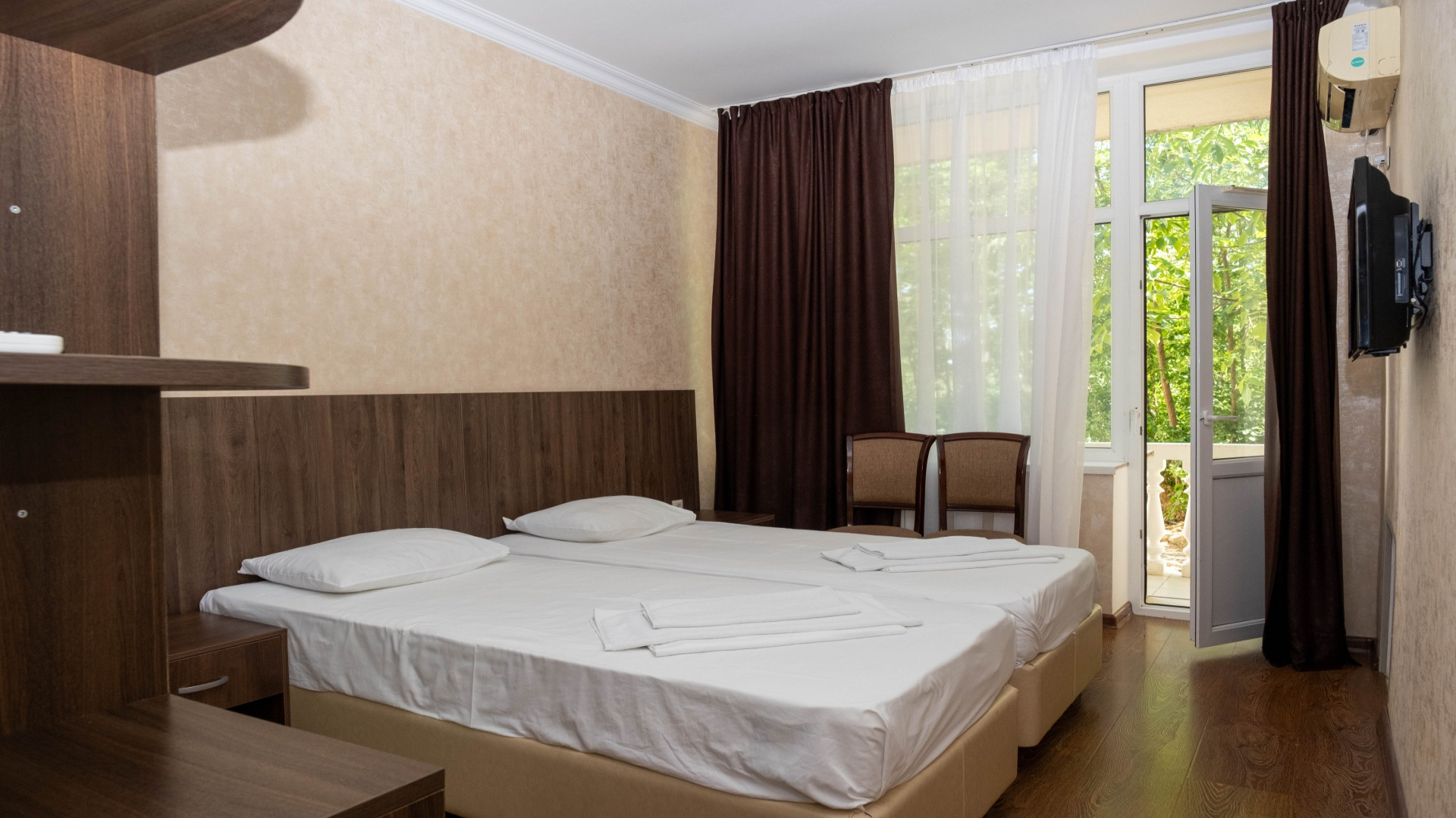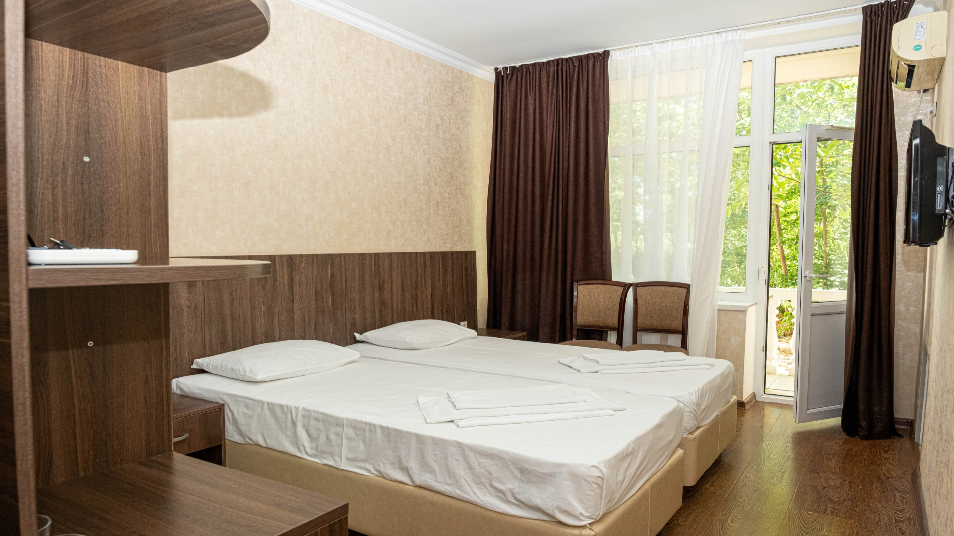 В номере: душ, туалет, ТВ, холодильник, кондиционер, фен, двуспальная или две раздельные кровати, балкон