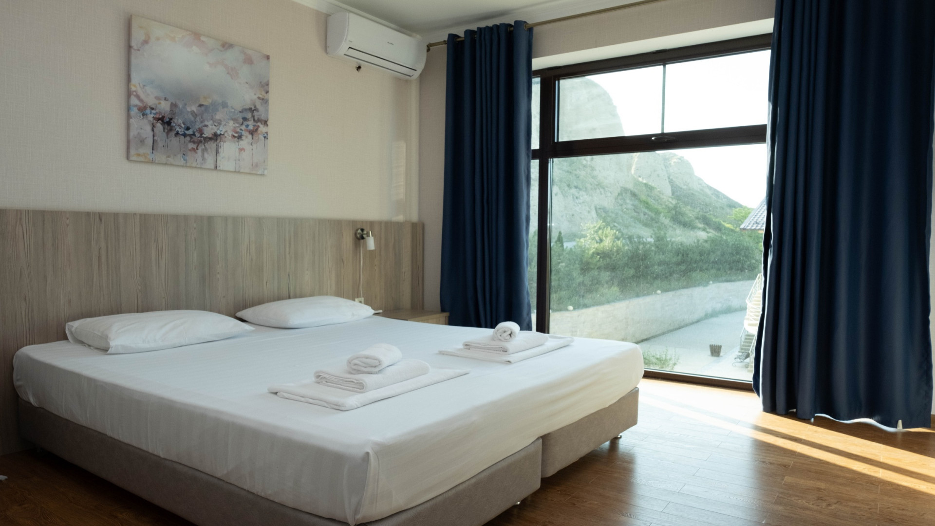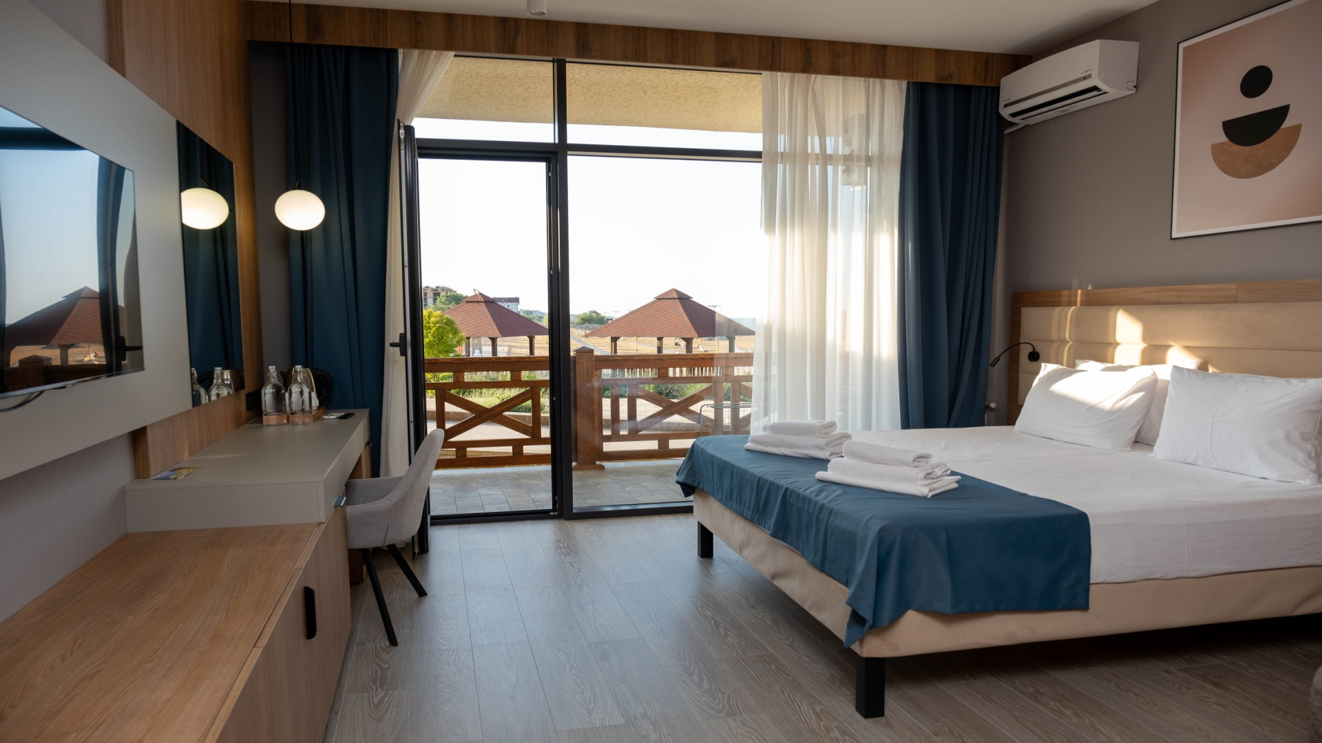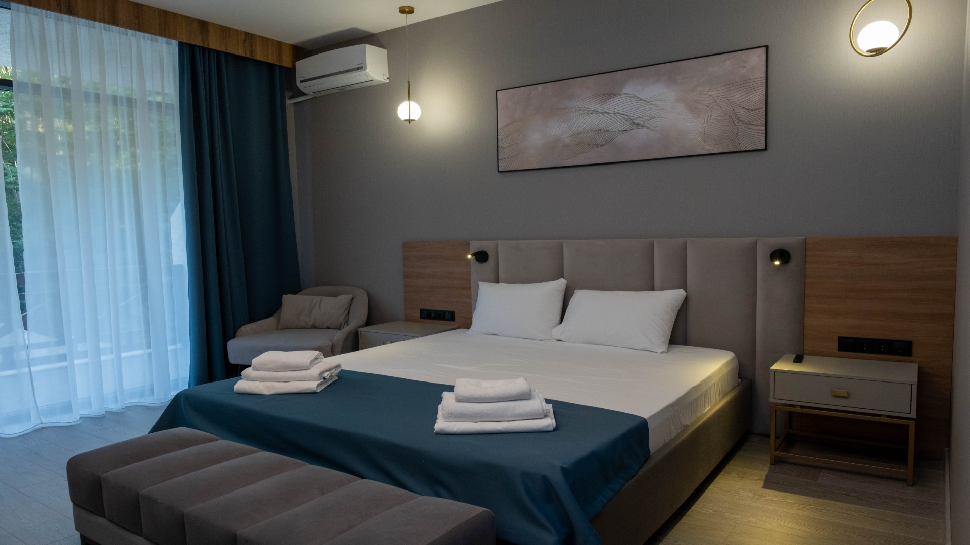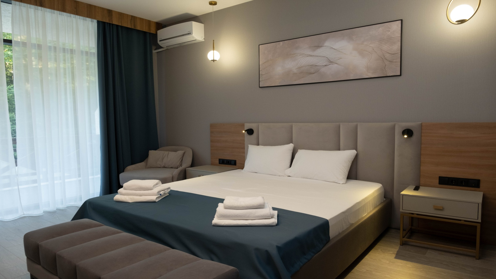В номере: душ, туалет, ТВ, холодильник, кондиционер, сейф, фен, двуспальная кровать, диван, балкон
