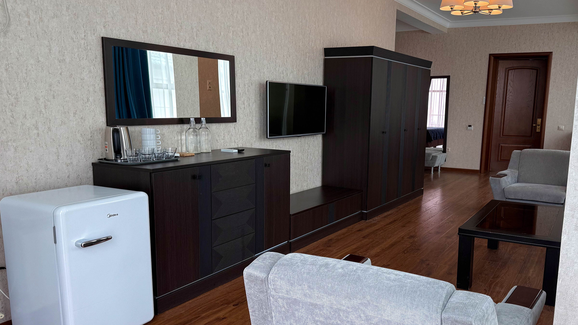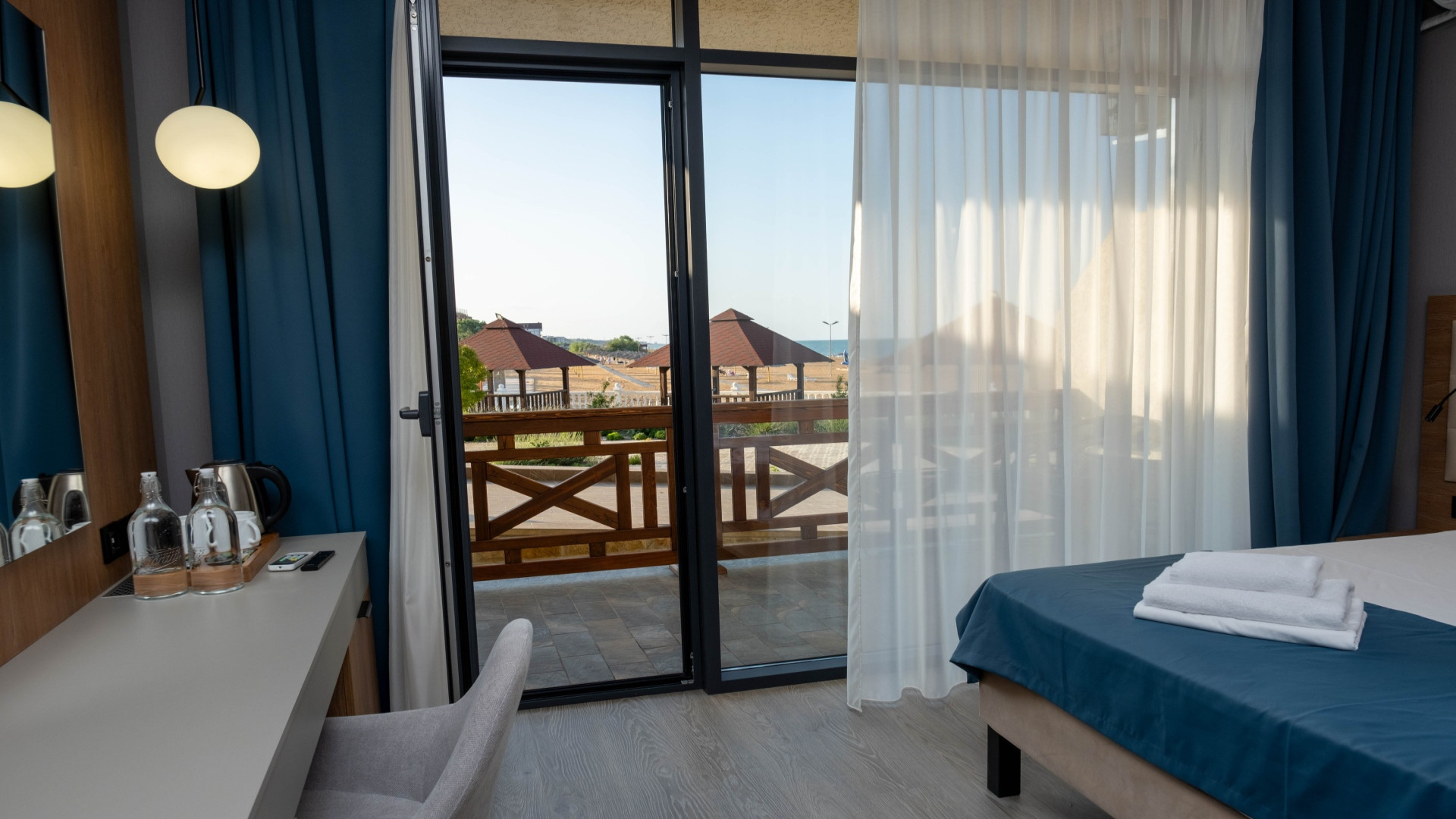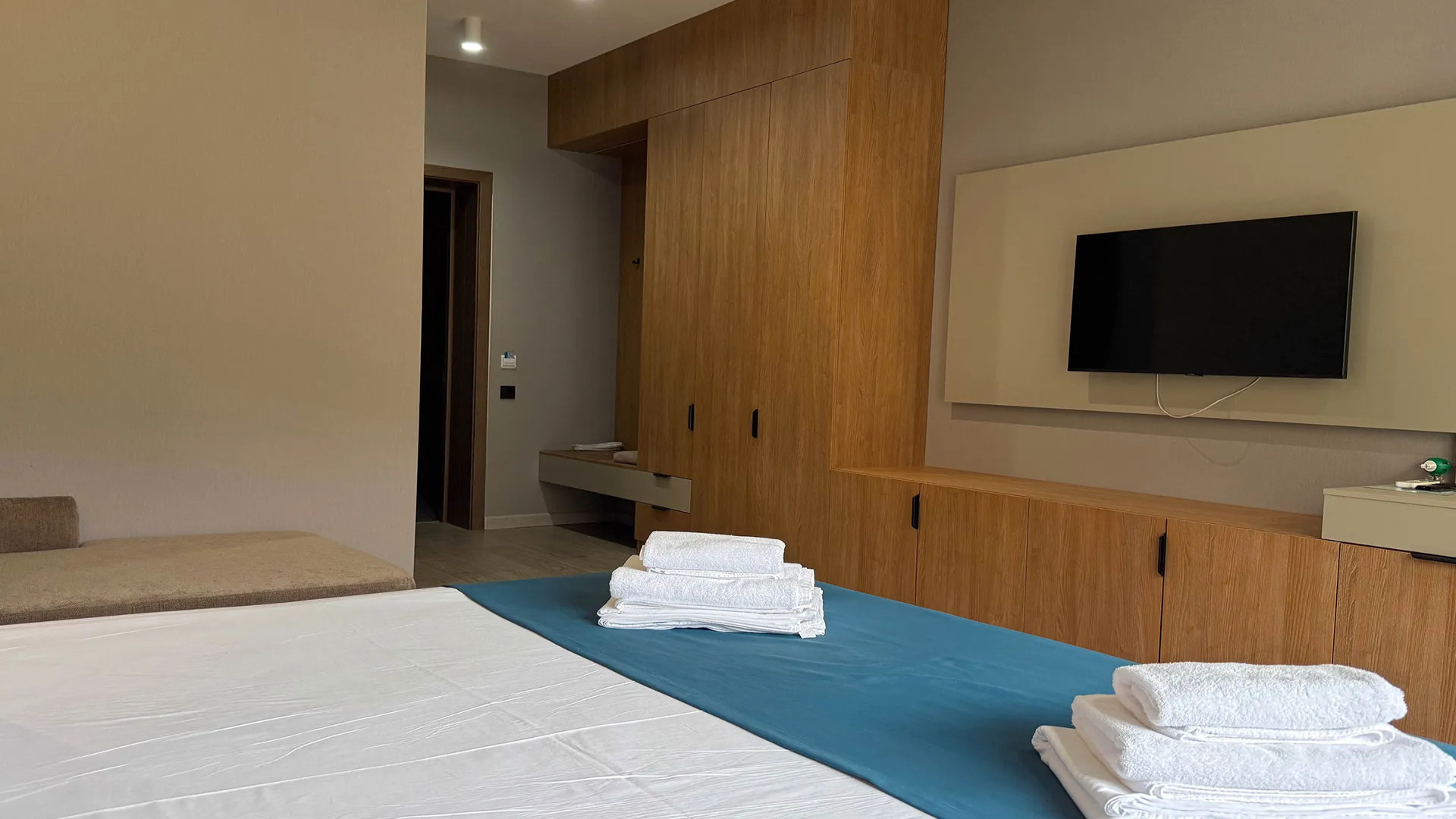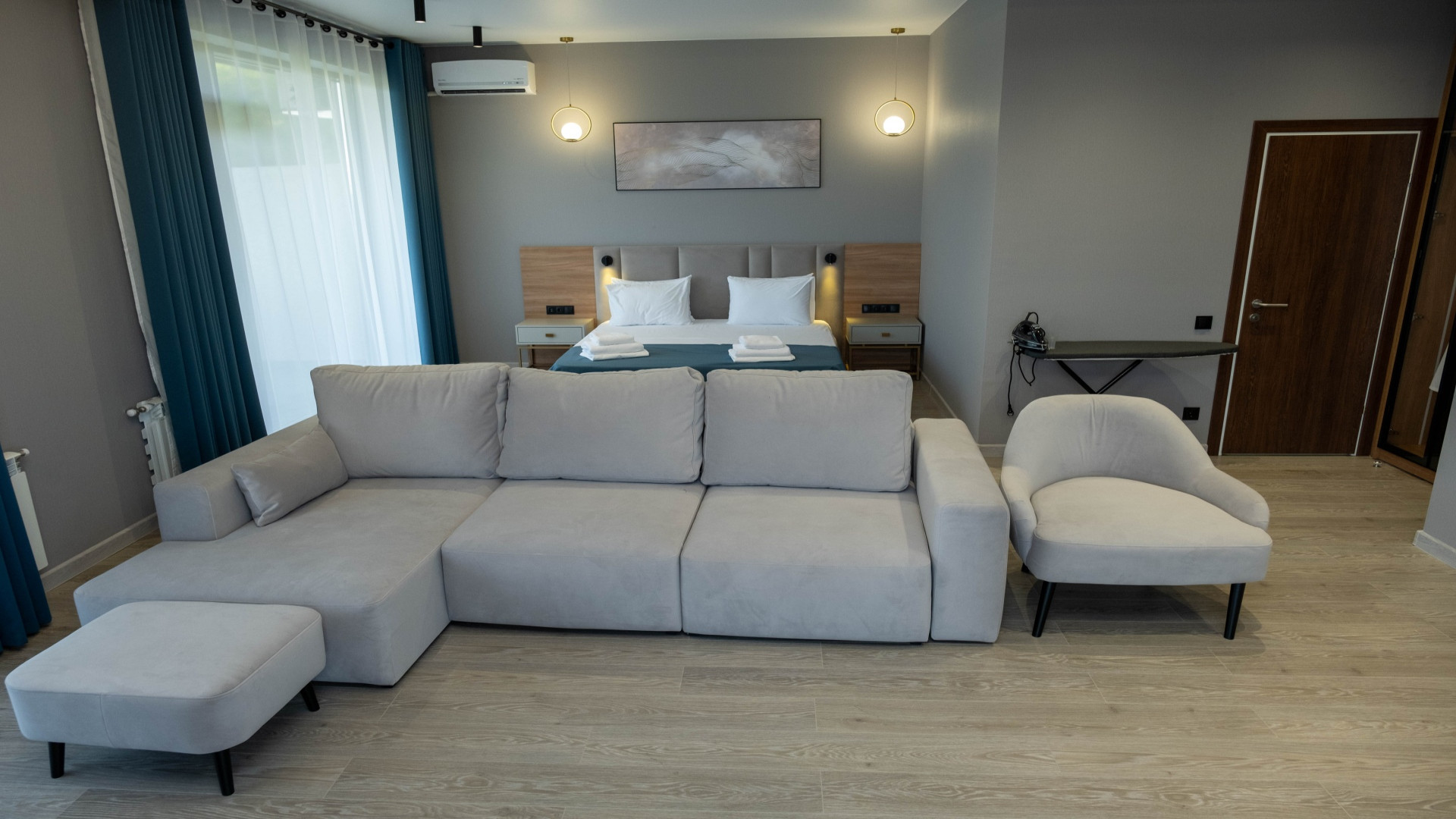 В номере: душ, туалет, ТВ, холодильник, кондиционер, сейф, фен, двуспальная кровать, диван, балкон