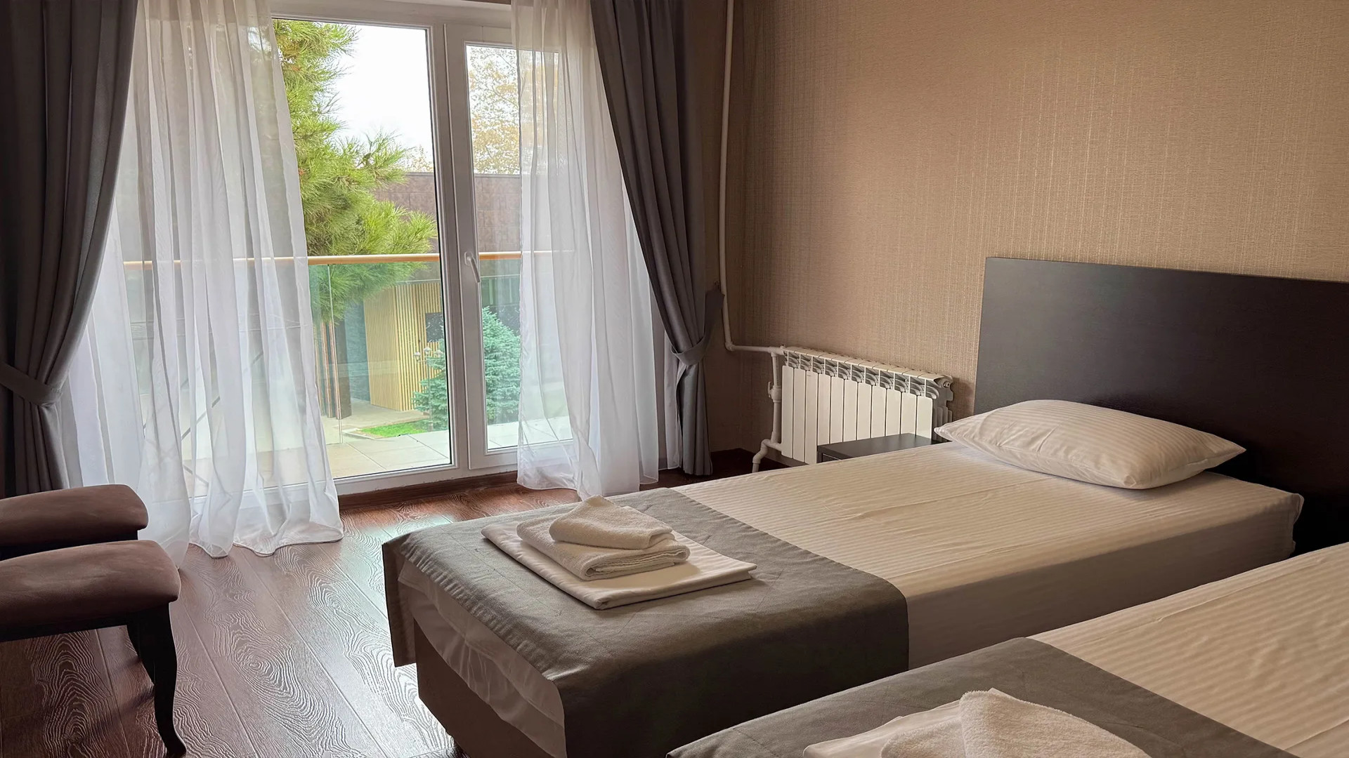 В номере: душ, туалет, ТВ, холодильник, кондиционер, двуспальная или две раздельные кровати, балкон