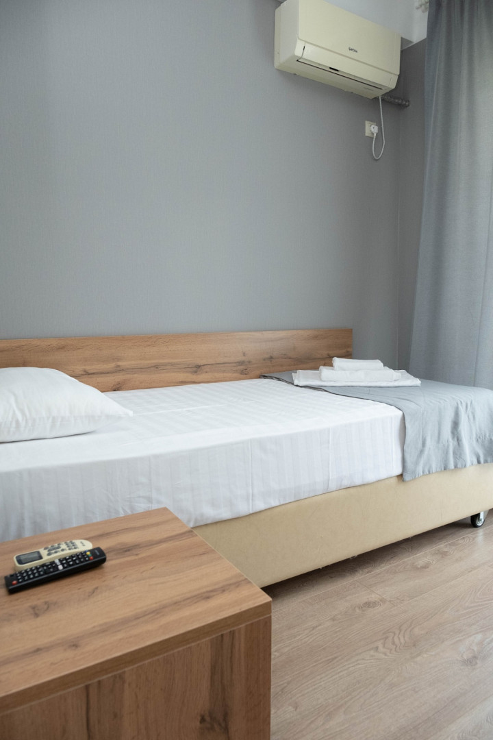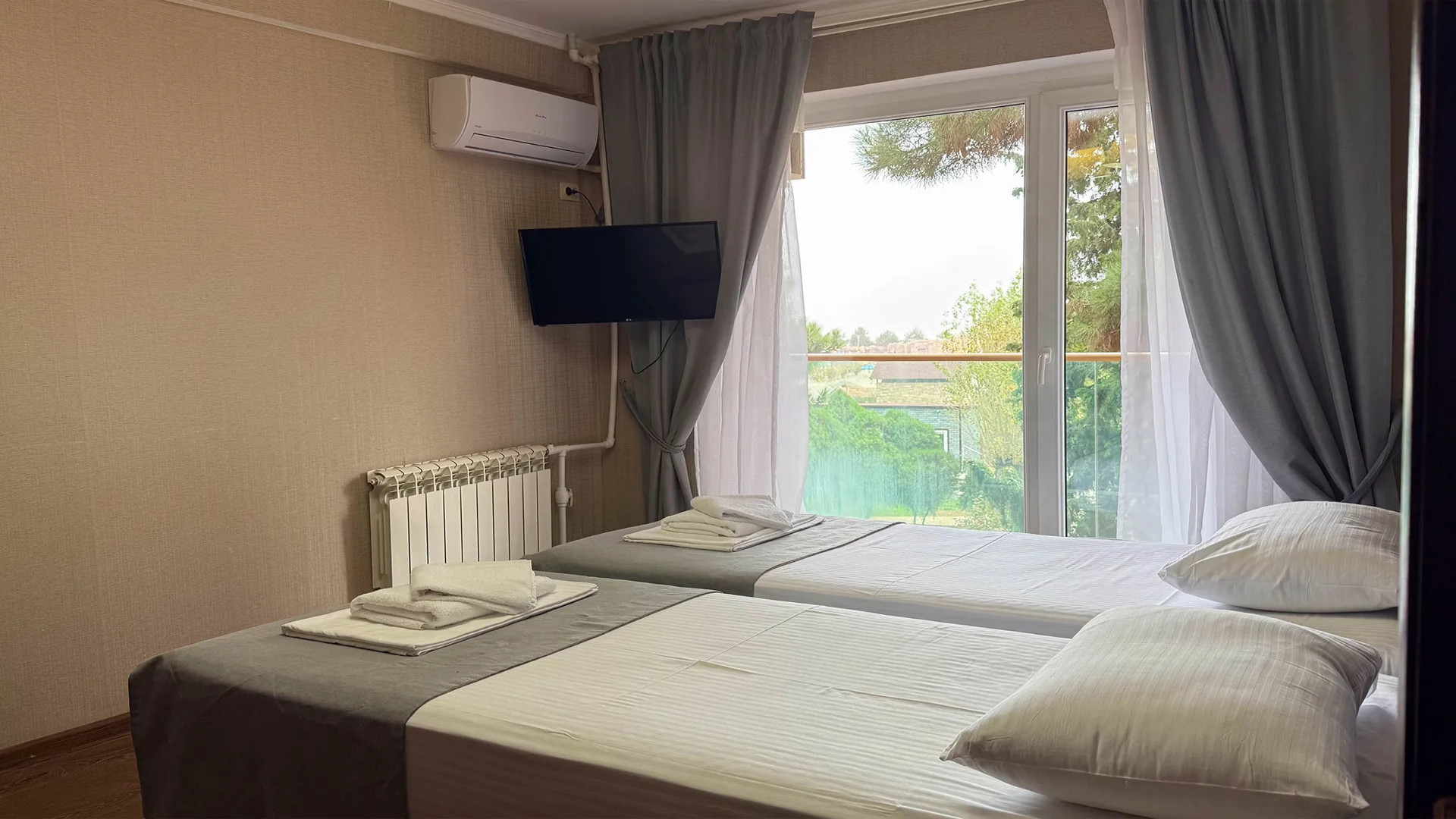 В номере: душ, туалет, ТВ, холодильник, кондиционер, фен, односпальная кровать, балкон